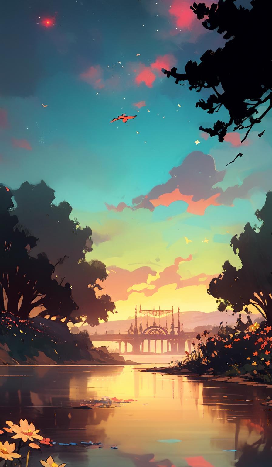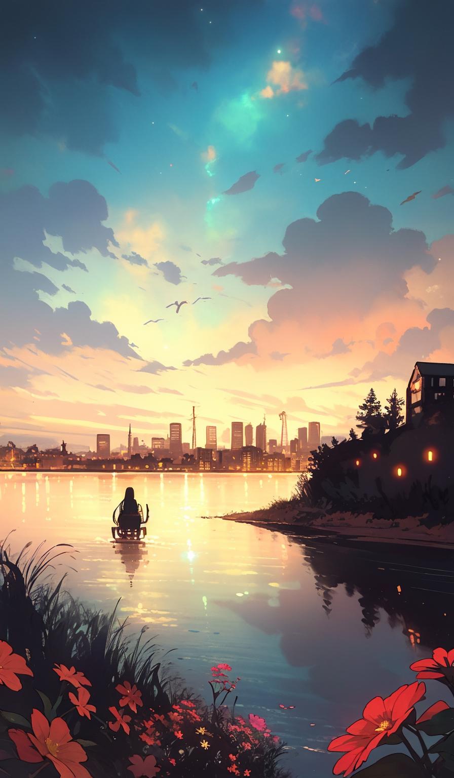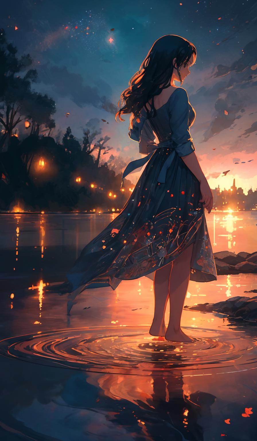 This model can generate a strange landscape, with women wearing sequins wading through shallow water, and shrubs under a backlighting rain, with a far-off city shining in the silence.