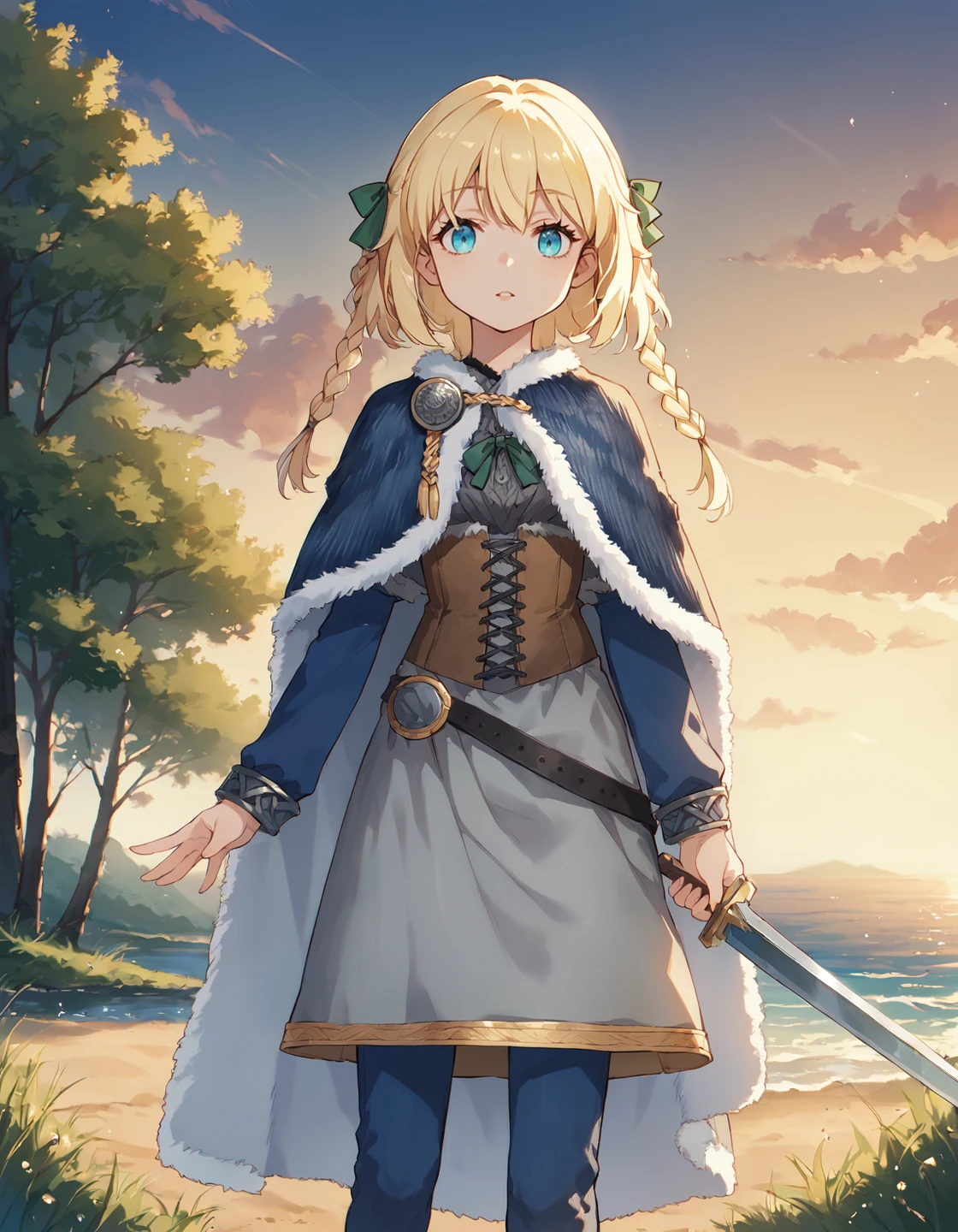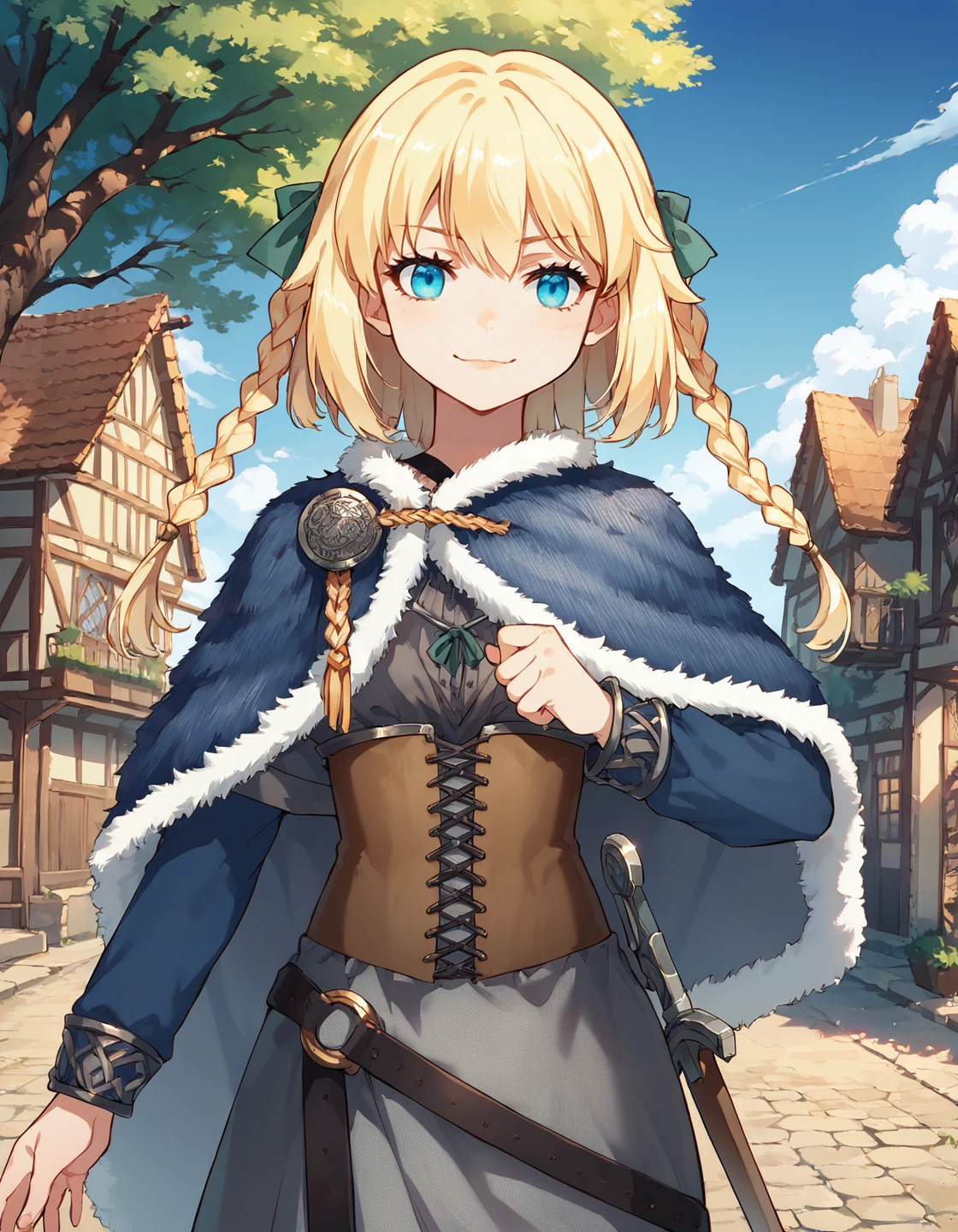 mgrcolga, blonde hair, twin braids, blue eyes, green bowties, blue with white fur cloak, grey top with golden edgings, long blue sleeves, chainmail, brown corset, black belt