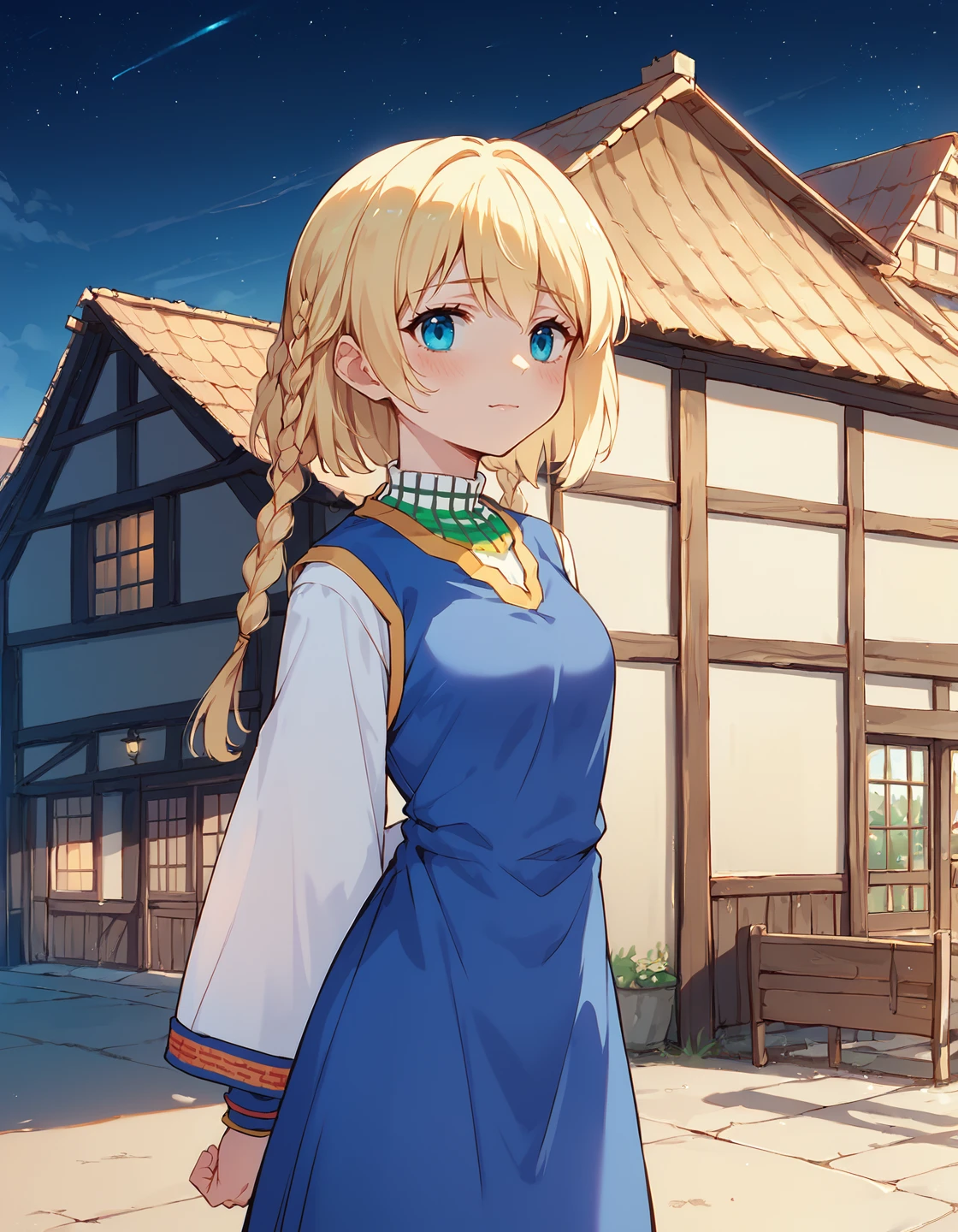 mgrcolga, blonde hair, twin braids, blue eyes, white with blue shirt, white with green collar, long wide sleeves, blue with yellow dress