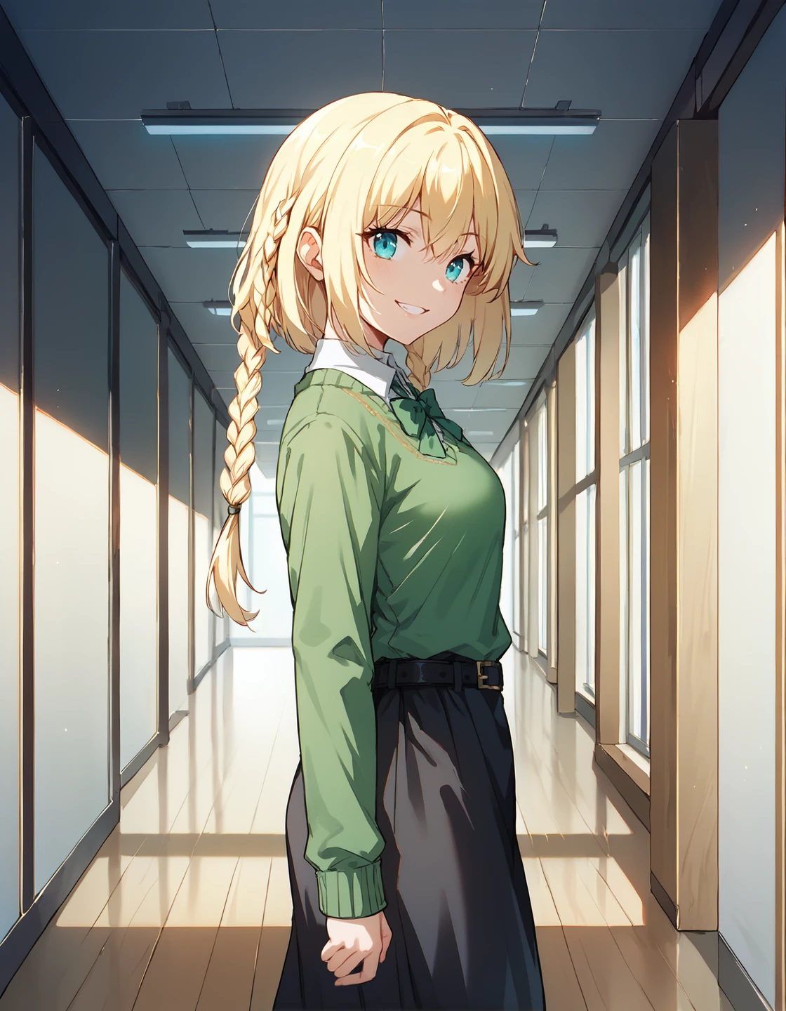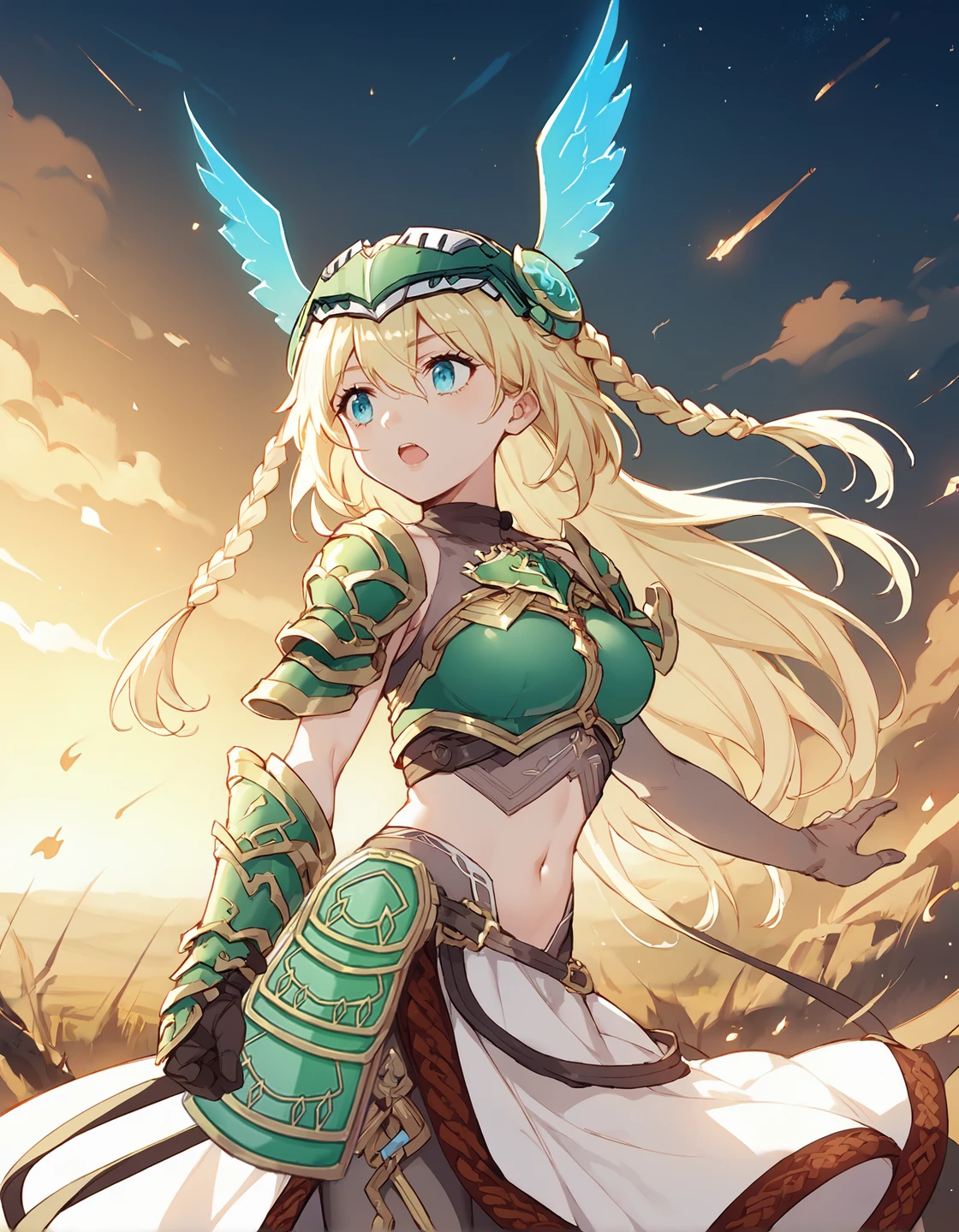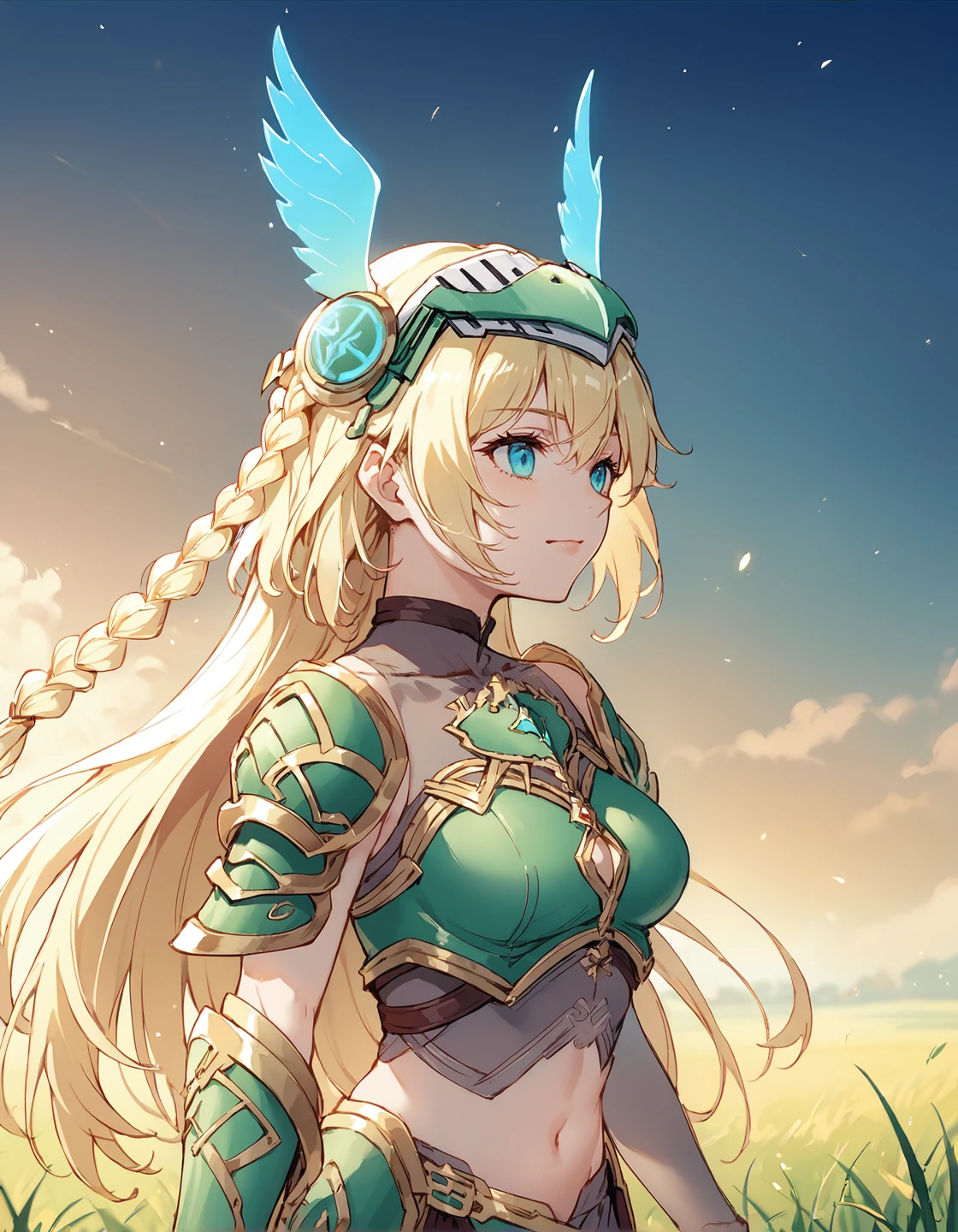 mgrcolga, blonde hair, twin braids, blue eyes, green helmet with wings, grey top with single sleeve, green with yellow pauldrons, green with yellow breastplate, single green with yellow gauntlet, green with yellow faulds, grey pants, grey belt, white with brown skirt