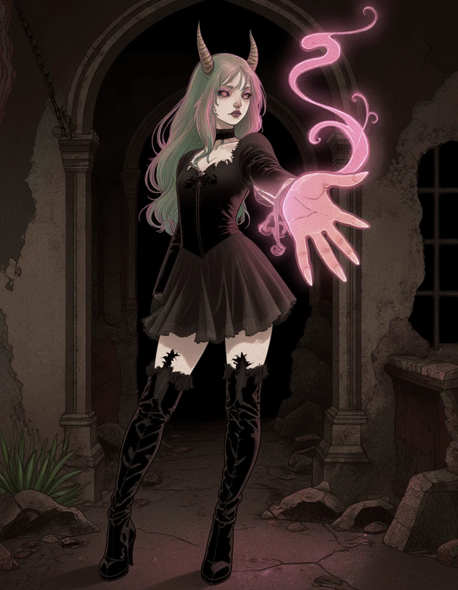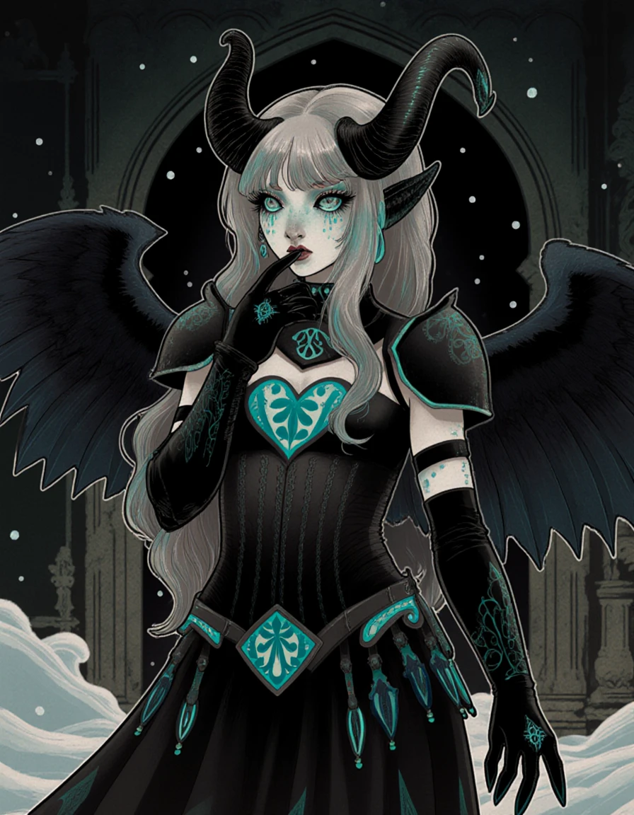 A mix of elegence and horror. The final version of this model has been fully developed and is available on Mage.Space as the concept Velvet & Shadow concept.