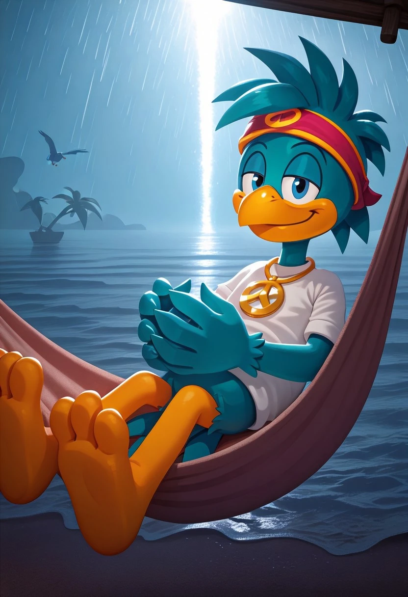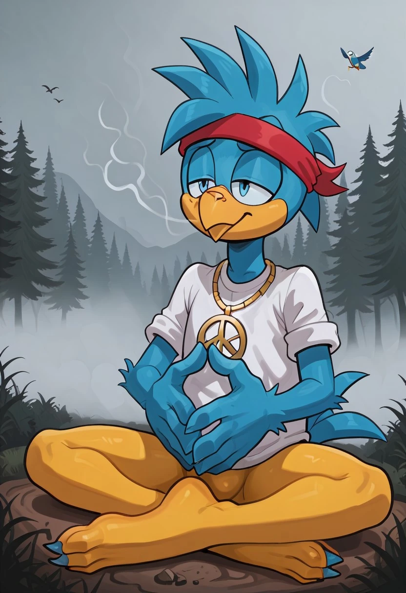 Guru Emu, bird, dark teal fur, blue eyes, yellow beak, teal feathers, yellow and red headband, yellow legs and feet, teal claws, white shirt, gold peace symbol necklace