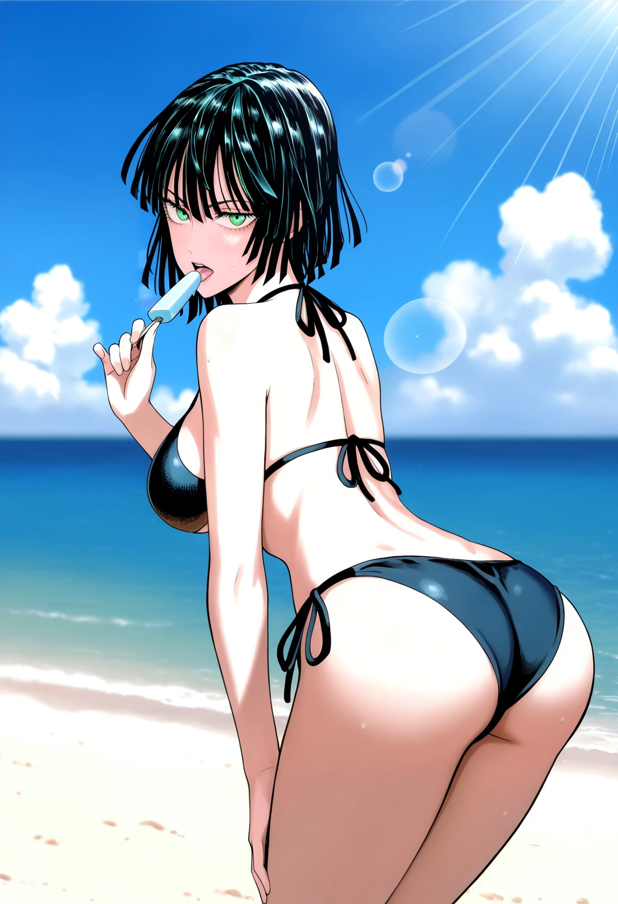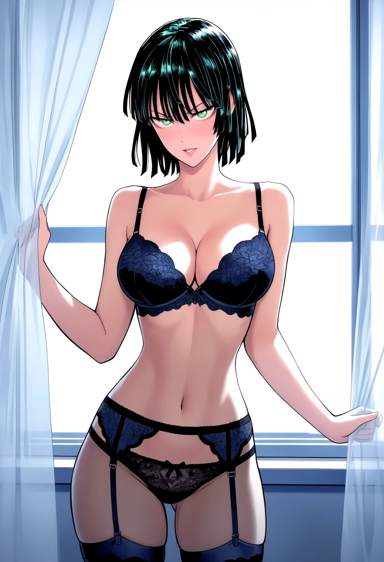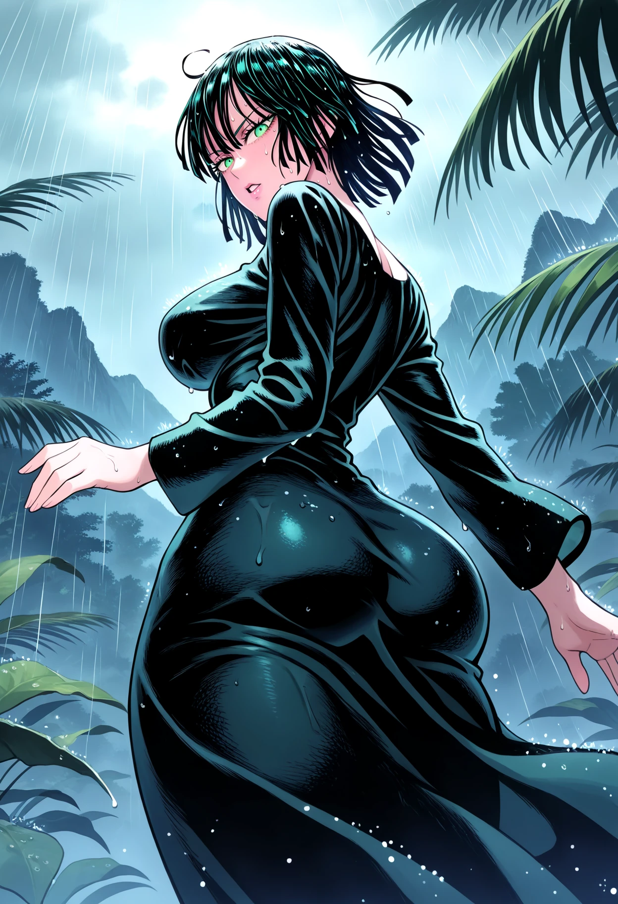 Basic prompts : 1girl, fubuki \(one-punch man\), black hair, short hair, green eyes, large breasts
