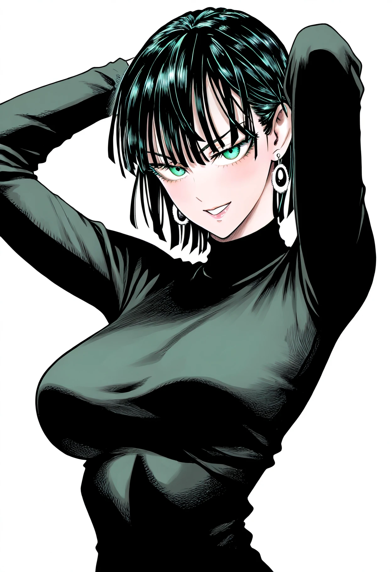 1girl, fubuki \(one-punch man\), black hair, short hair, green eyes, large breasts