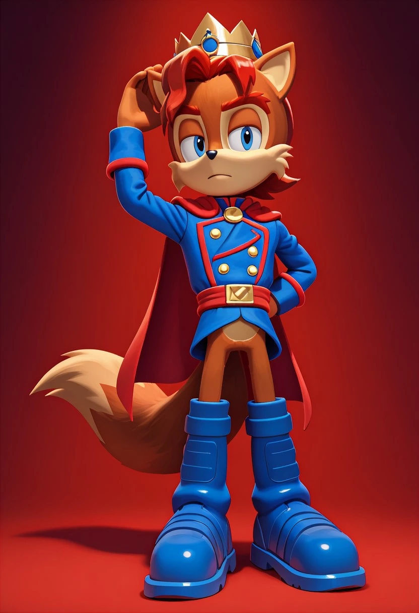 Elias Acorn, squirrel, brown fur, red hair, blue eyes, brown tail, crown, blue royal uniform, red trim, yellow pauldrons, red cape, red shoes, holding sword