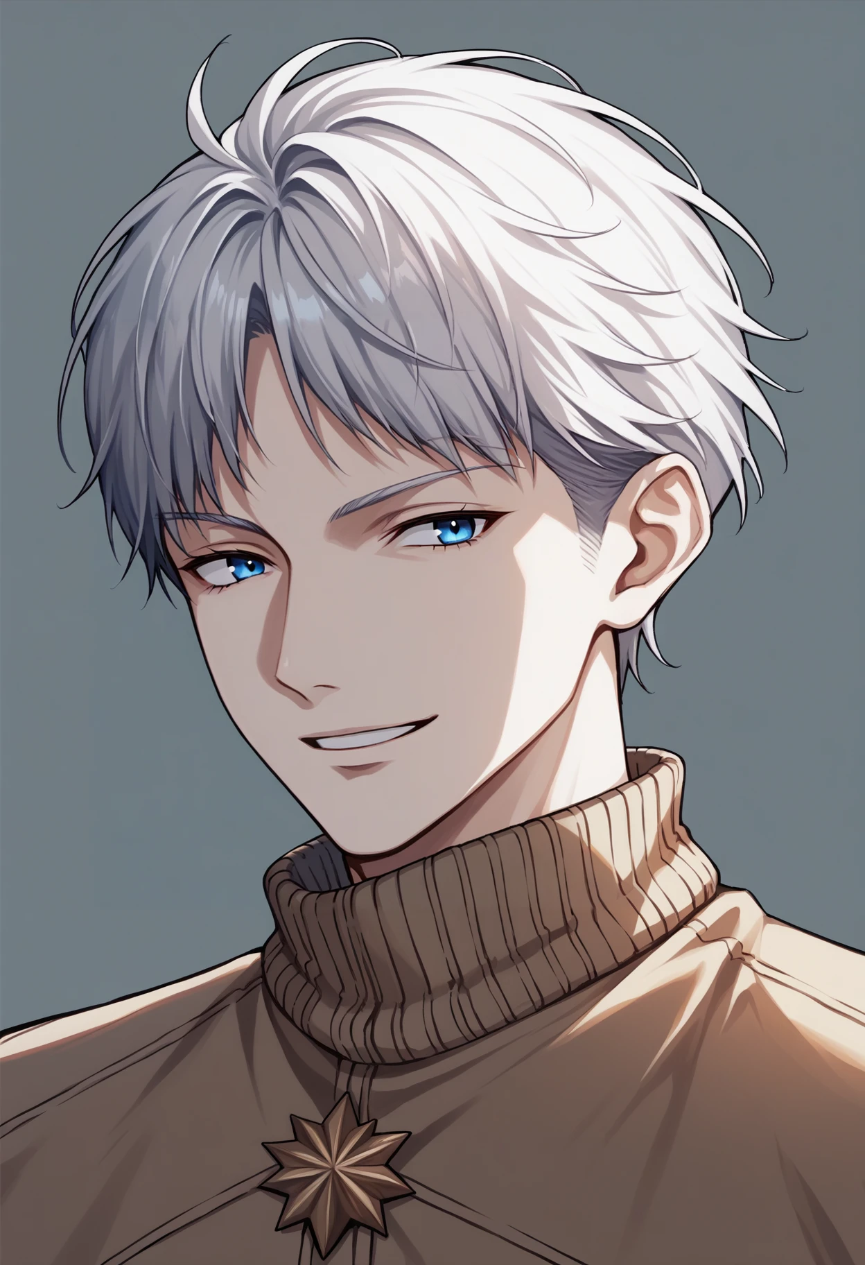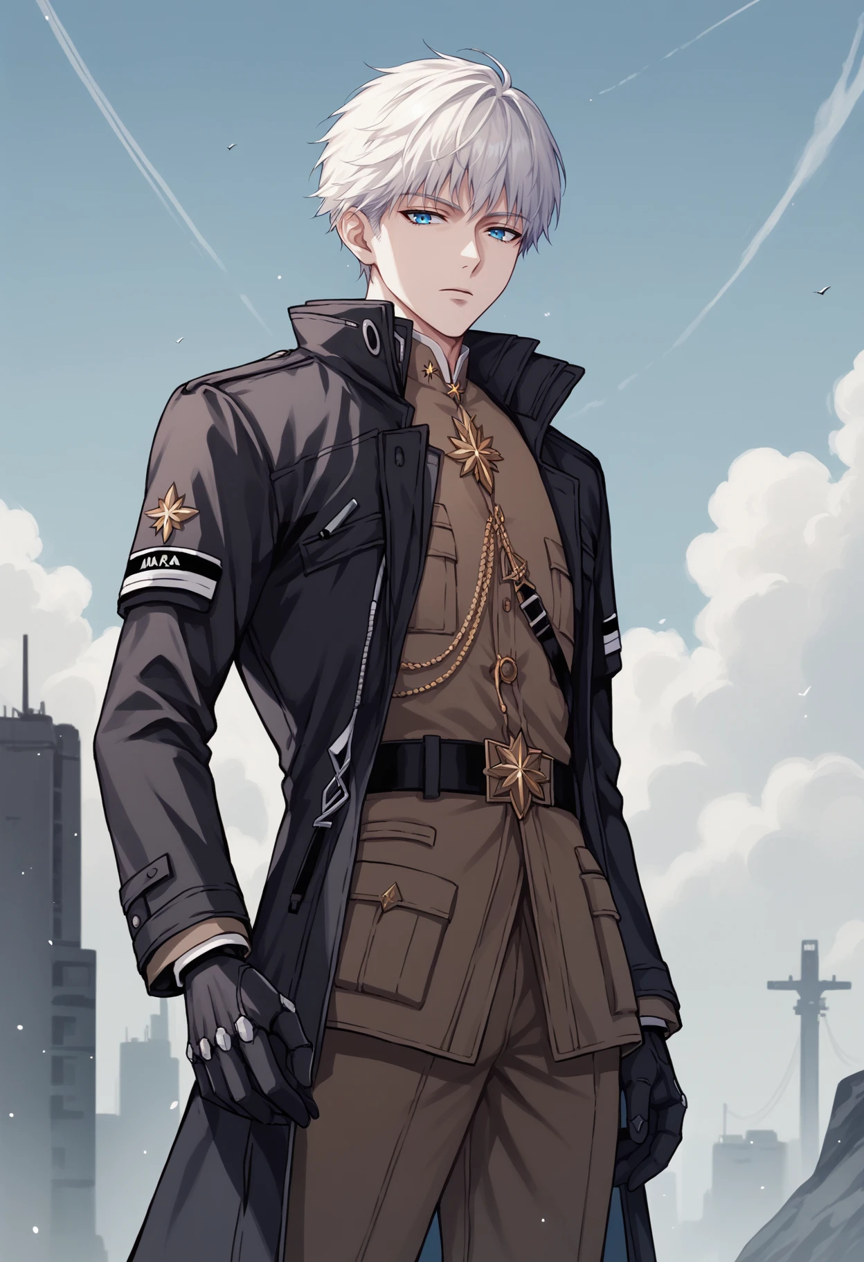 johan, blue eyes, white hair, short hair, necklace, black coat, military uniform, brown pants, belt, black gloves