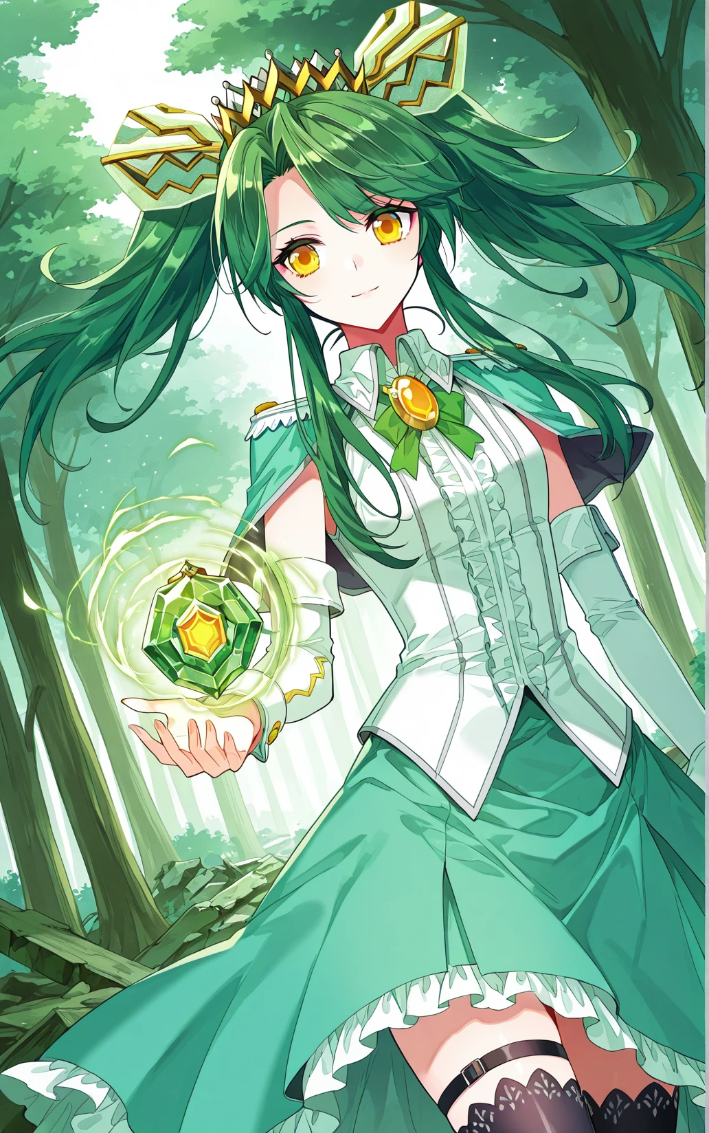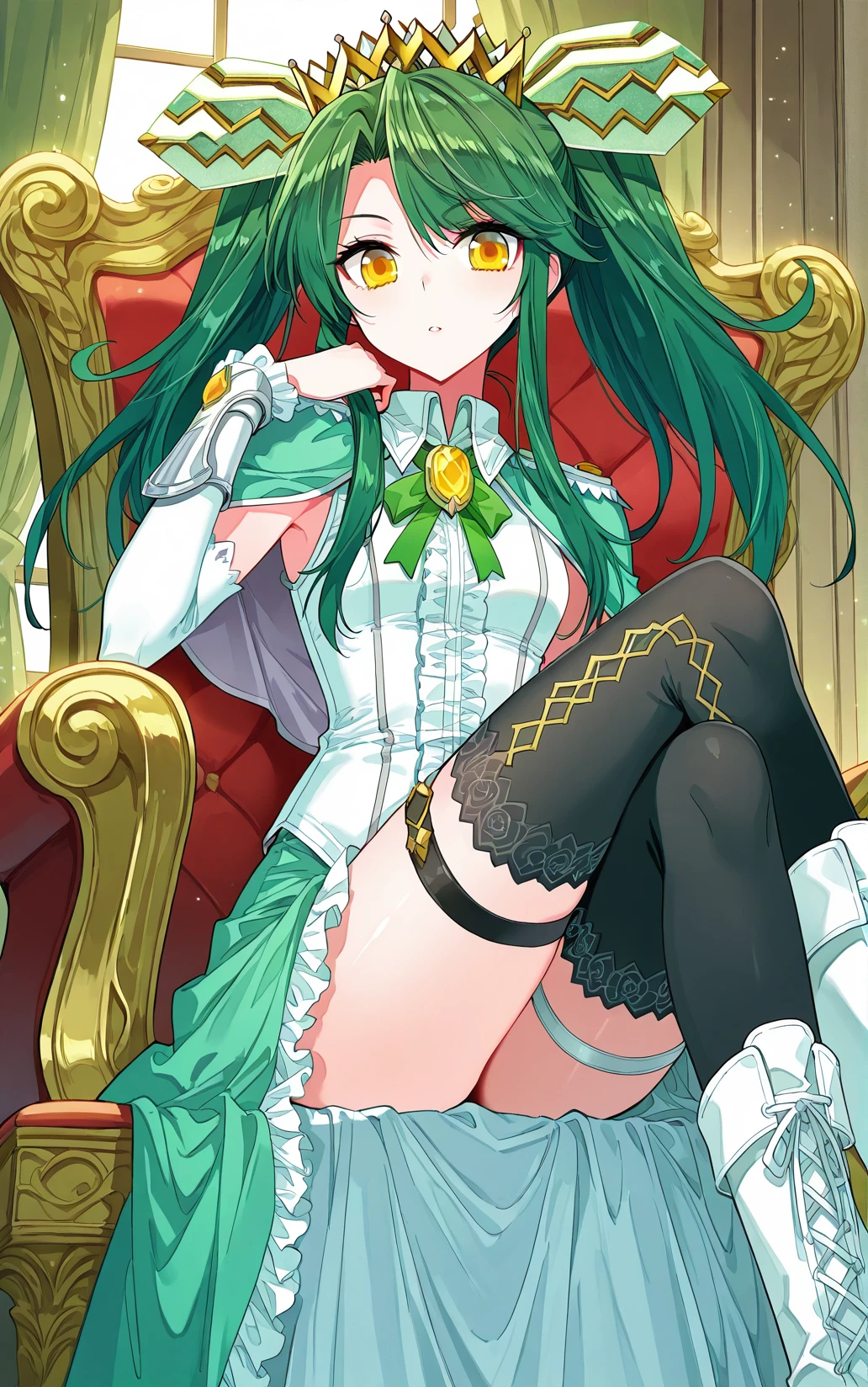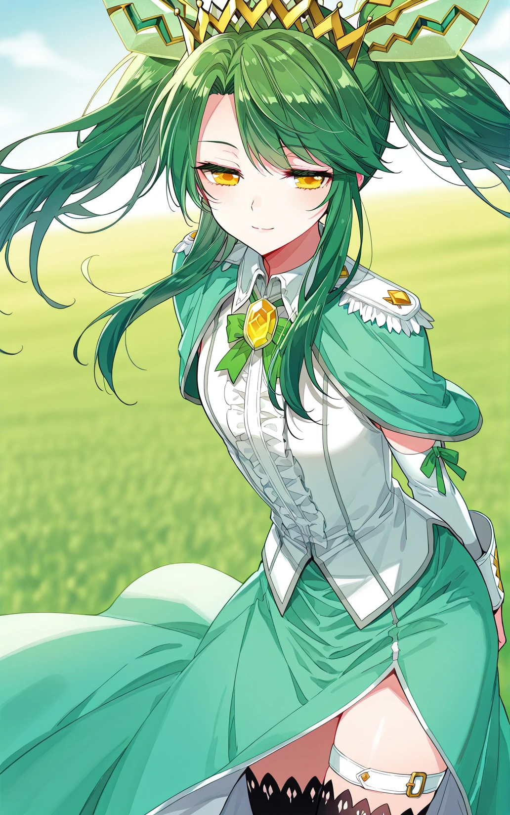 Bing, 1 girl, solo, yellow eyes, long hair, green hair, parted bangs, side bangs, layered hair, twin tails, hair ornament, crown, golden crown,