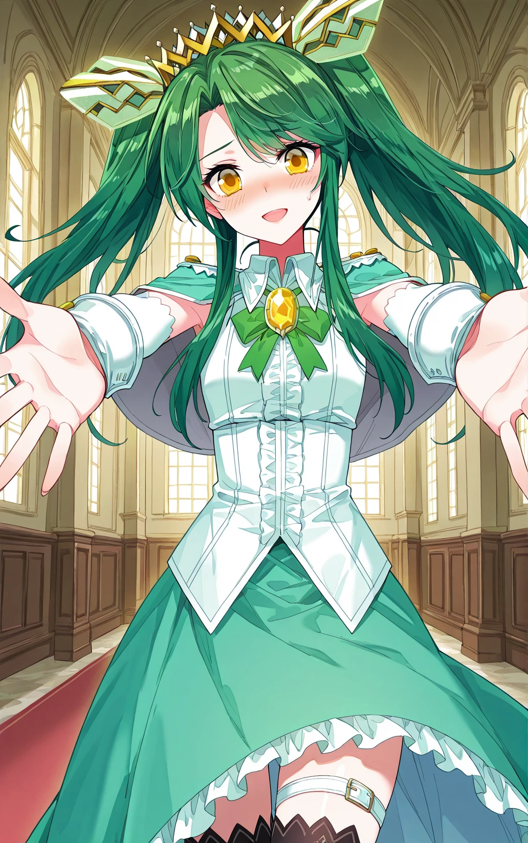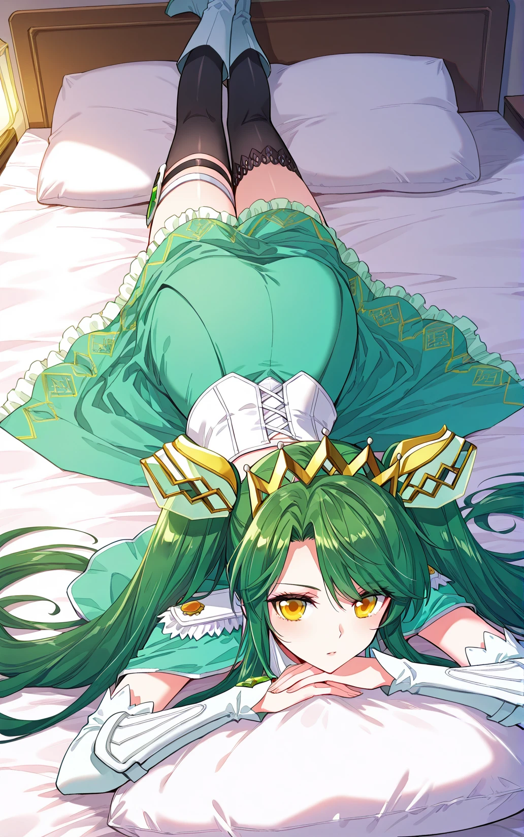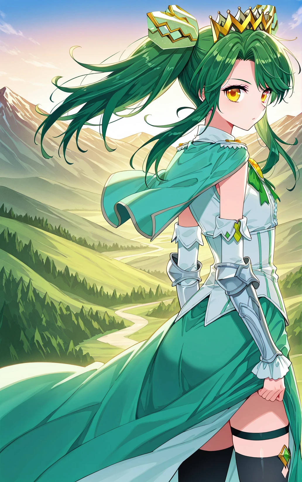 Bing, 1 girl, solo, yellow eyes, long hair, green hair, parted bangs, side bangs, layered hair, twin tails, hair ornament, crown, golden crown,