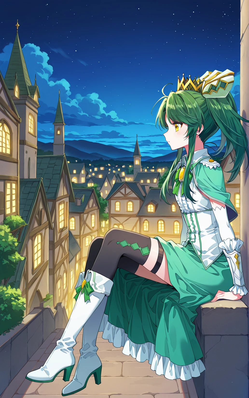 Bing_outfit, white corset top, frilled front, green skirt overlay, long skirt, detached green back drape, mini shoulder cape, green shoulder cape, green chest ribbon, decorative gem brooch,black thigh-highs, patterned thigh-highs, thigh straps, ornamental bracers, segmented white cuffs, elbow-length decorative armguards, high heel boots,