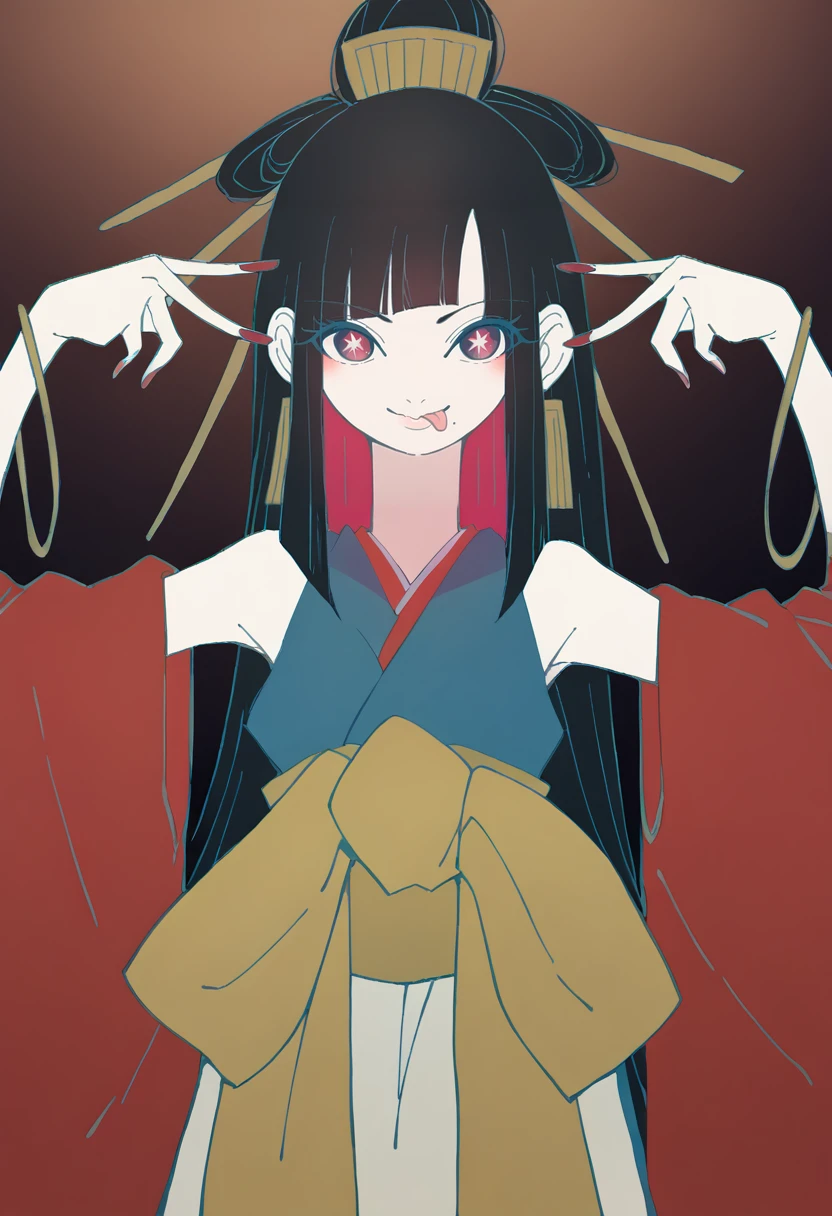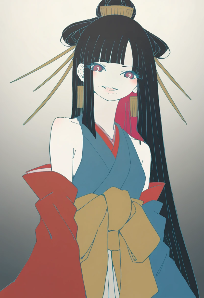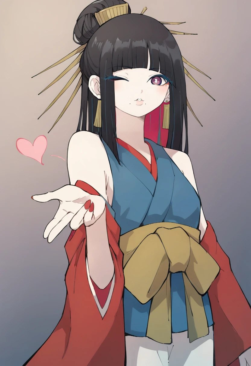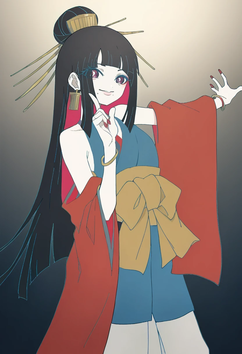 hyururirapappa, long hair, black hair, multicolored hair, colored inner hair, bangs, hime cut, single hair bun, blunt bangs, hair ornament, hair stick, purple eyes, mole under mouth, earrings