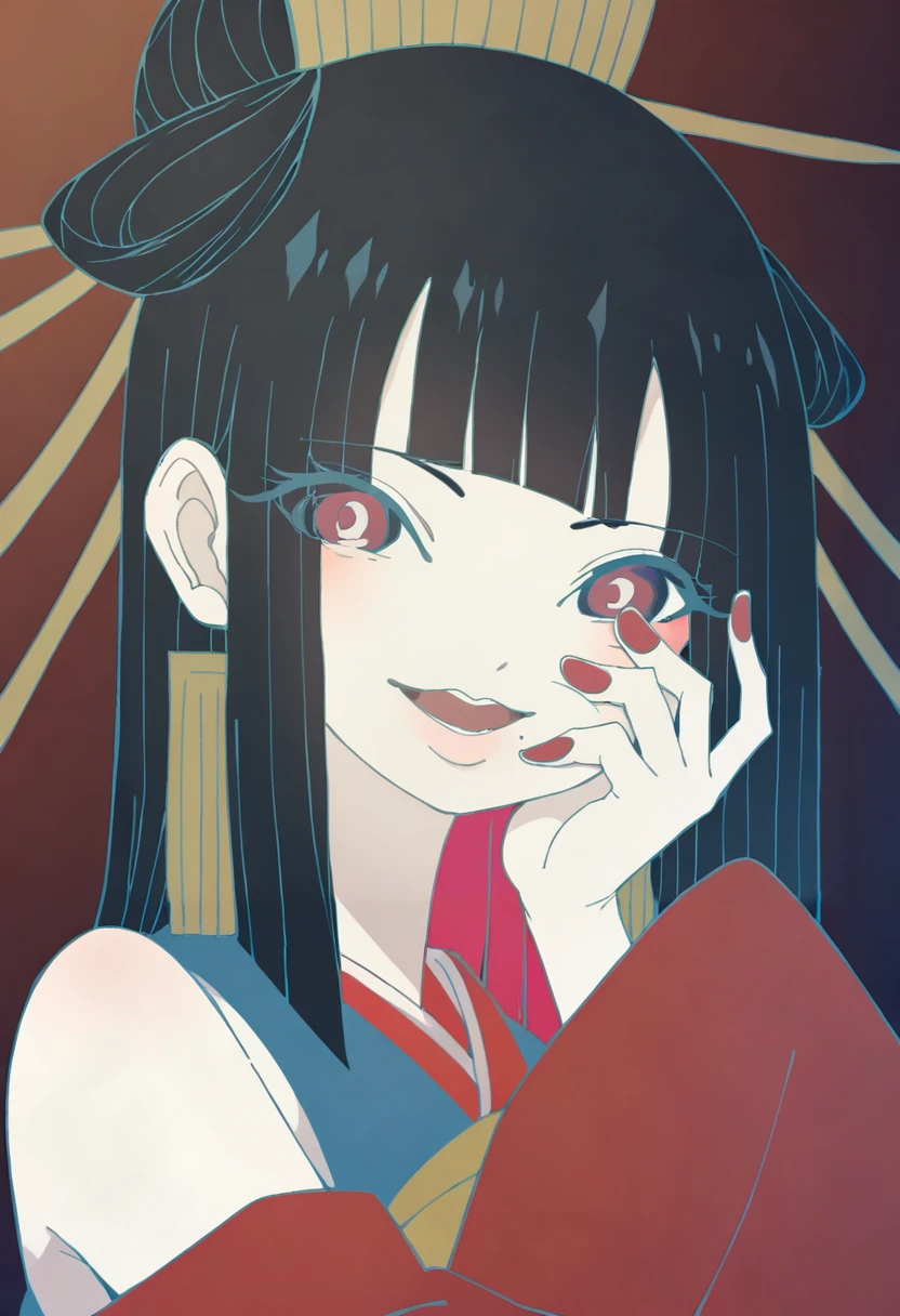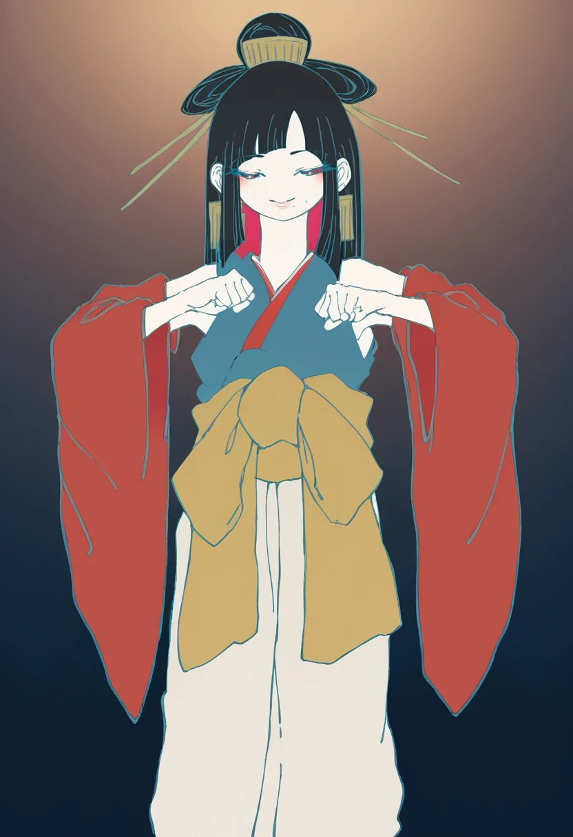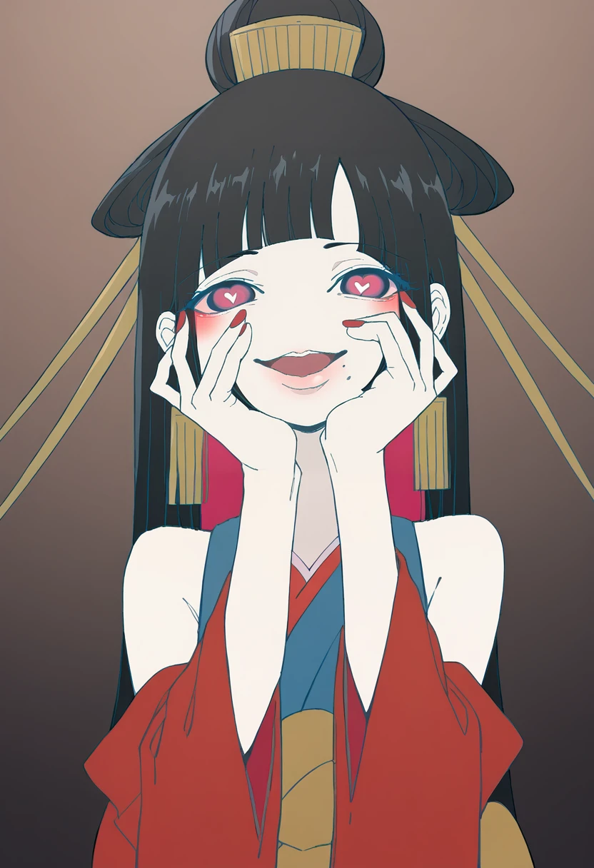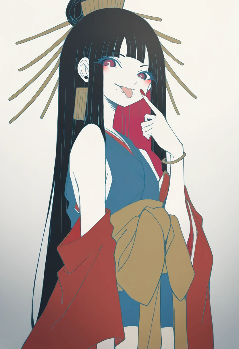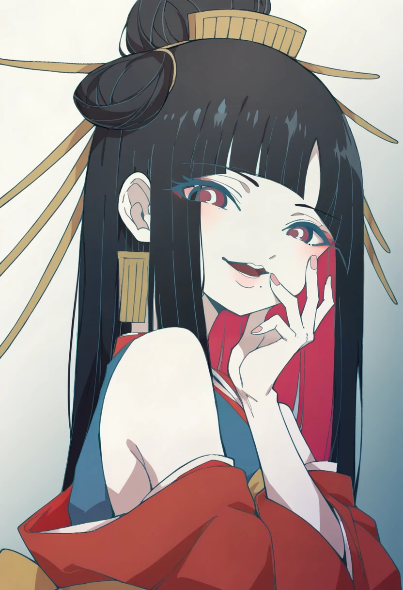 hyururirapappa, long hair, black hair, multicolored hair, colored inner hair, bangs, hime cut, single hair bun, blunt bangs, hair ornament, hair stick, purple eyes, mole under mouth, earrings