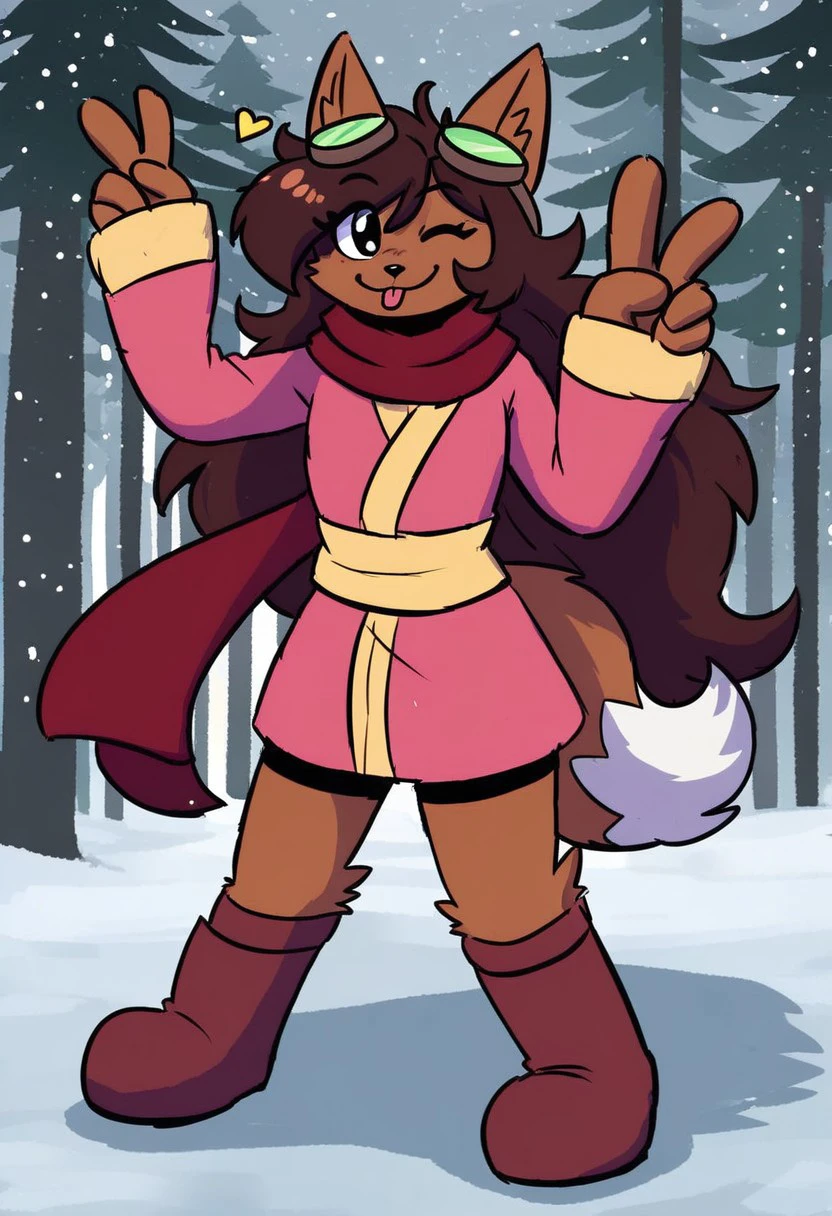 Kanako, reddish-pink kimono, dark red scarf, Long sleeves, yellow obi sash around midriff, Long hair, Goggles, goggles on head, Furry,