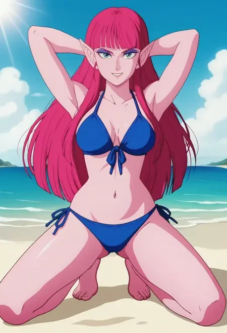 DBExtraGirlMera, pointy ears, very long hair, blunt bangs, pink hair, pink skin, colored skin, blue eyes, purple eyeshadow,