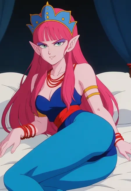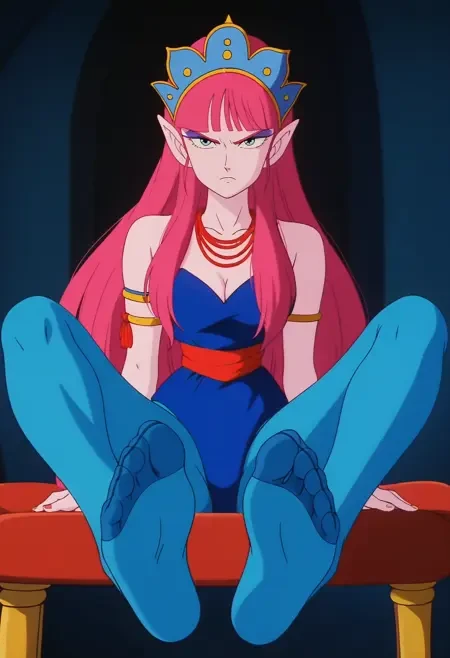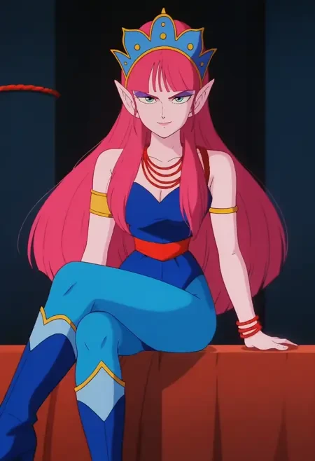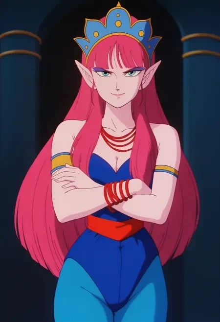 blue crown, blue leotard, cleavage, armlet, red waistband, blue pantyhose,
