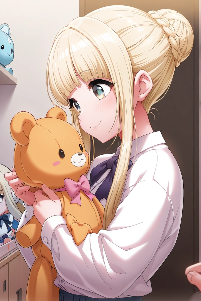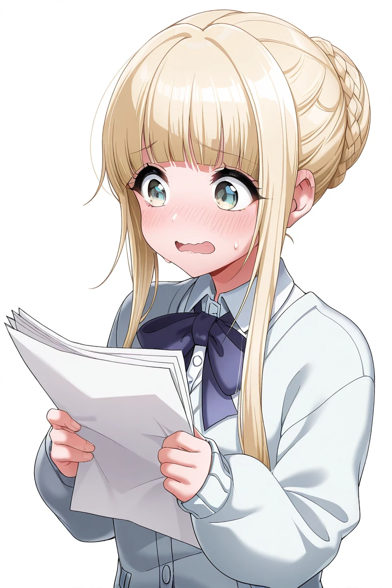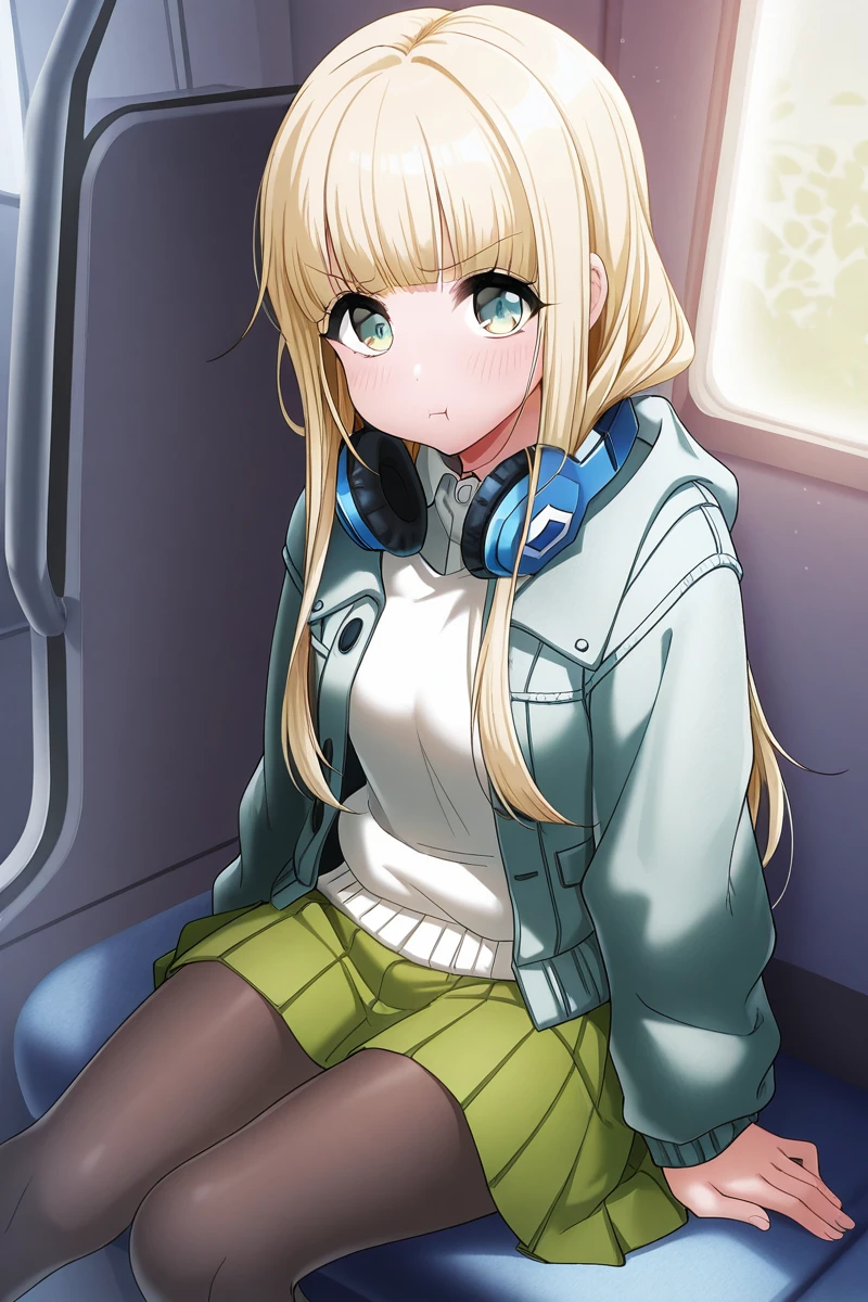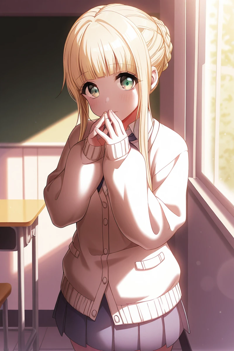 noa, 1girl, solo, skirt, blonde hair, school uniform, green eyes, pleated skirt, looking at viewer, cardiganBikini Noa: