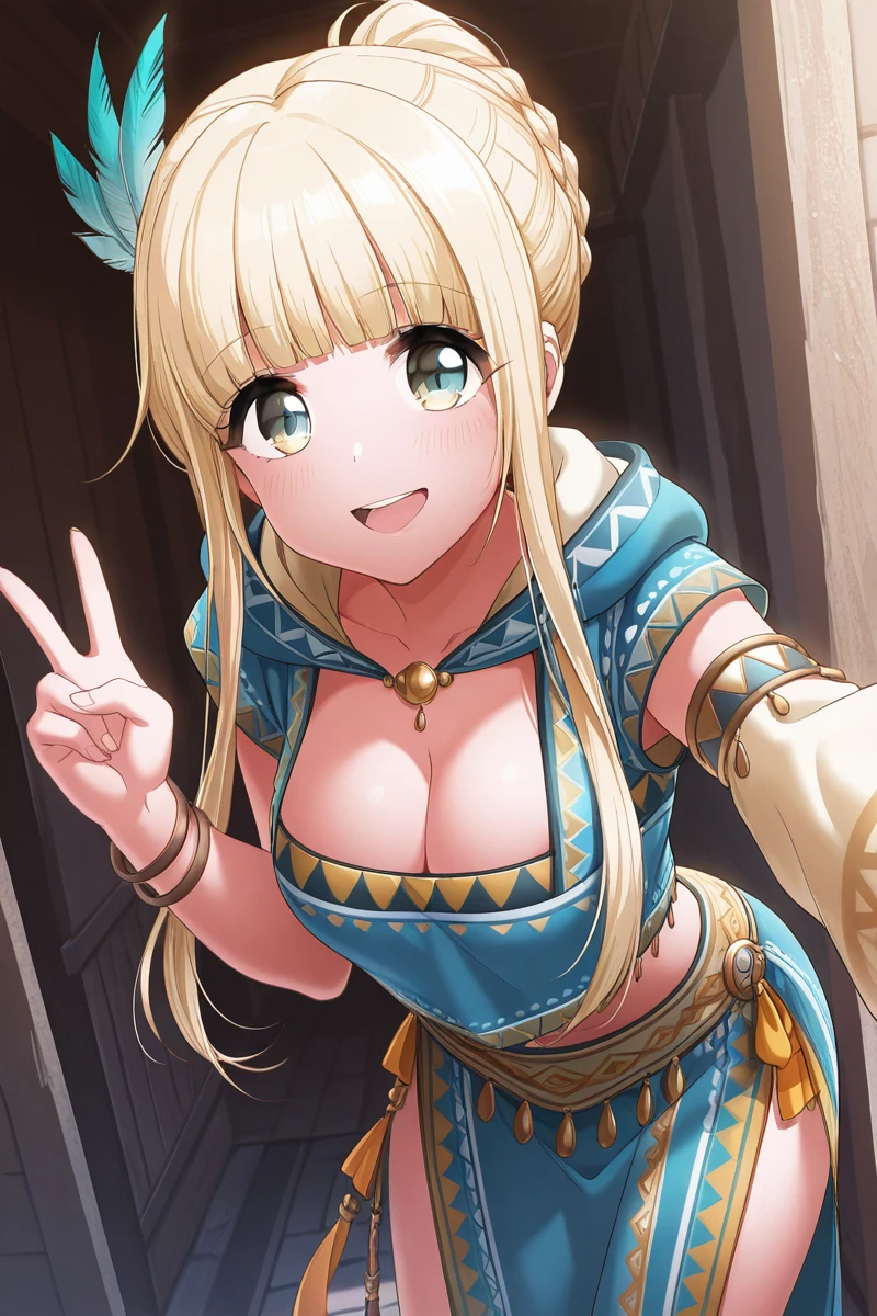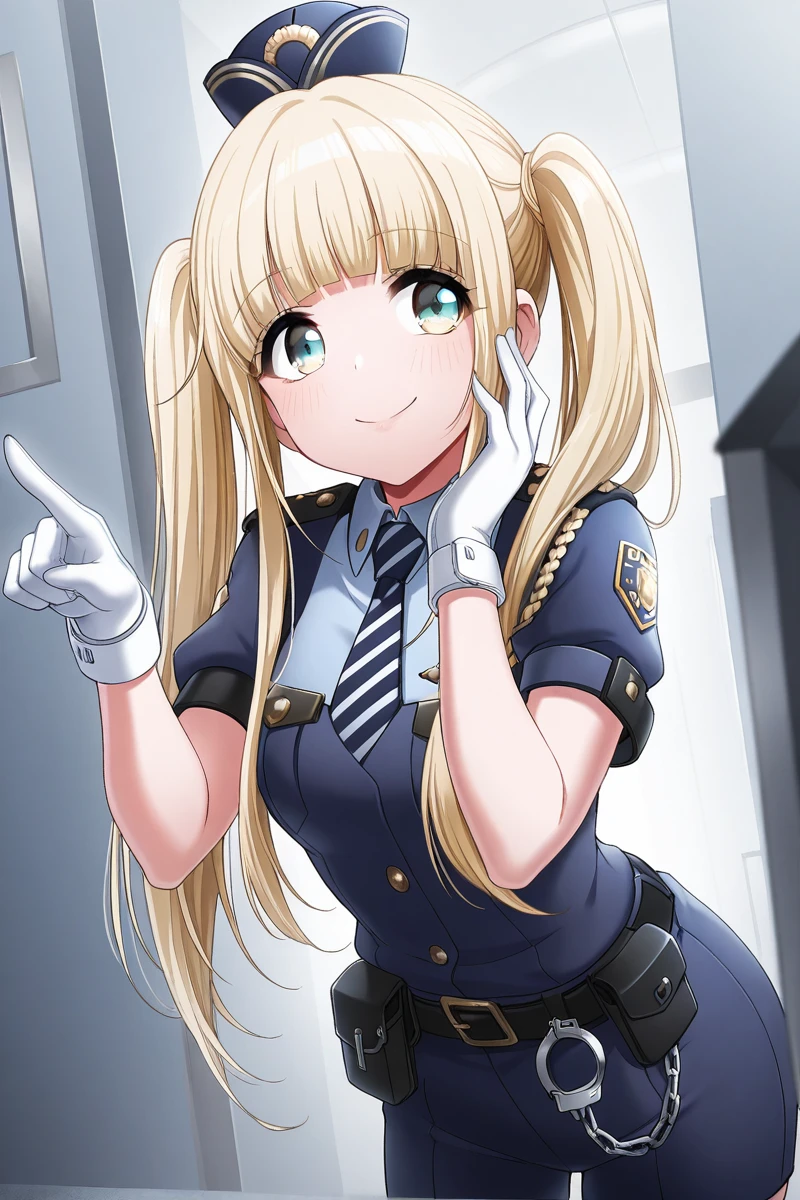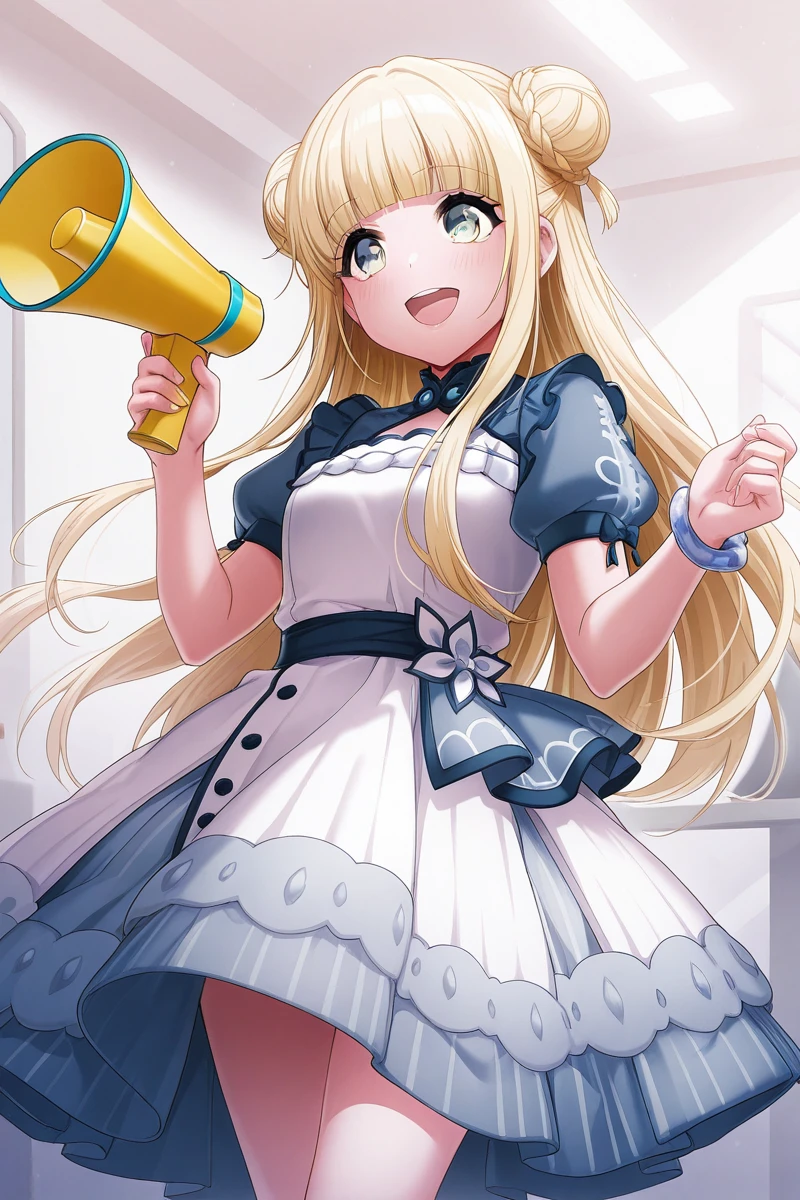 noa, 1girl, solo, detached sleeves, smile, blonde hair, breasts, skirt, bangs, looking at viewer, salute, hand on waist, white skirt, white sleeves, stage outfit, on stageSchool uniform Noa: