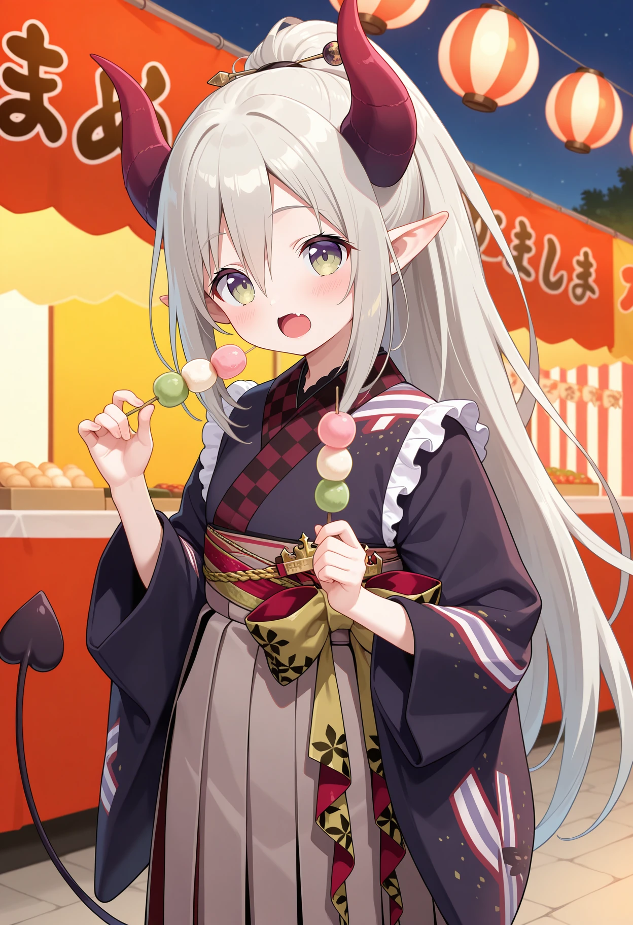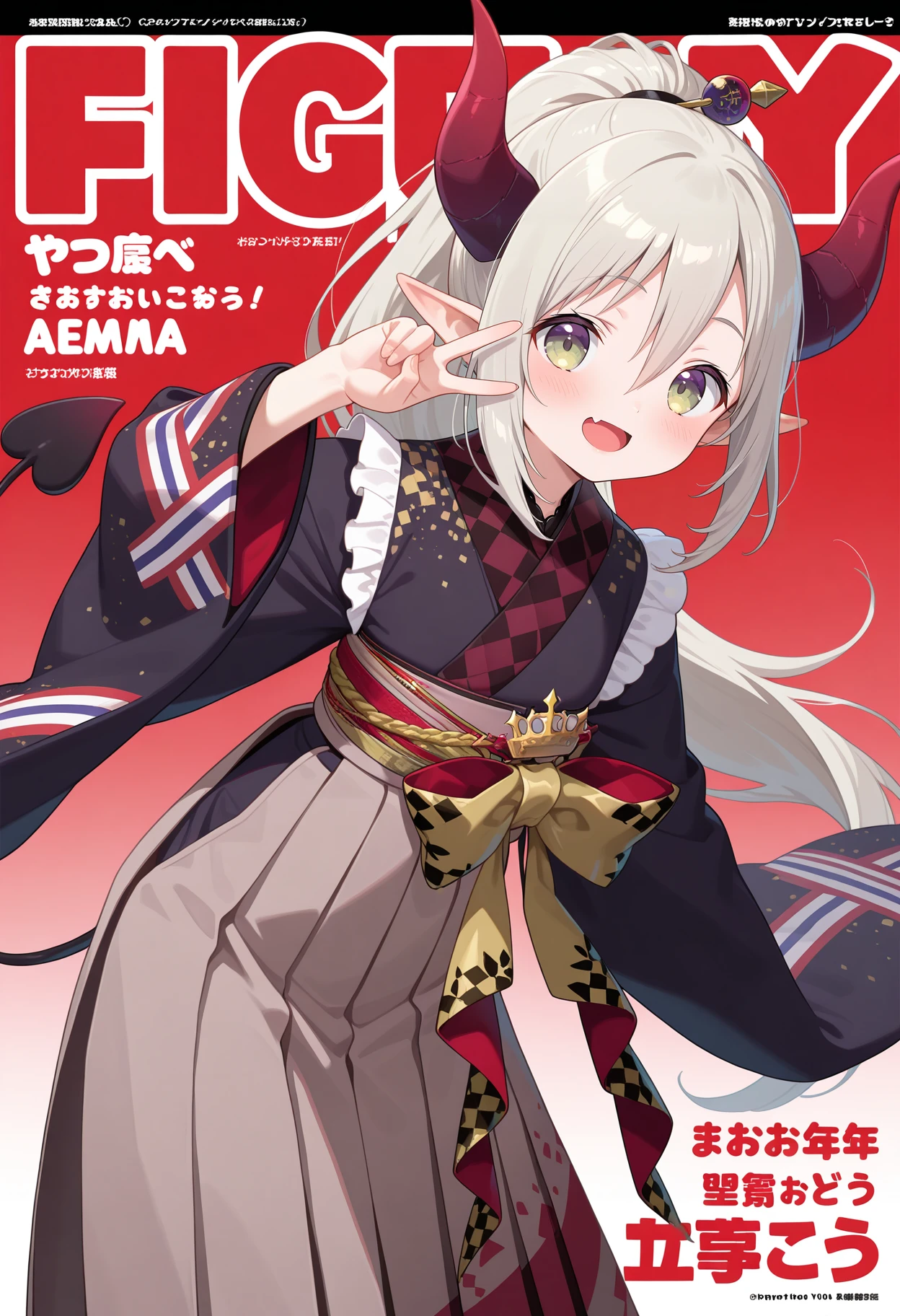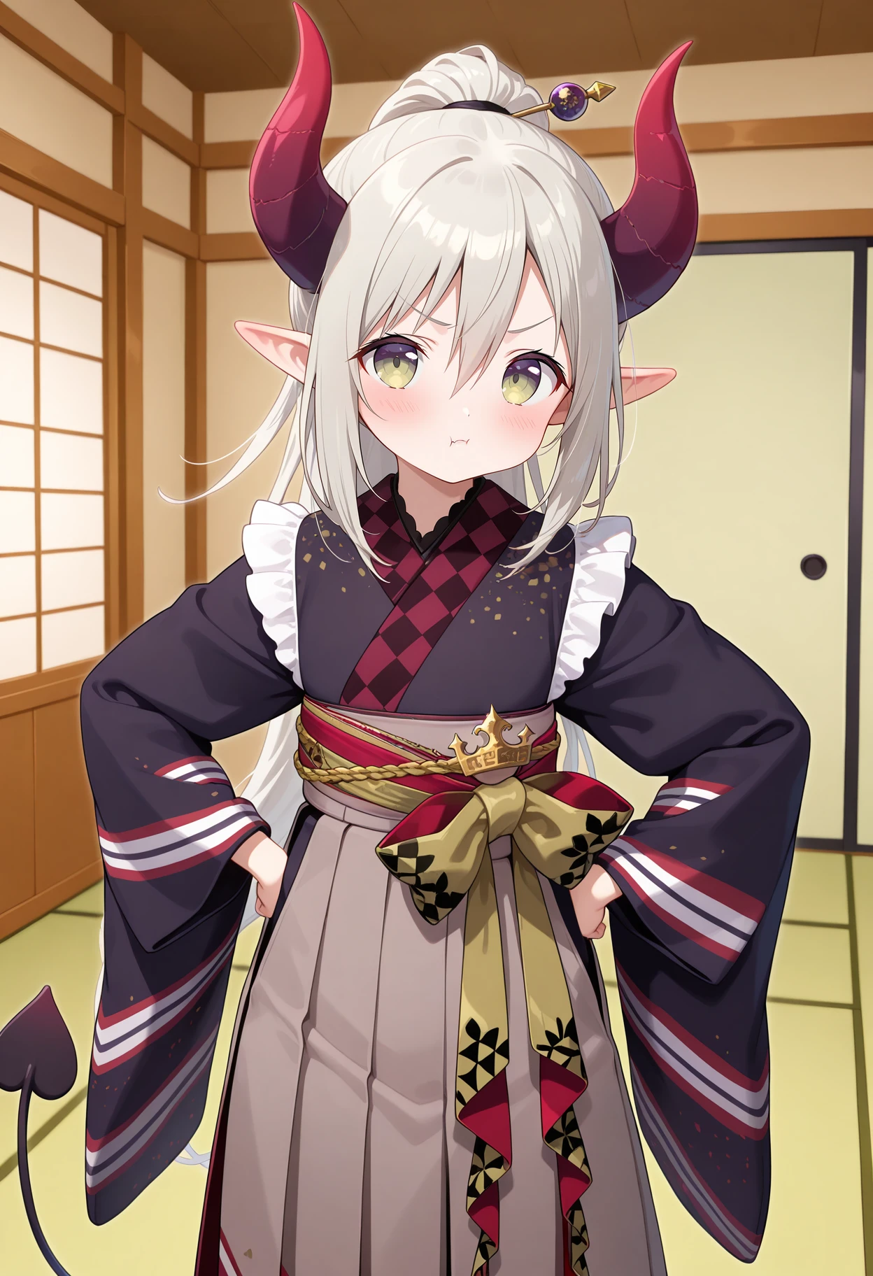 outfit2aaemma, long hair, grey hair, ponytail, horns, pointy ears, fang, demon tail, black kimono, long sleeves, wide sleeves, sash, obi, long skirt, hakama skirt, grey hakama