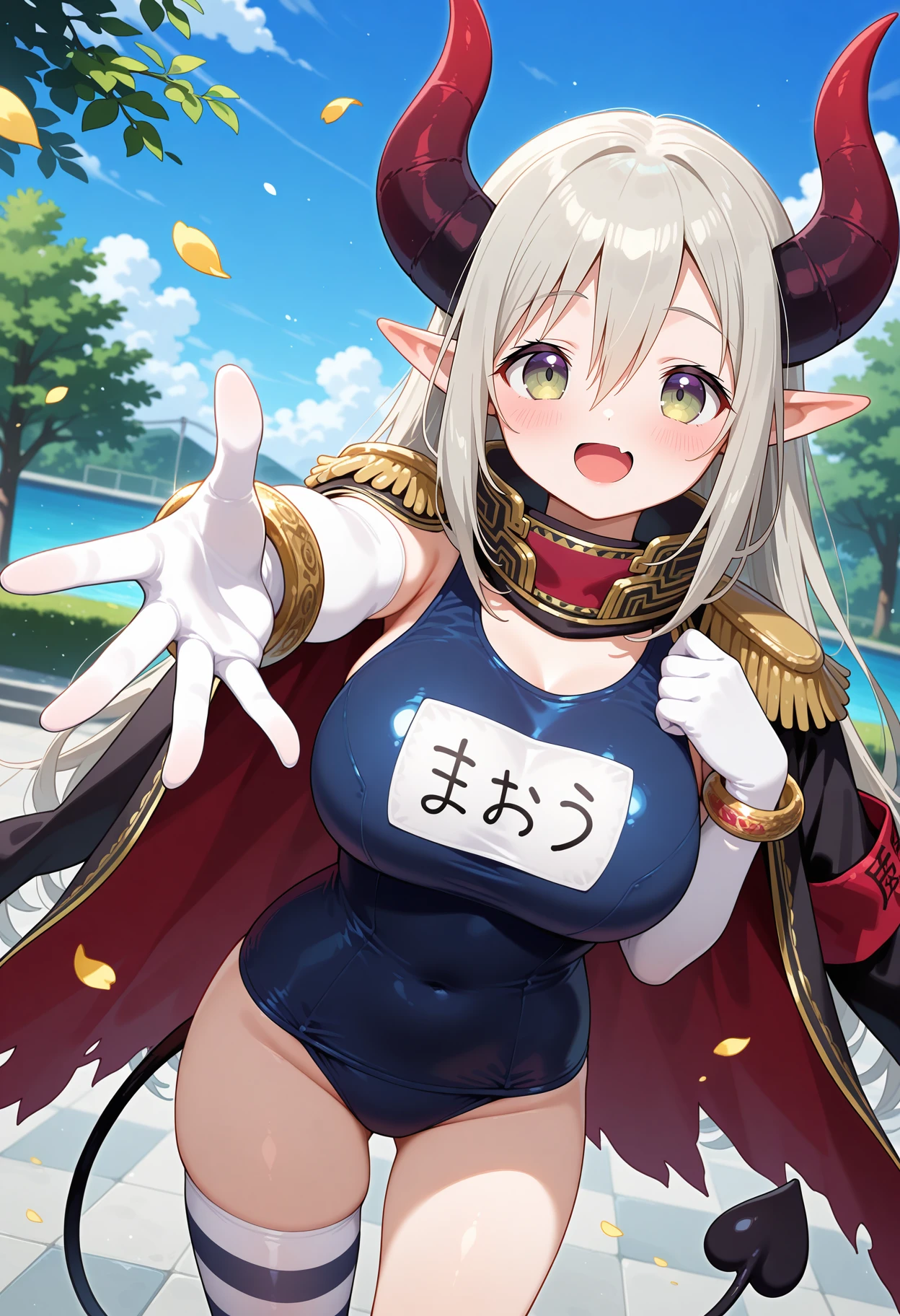 outfit1-1 (original)aaemma, long hair, grey hair, horns, pointy ears, fang, demon tail, epaulettes, coat on shoulders, black coat, name tag, blue one-piece swimsuit, bracelet, elbow gloves, white gloves, single thighhigh, striped thighhighs