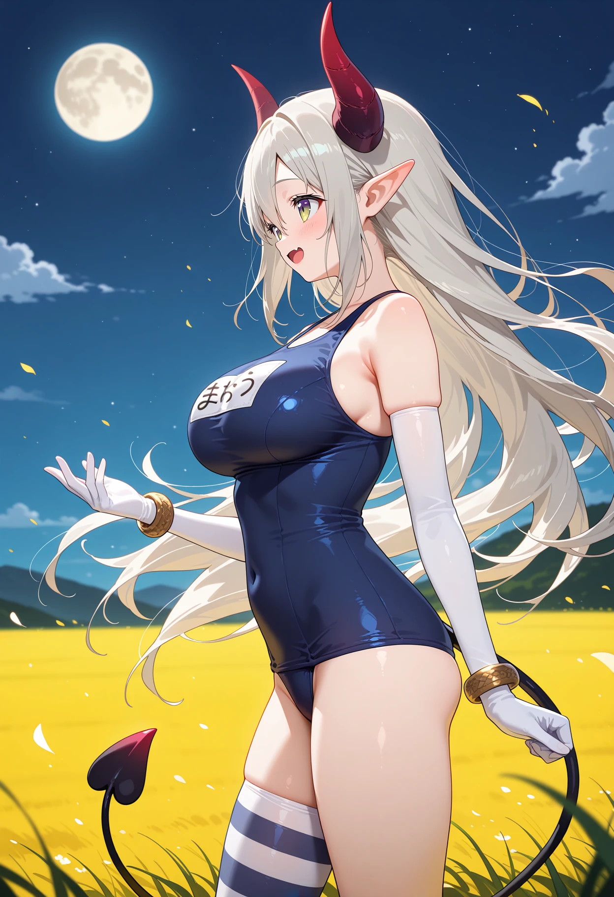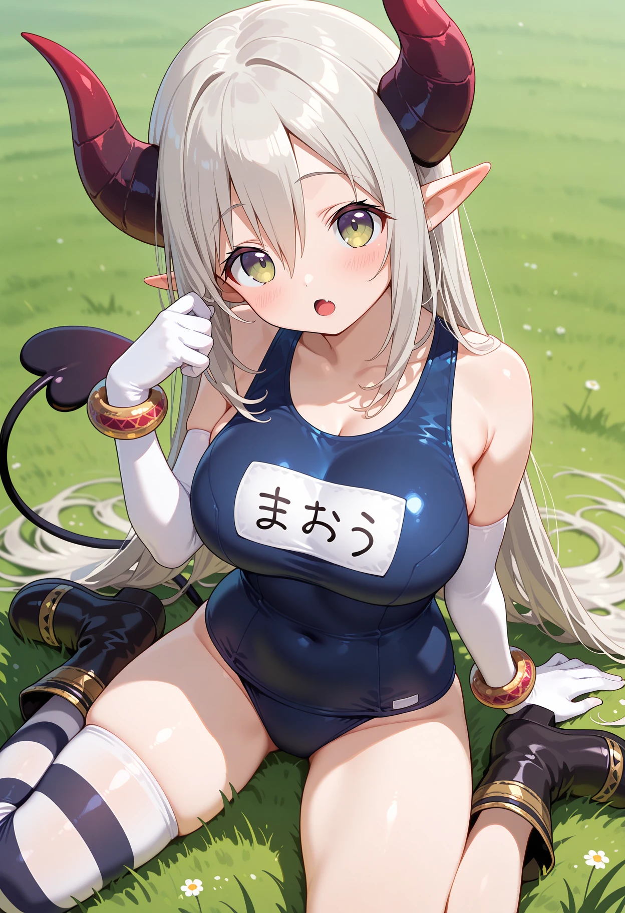 outfit1-2aaemma, long hair, grey hair, horns, pointy ears, fang, demon tail, name tag, blue one-piece swimsuit, bracelet, elbow gloves, white gloves, single thighhigh, striped thighhighs