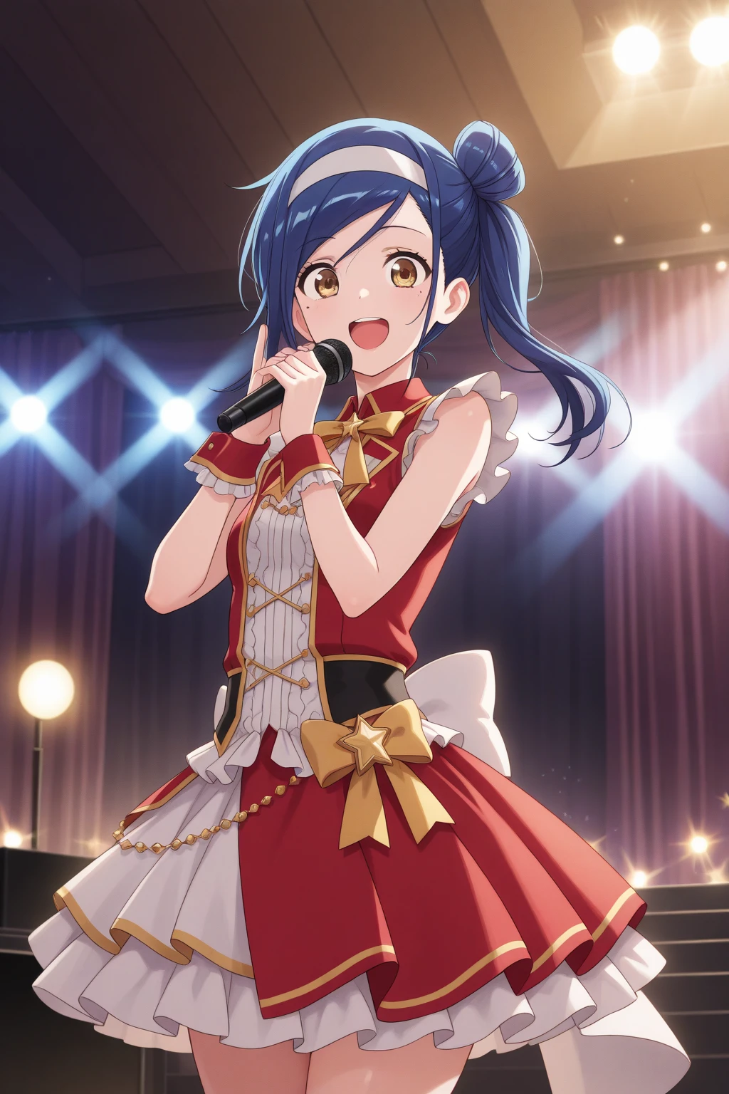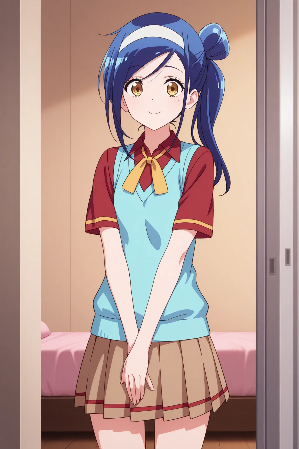 aafumino, blue hair, single hair bun, side ponytail, white hairband, yellow eyes, mole under eye, school uniform, neck ribbon, red shirt, short sleeves, sweater vest, brown skirt, pleated skirt, anime coloring,