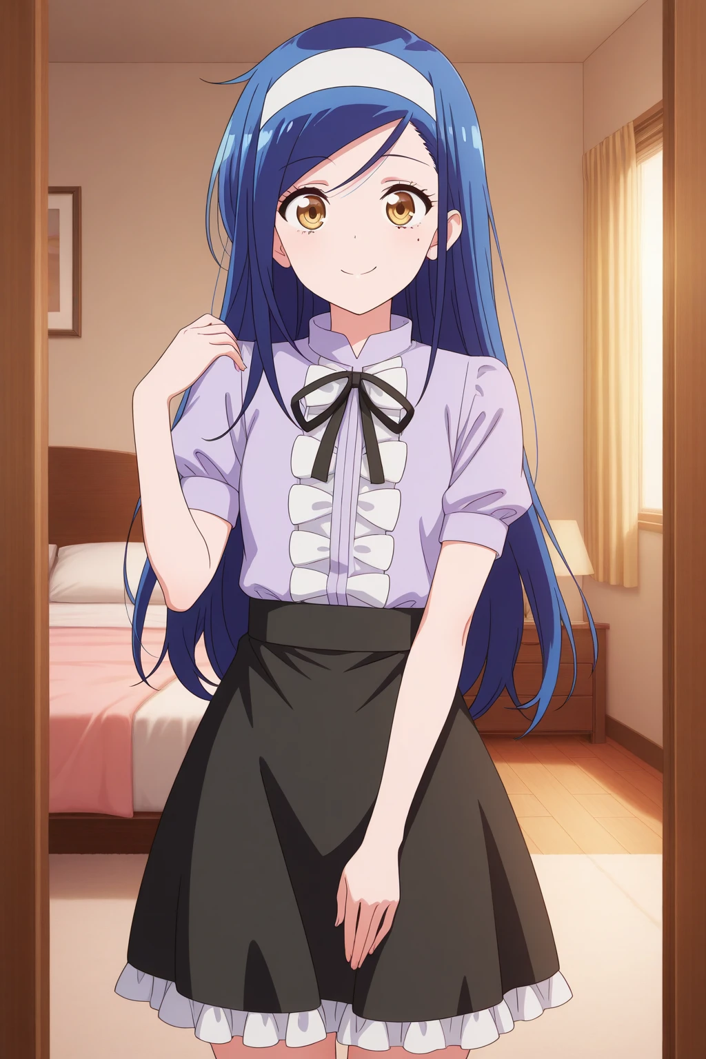 aafumino, blue hair, white hairband, yellow eyes, mole under eye, purple shirt, puffy short sleeves, neck ribbon, black skirt, frills,Description