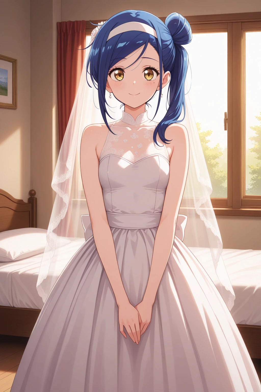 aafumino, blue hair, single hair bun, side ponytail, white hairband, yellow eyes, mole under eye, school uniform, neck ribbon, white shirt, blue cardigan, long sleeves, brown skirt, pleated skirt, anime coloring,