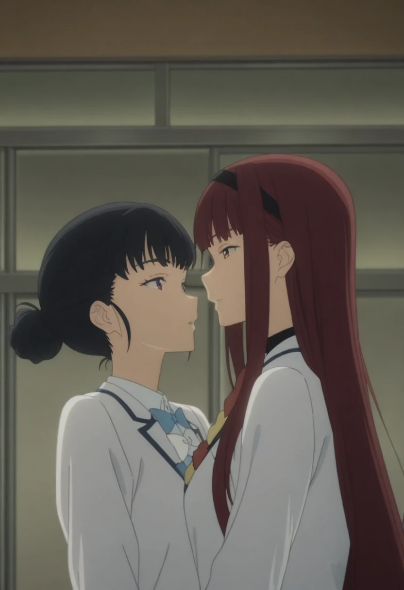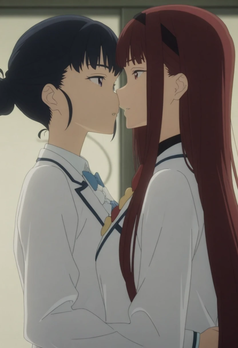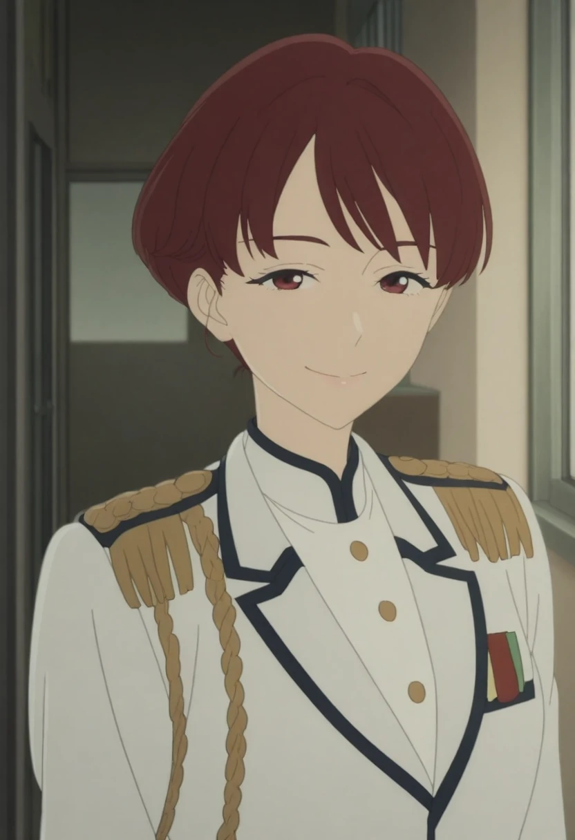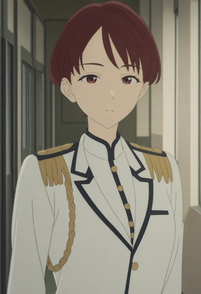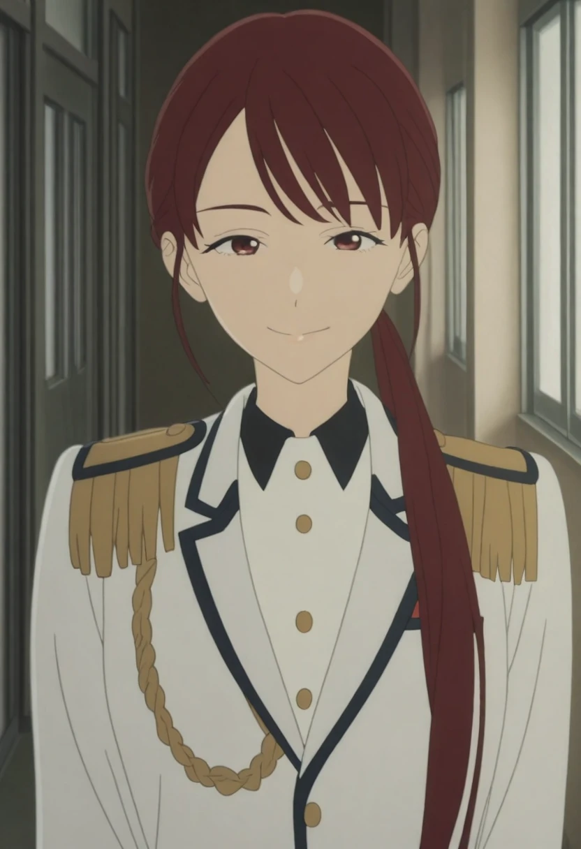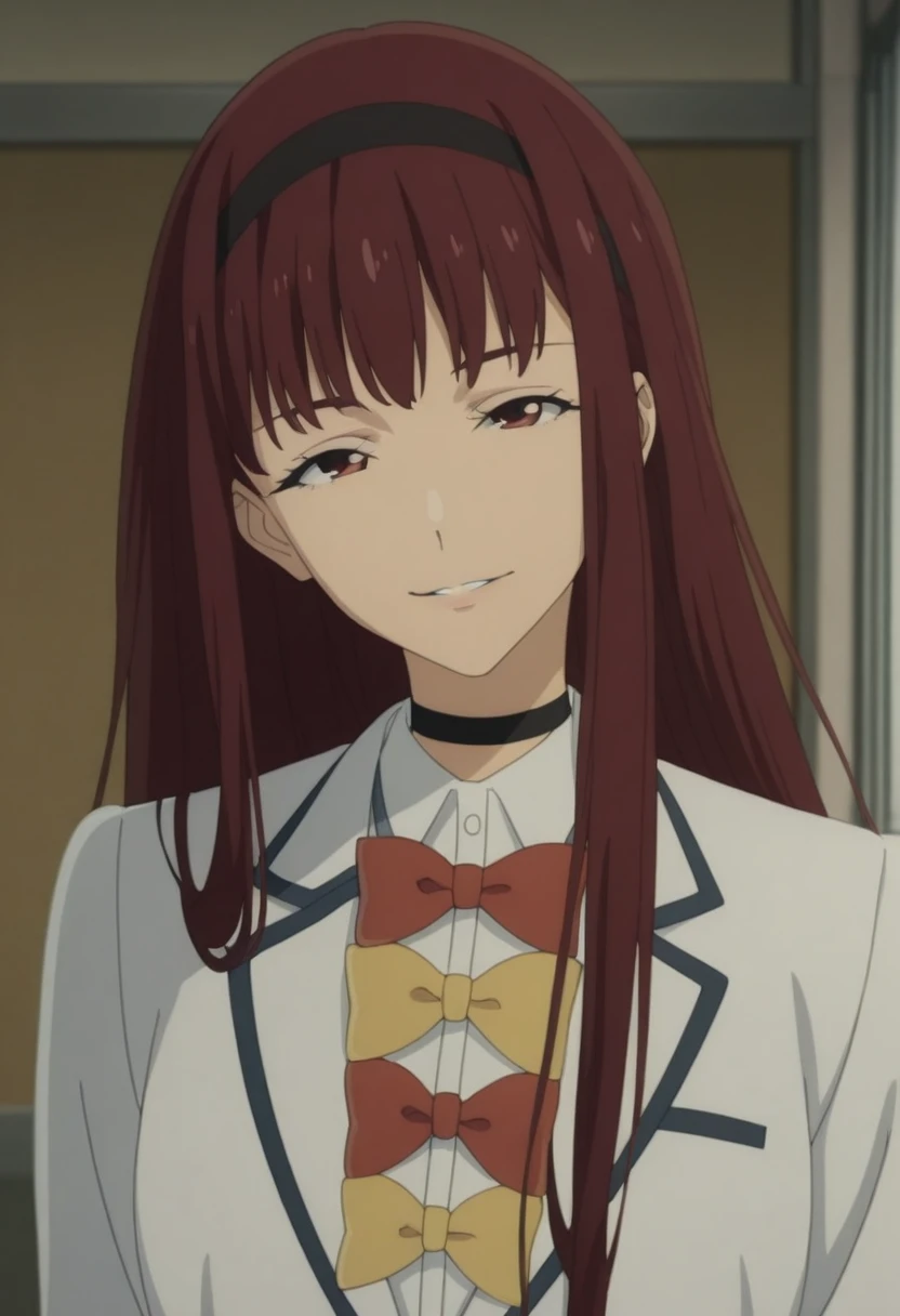 hibari hokobaru, red hair, black hairband, long hair, black choker, red eyes,tsuwabuki high school uniform, white jacket, collared shirt, bowtie,Tiara