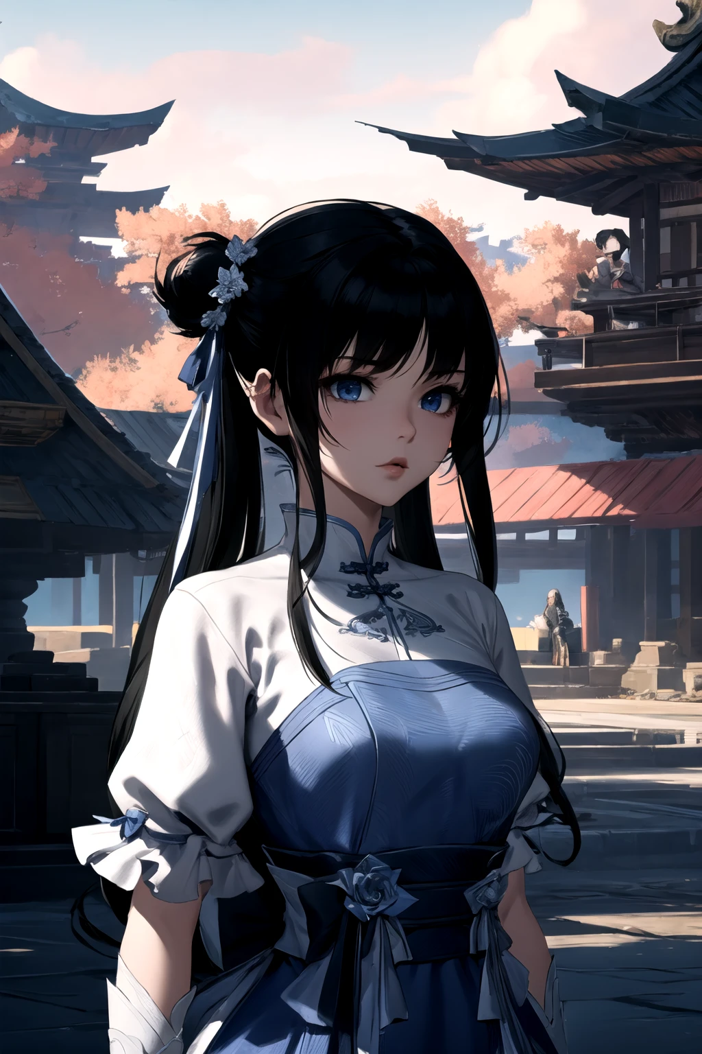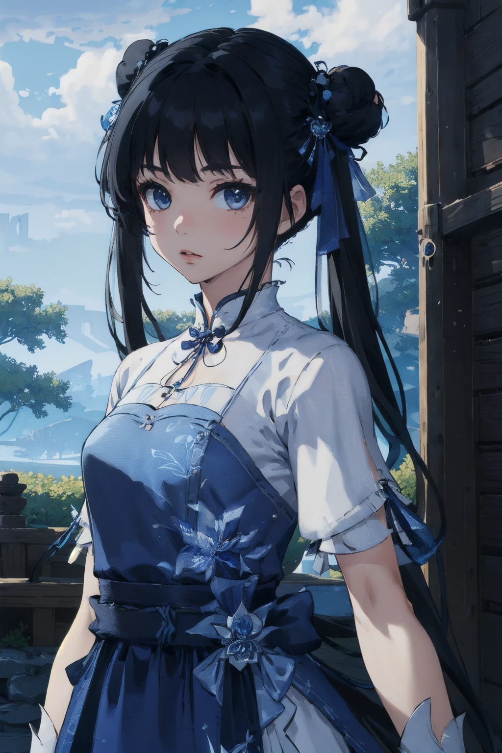 推荐提示词:zhaolinger,blue and white dress,hair bun,bangs,twintails,black hair,
