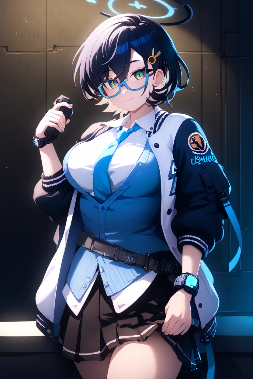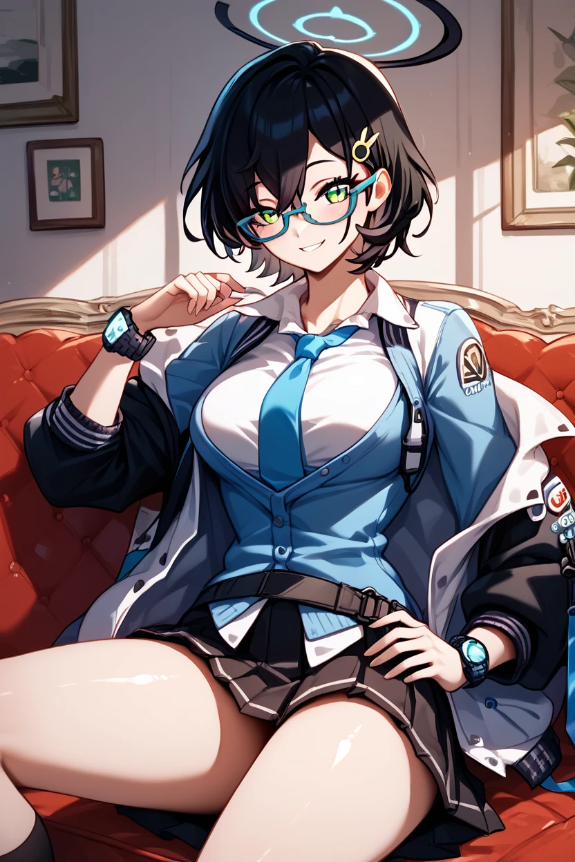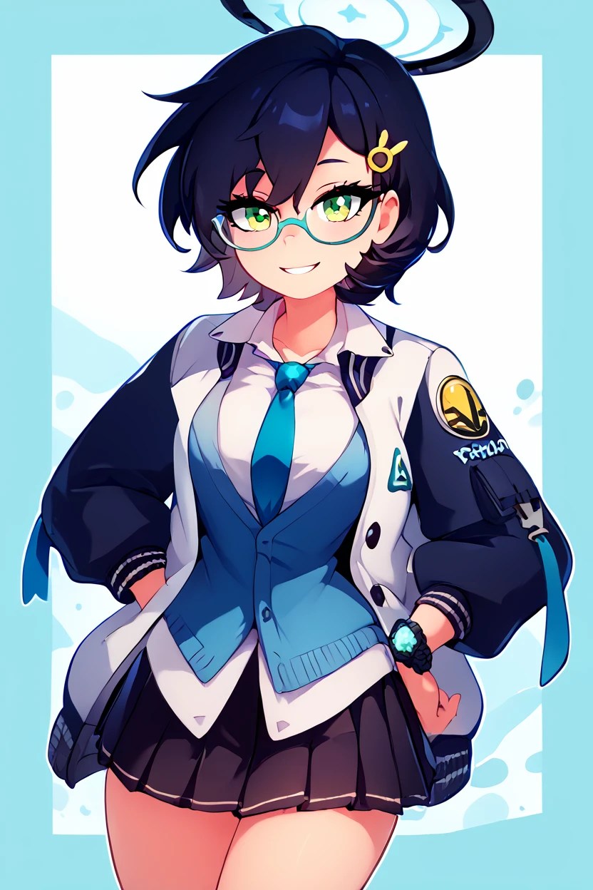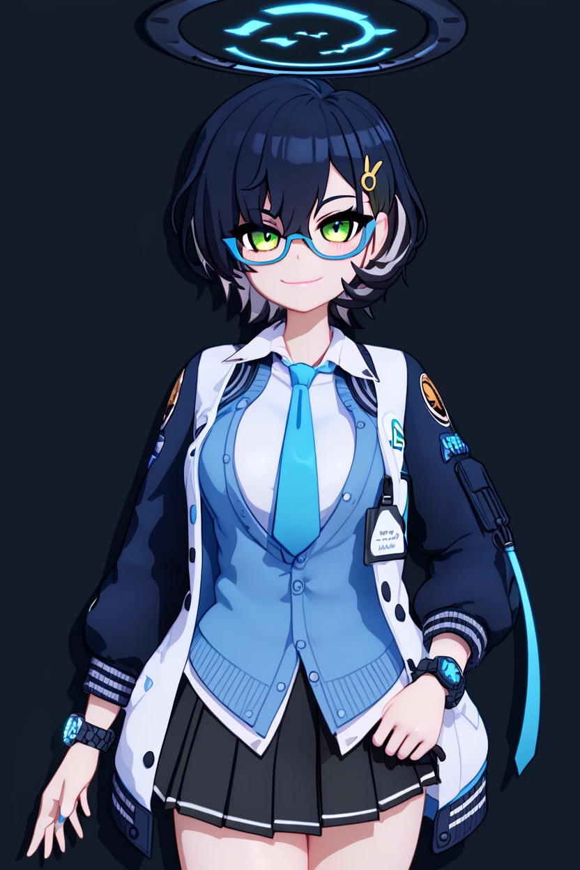 zzChihiro, green eyes, black hair, short hair, glasses, halo, hair ornament, blue cardigan, blue necktie, white shirt, black skirt, pleated skirt, wristwatch, open jacket ,