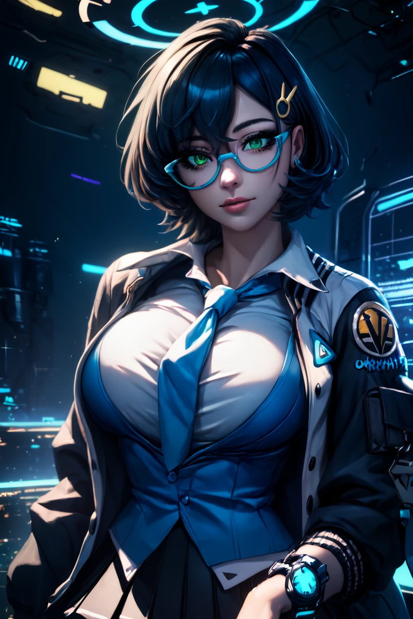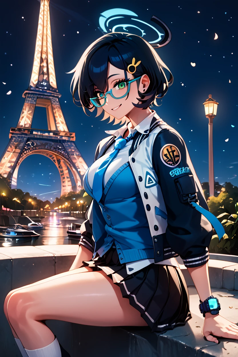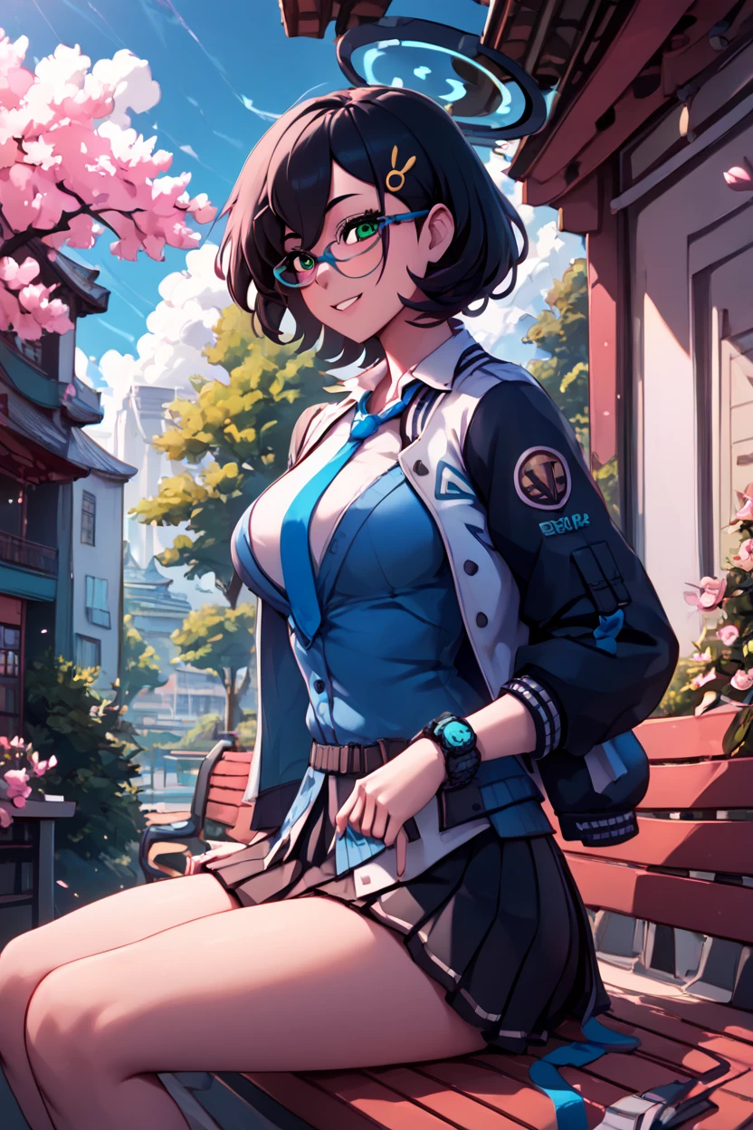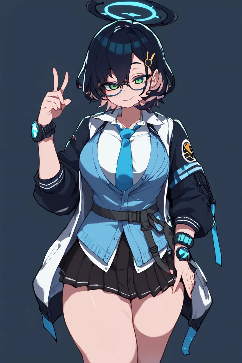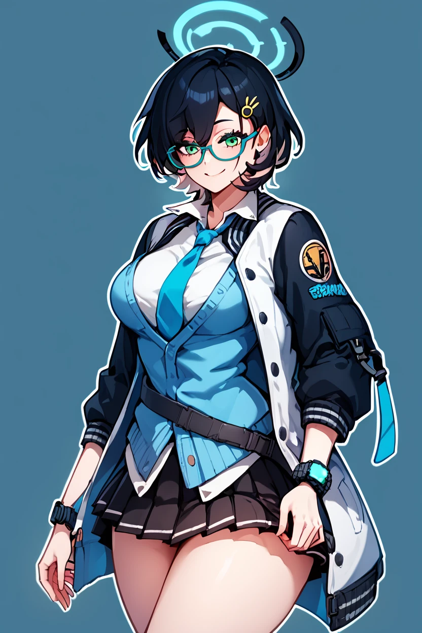 zzChihiro, green eyes, black hair, short hair, glasses, halo, hair ornament, blue cardigan, blue necktie, white shirt, black skirt, pleated skirt, wristwatch, open jacket ,