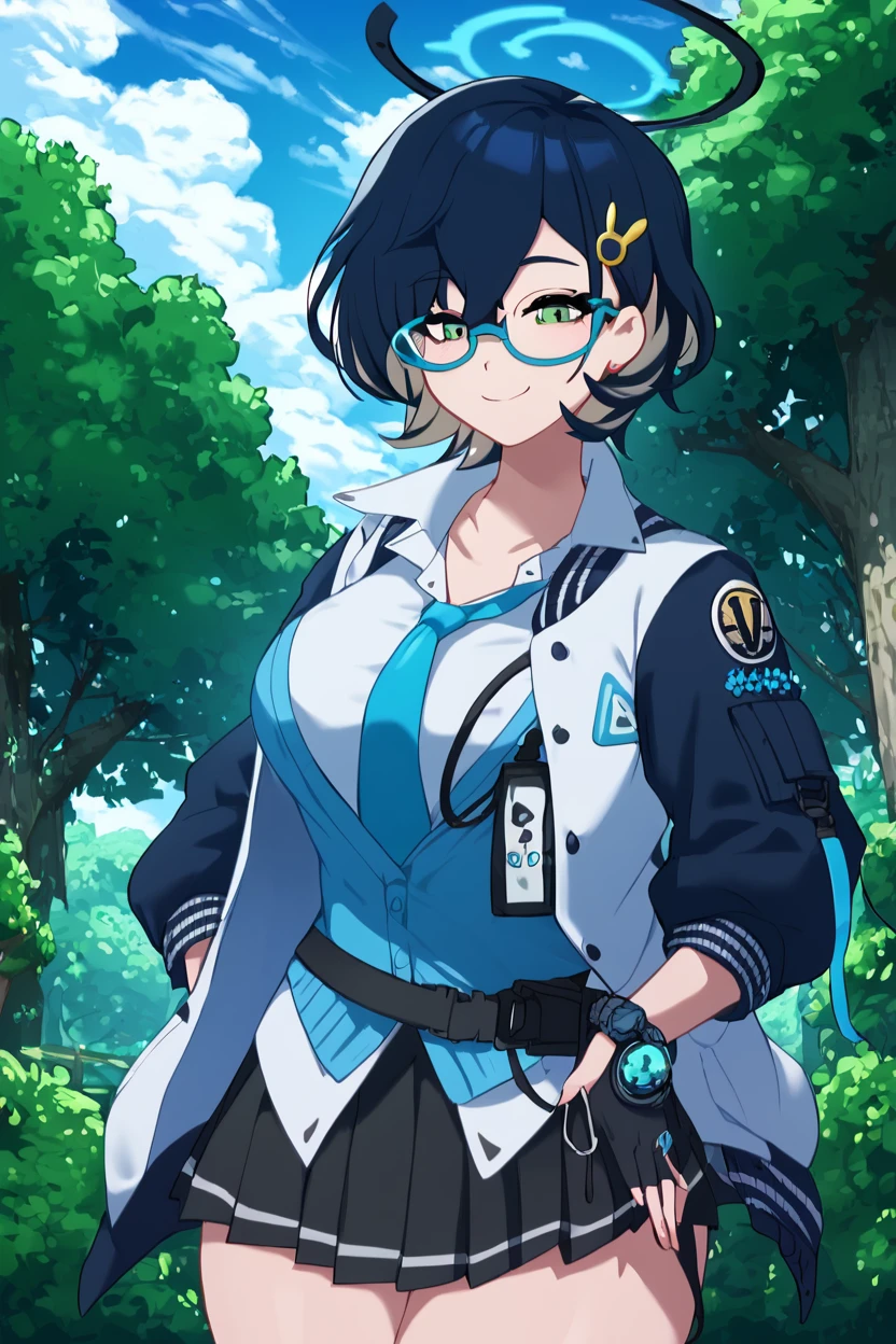 blue cardigan, blue necktie, white shirt, black skirt, pleated skirt, wristwatch, open jacket , <lora:Chihiro_BlueArchive_PDXL:1.0>,