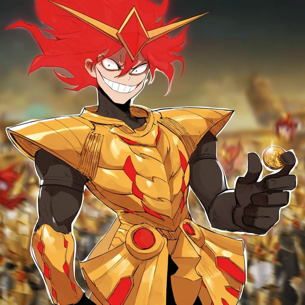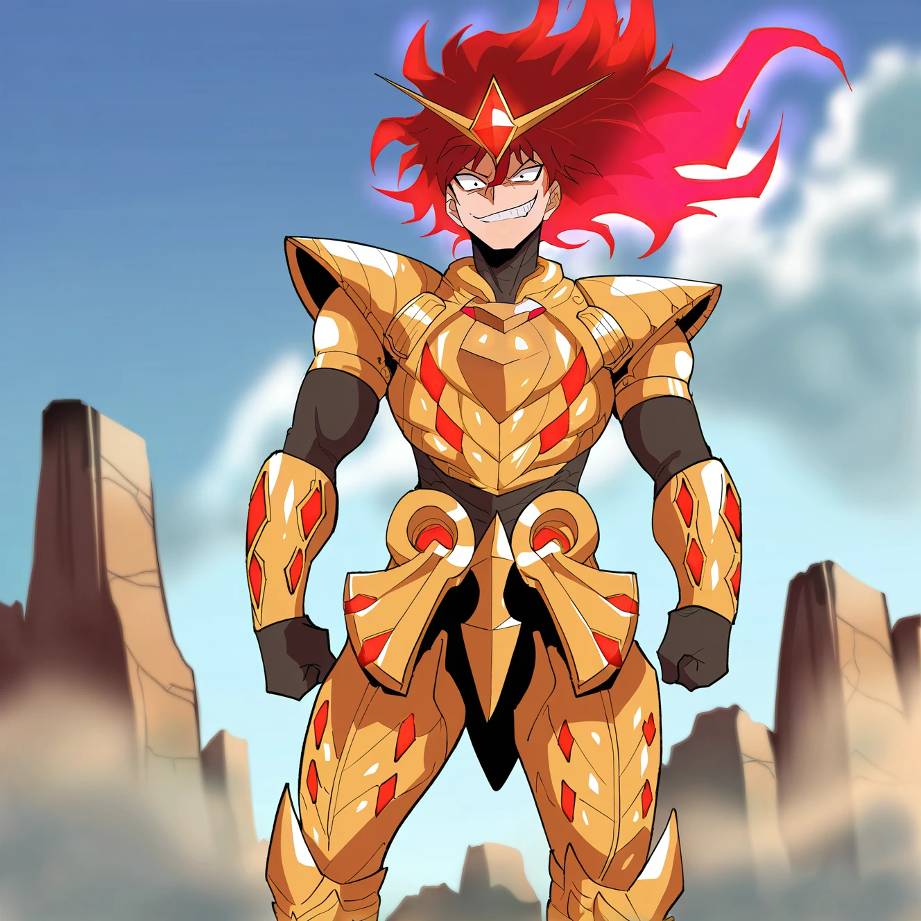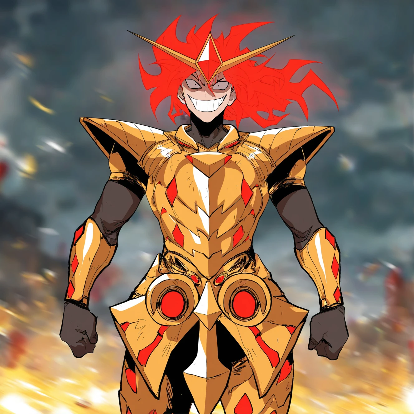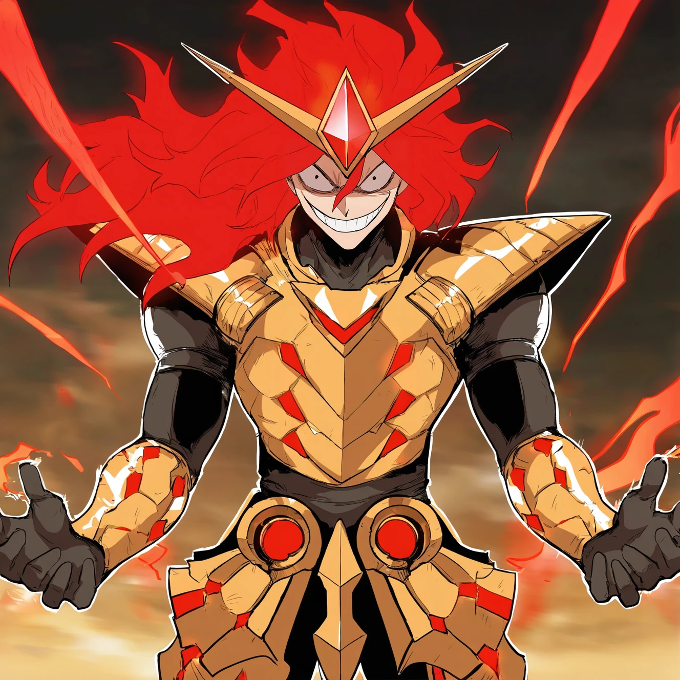 gold armor, hardcorelevellingwarrior, gold headwear, 1boy, evil smile, red hair, glowing hair