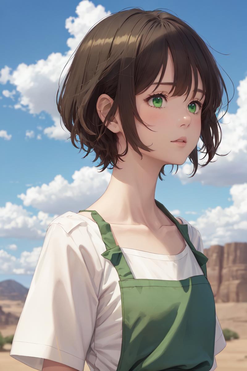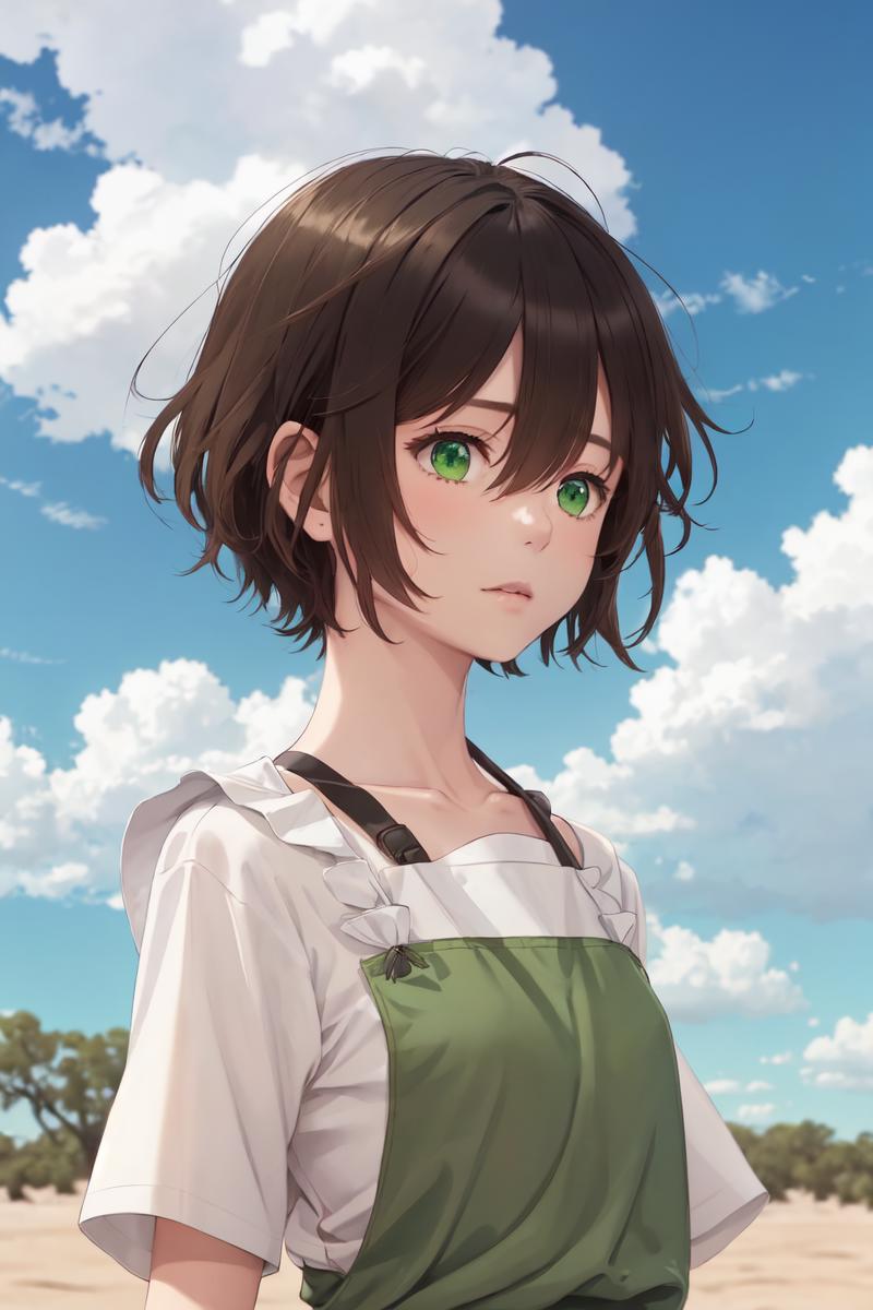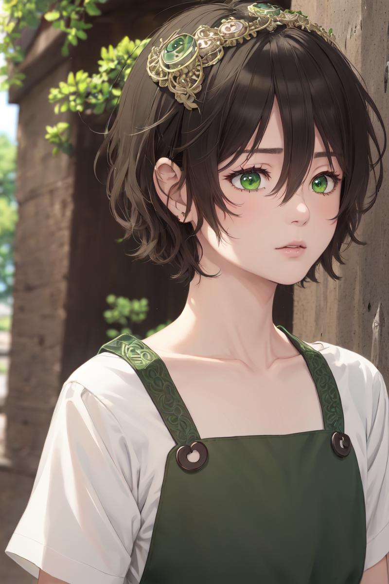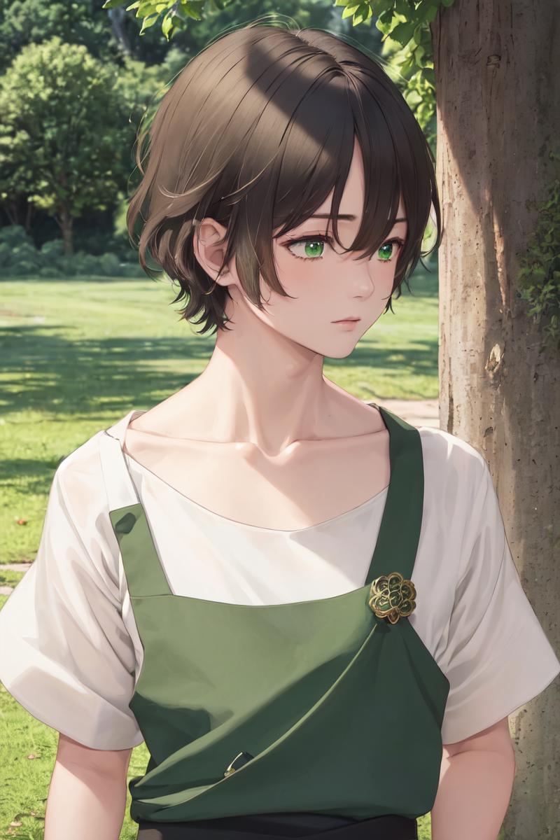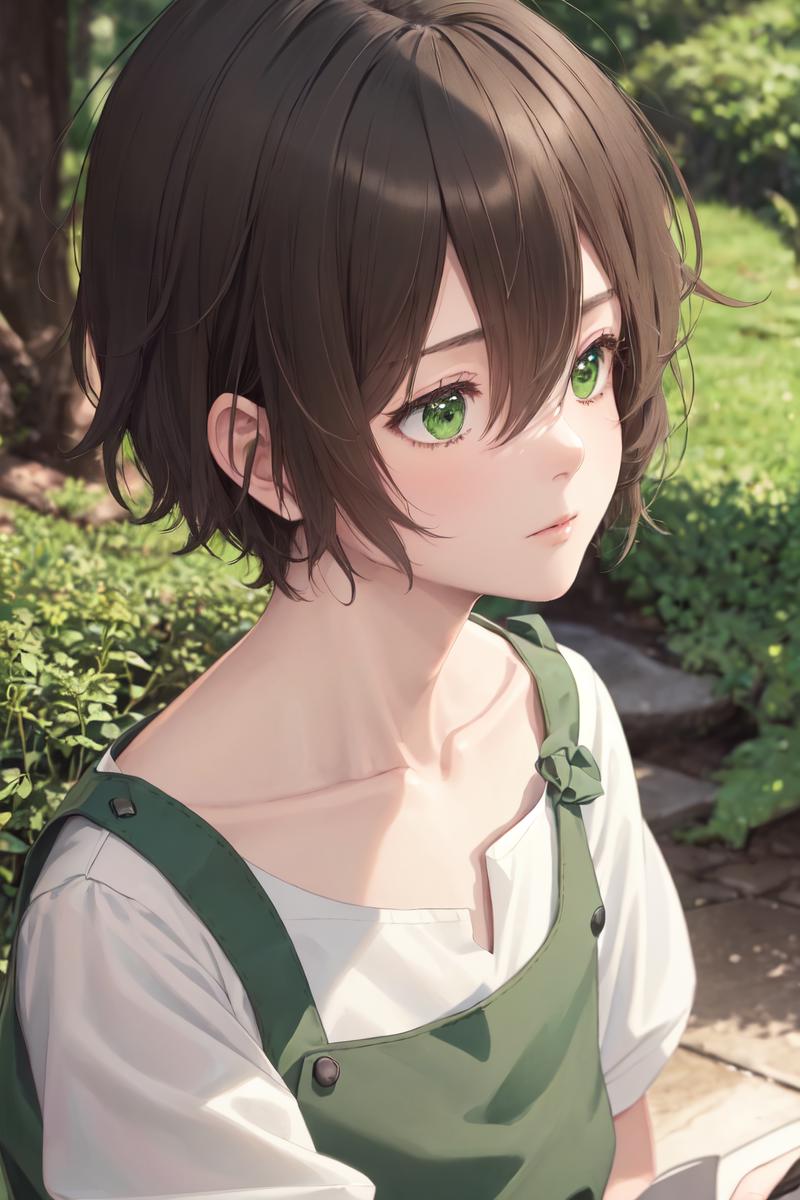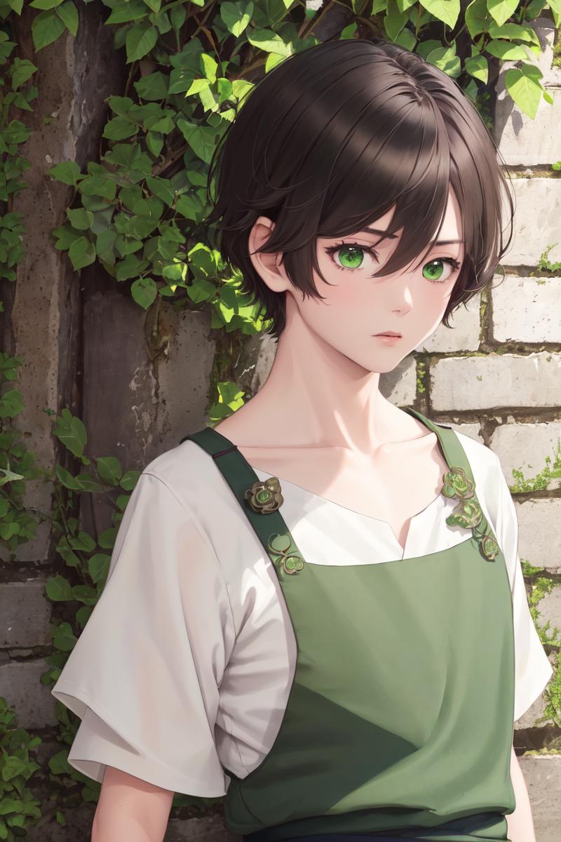 For better appearance add "green eyes, short hair, white shirt, short sleeves, black hair, collarbone, hair between eyes, male focus, green apron"