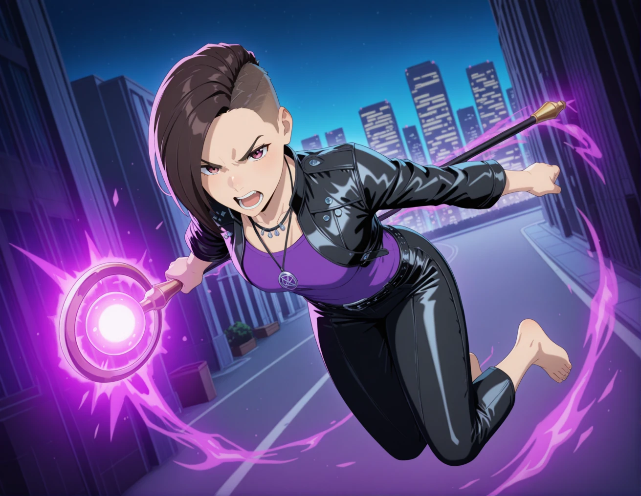 masterpiece,best quality,amazing quality,upper body,solo, Asian woman, nice eyes , high quality,nicomino++, nicogamelook, leather jacket, purple top, half-shaved hair, 1girl, asymmetrical hair, jewelry, breasts, makeup, solo, bracelet, choker, cleavage, earrings, black hair, necklace, lipstick, belt, jacket, eyeshadow, pants, leather, undercut, dark lights, city++, science fiction