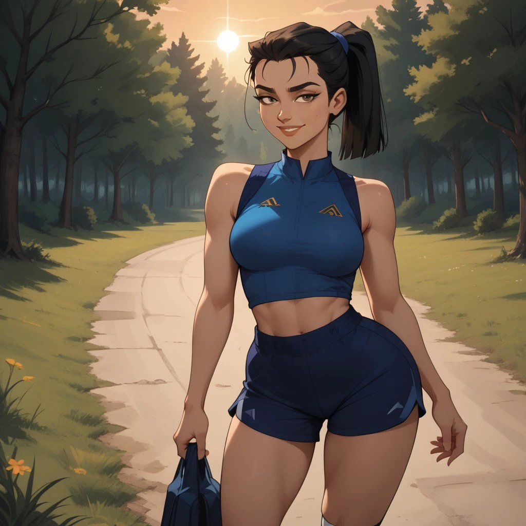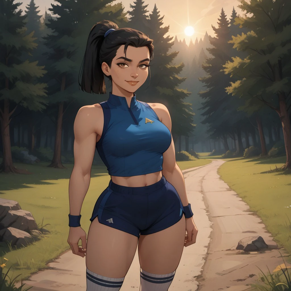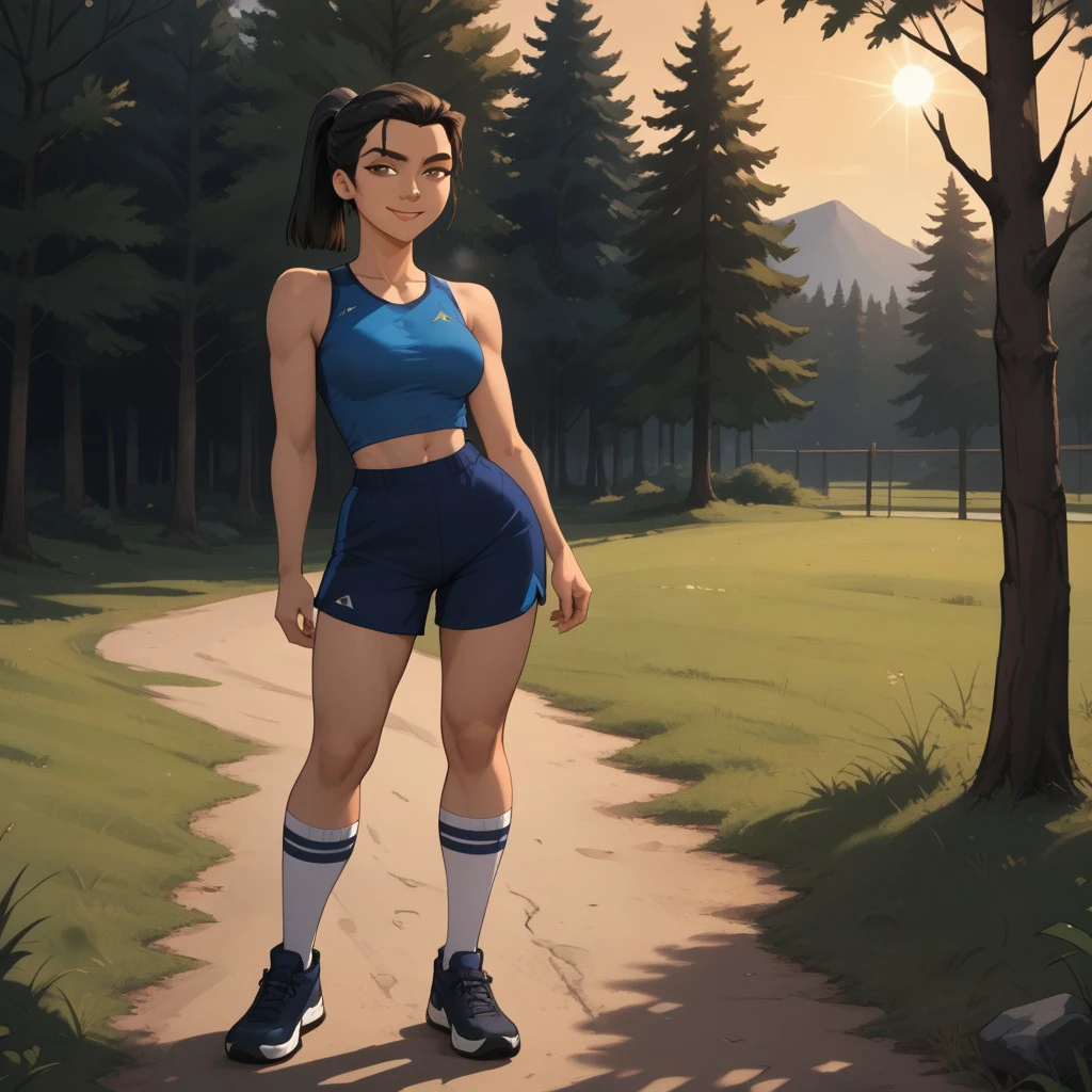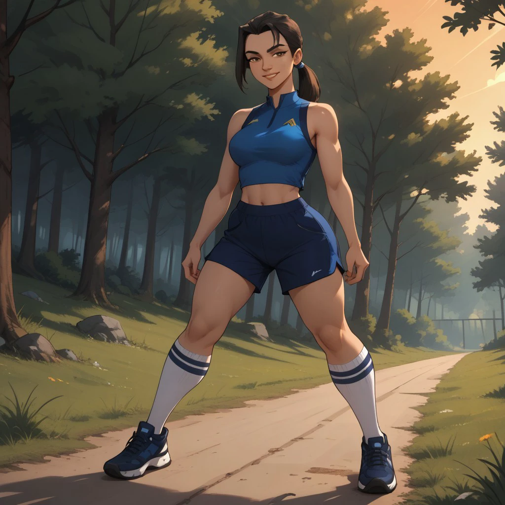 ponytail, black hair, mole under eye, mole, brown eyes, big breasts, unibrow, thick unibrow, shorts, sportswear, socks, white socks, sleeveless, kneehighs, blue shorts, black footwear, total drama, Eva_(Total_Drama)