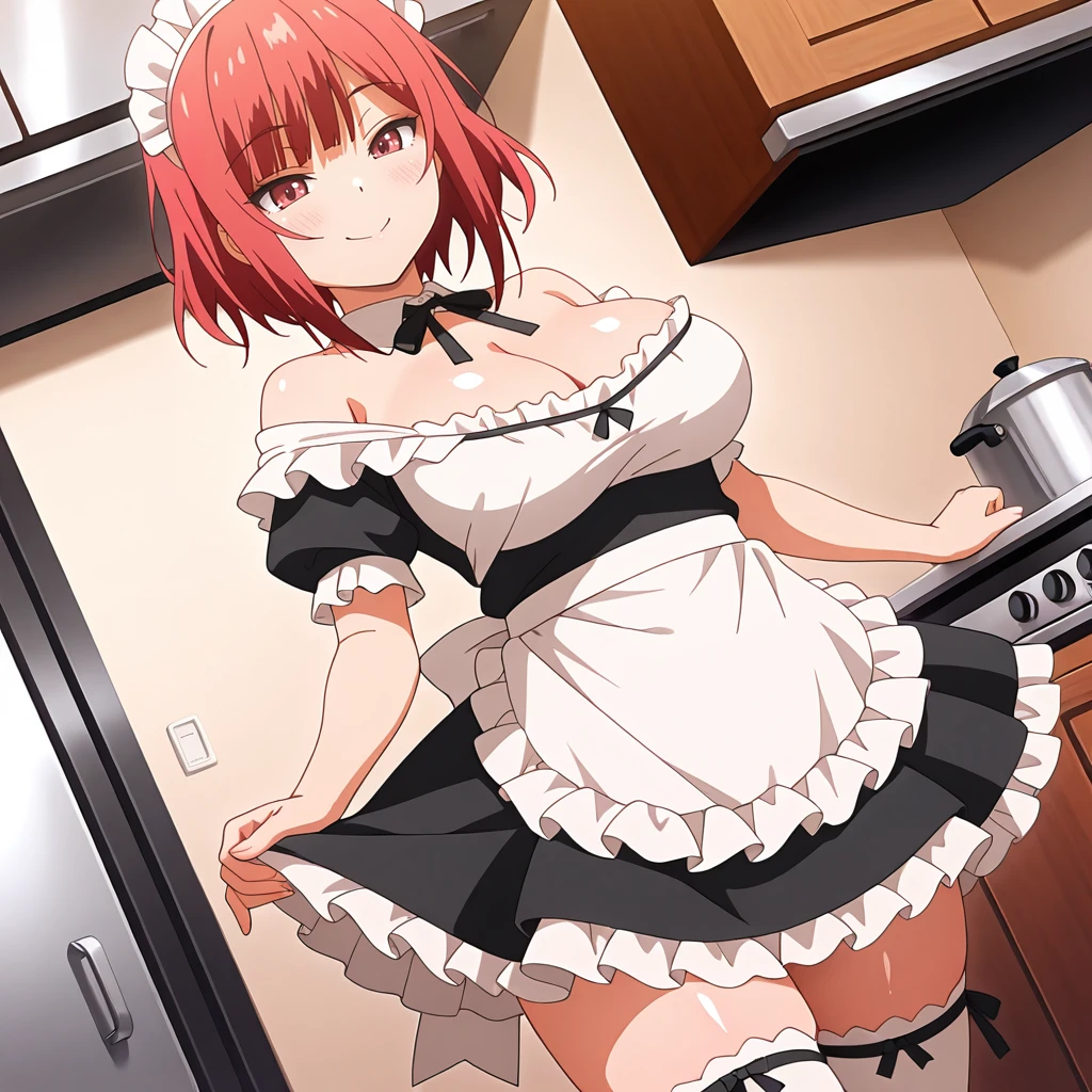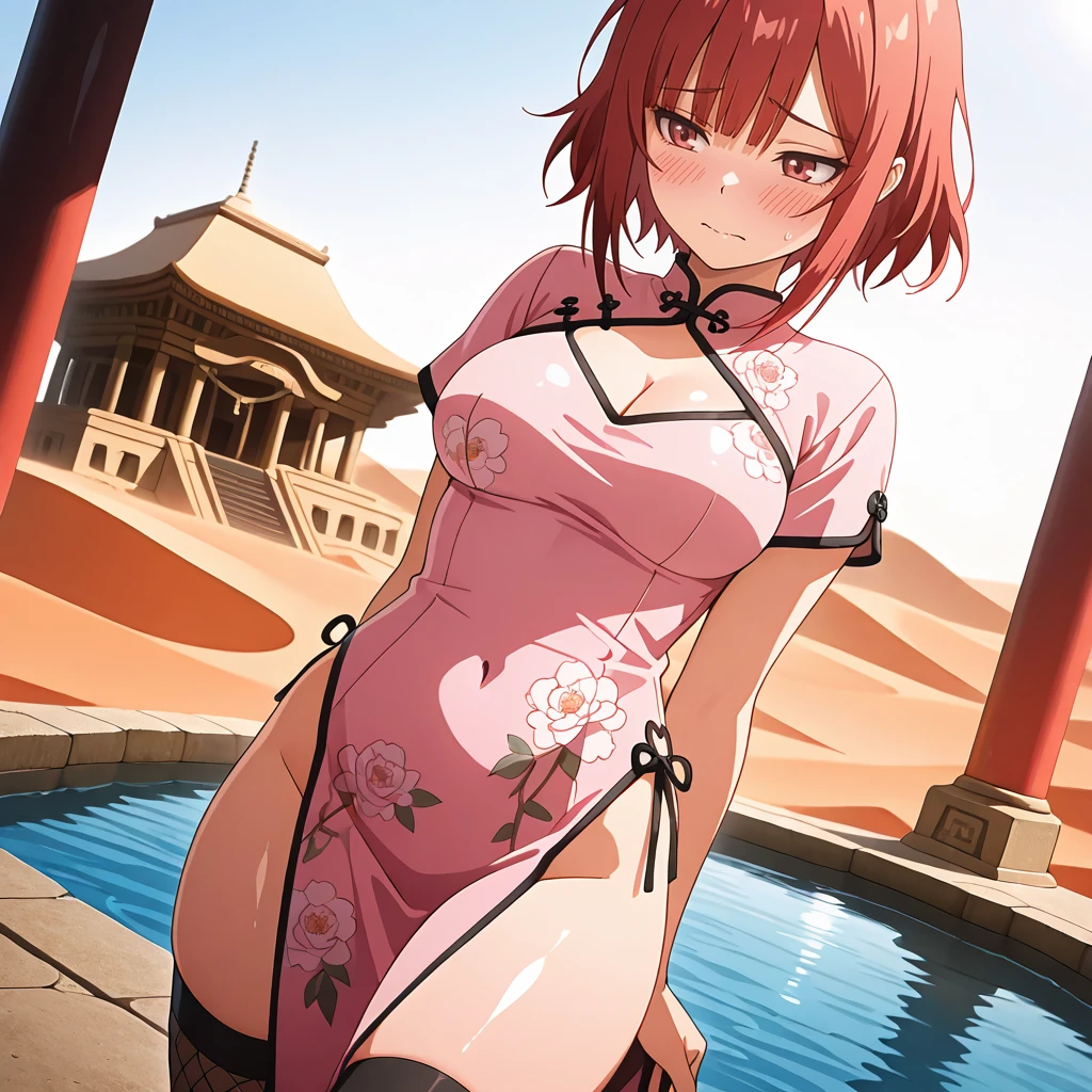mitsko, 1girl, short hair, red hair, blunt bangs, red eyes, white shirt, cleavage, sleeves past elbows, long black pencil skirt, black pantyhose, black heels