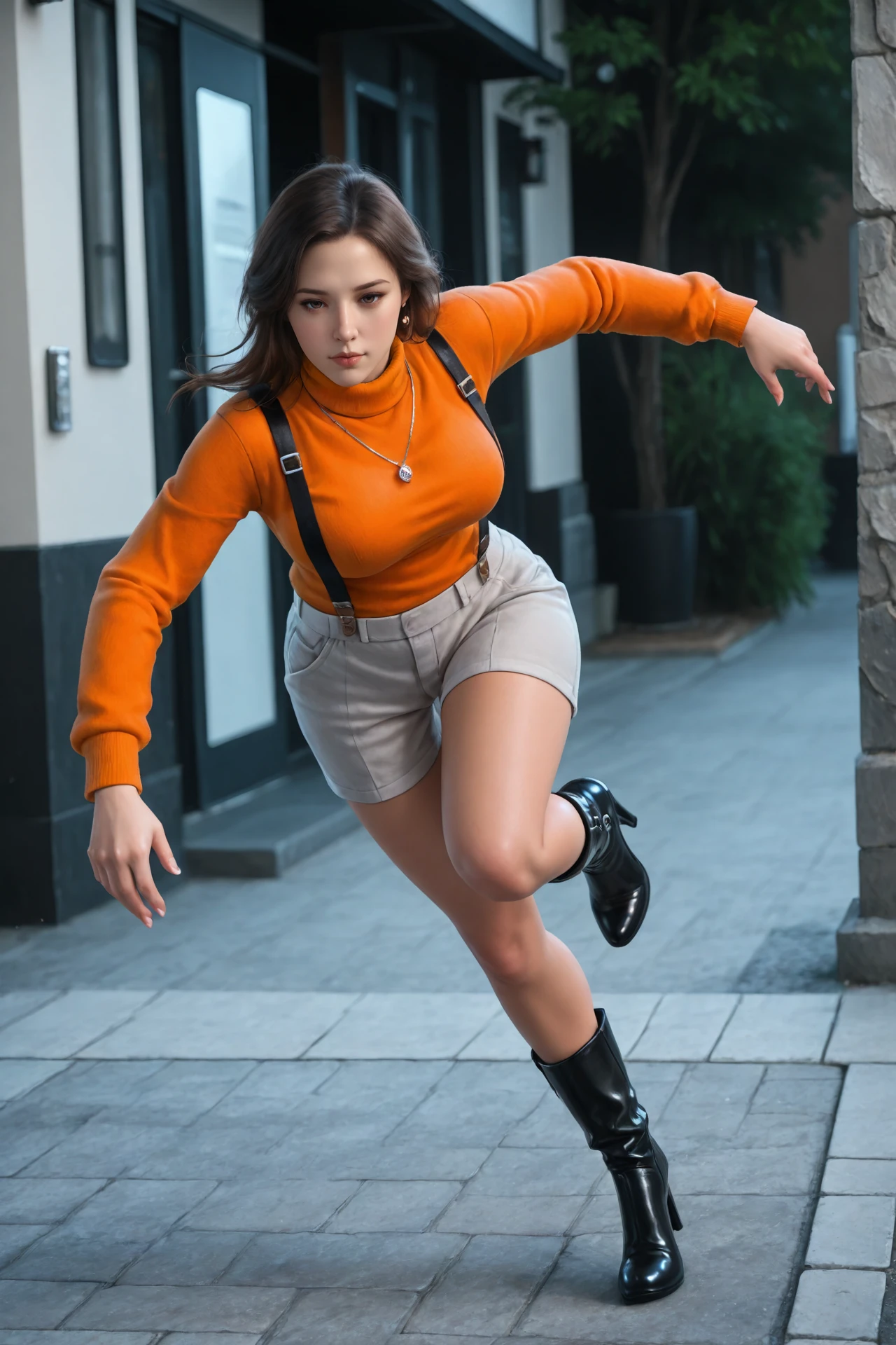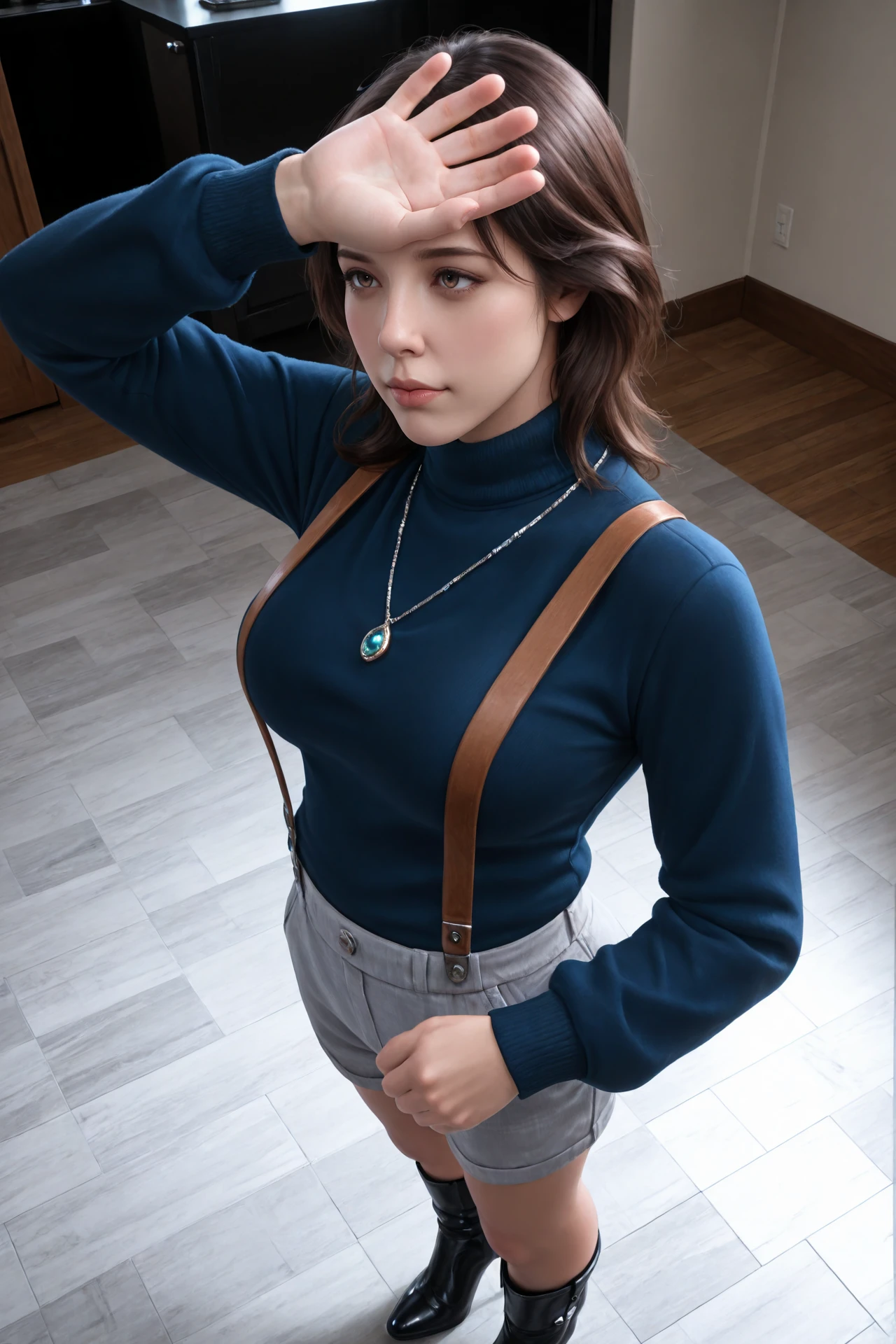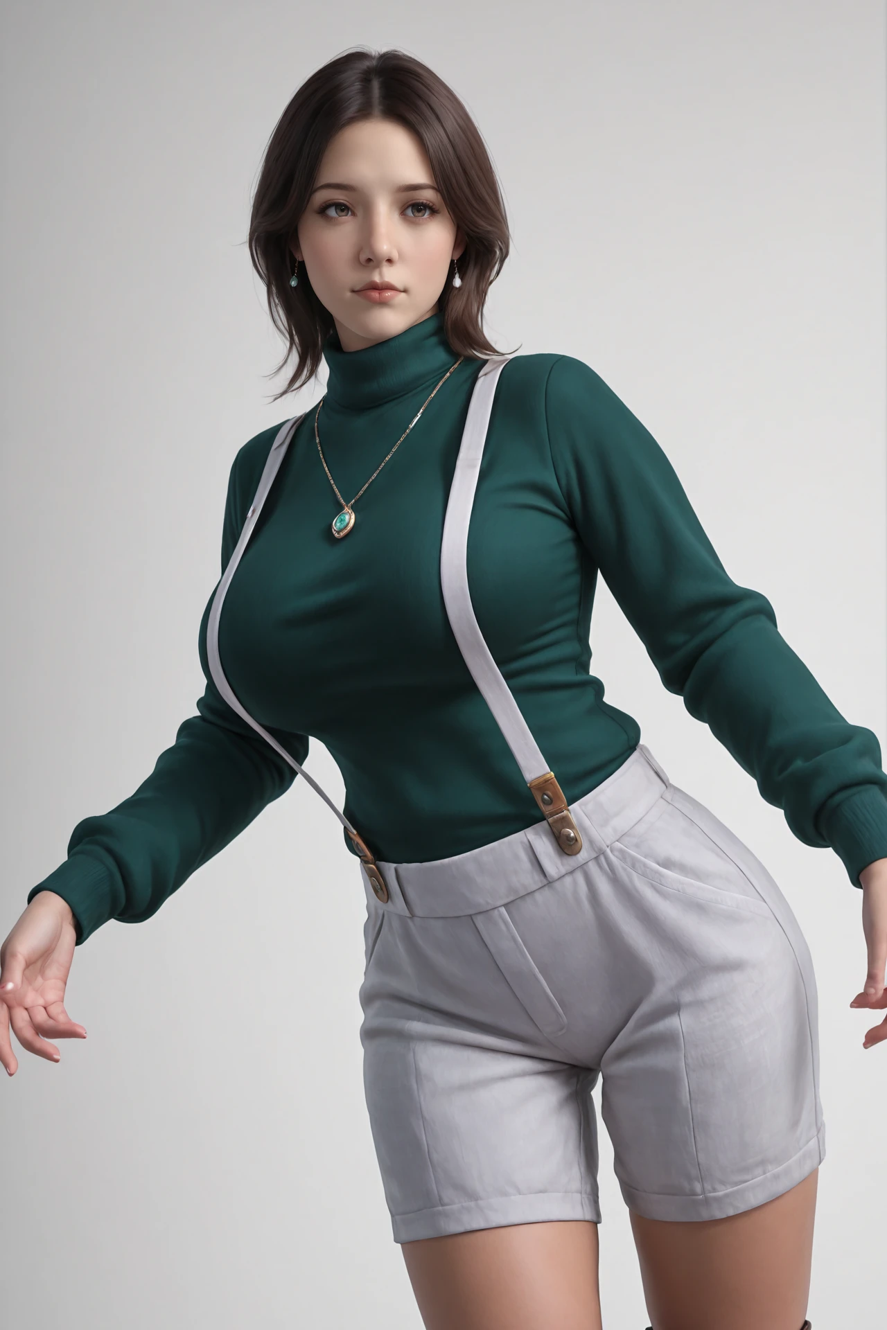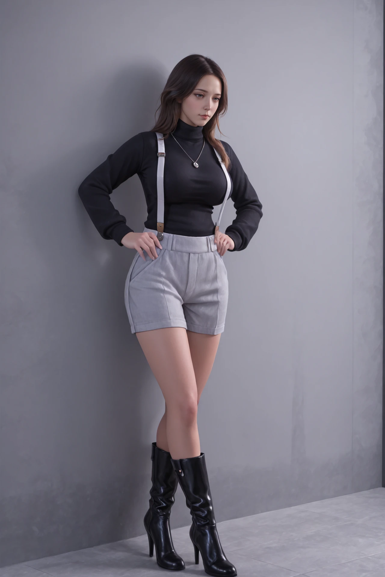 jewelry,necklace,turtleneck, suspenders,long sleeves,black sweater,short shorts,boots,high_heels, large_breasts,
