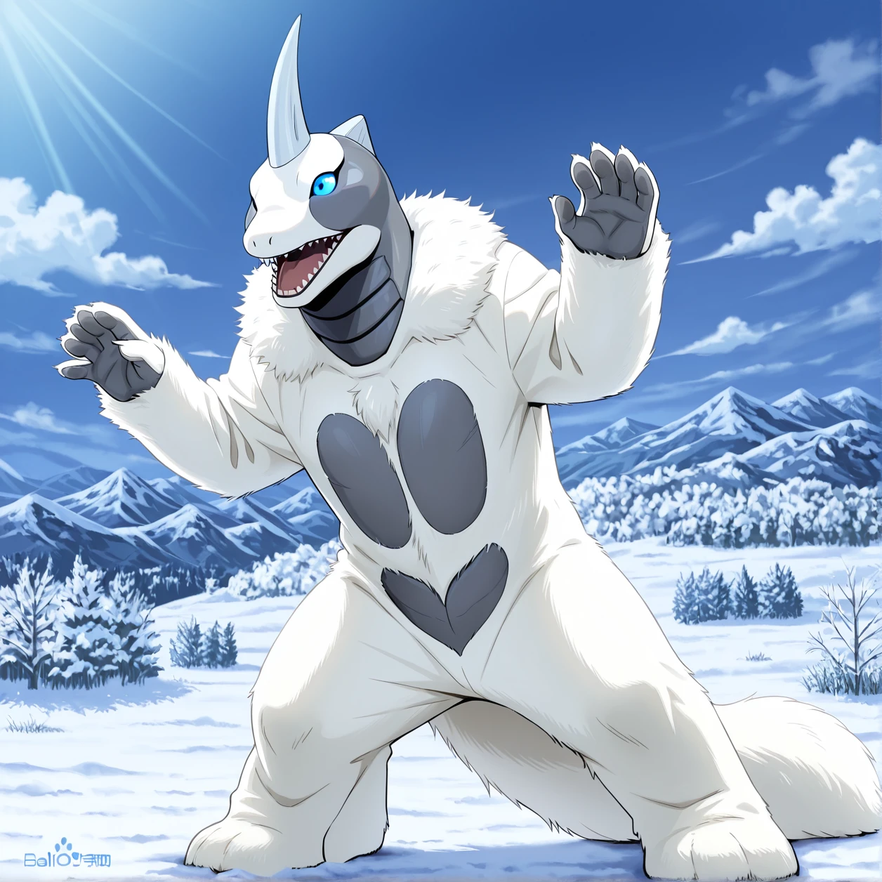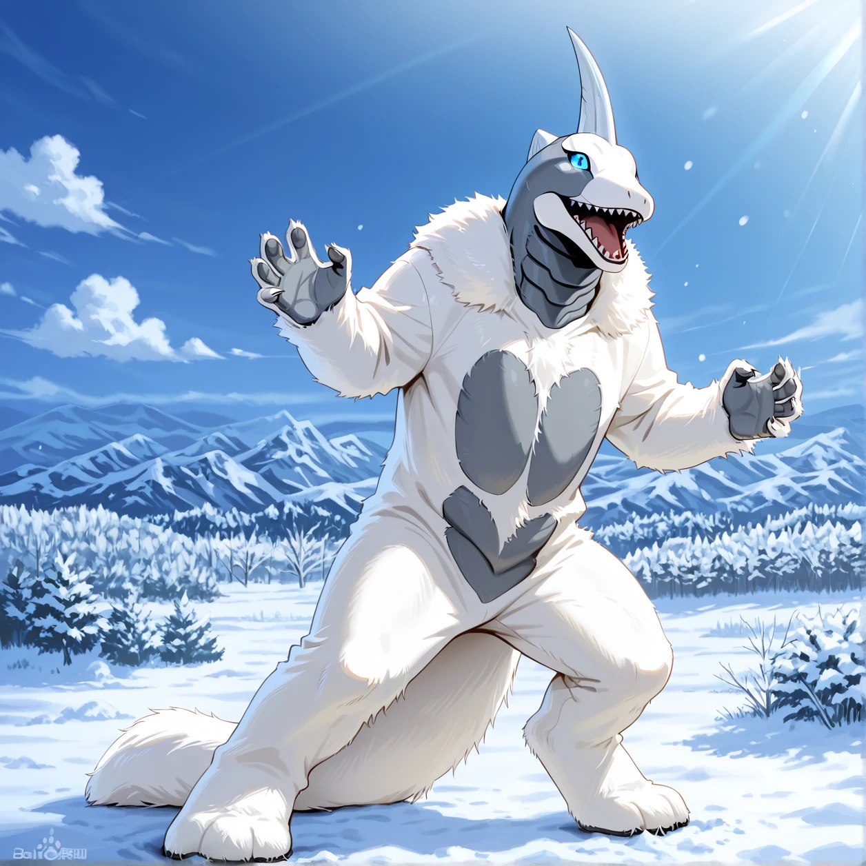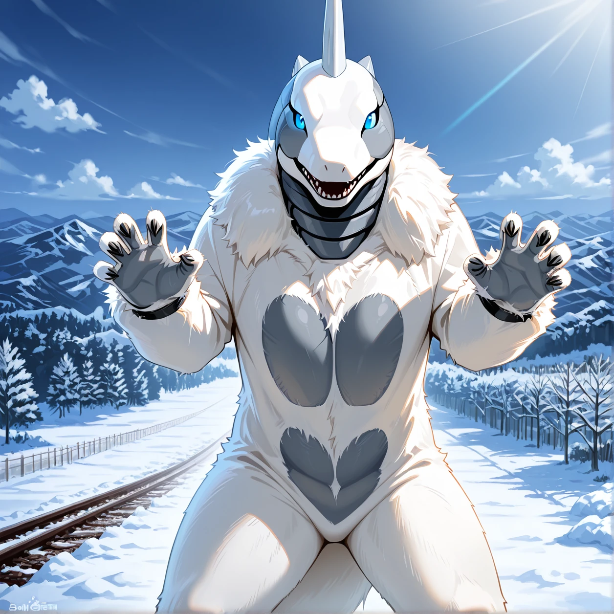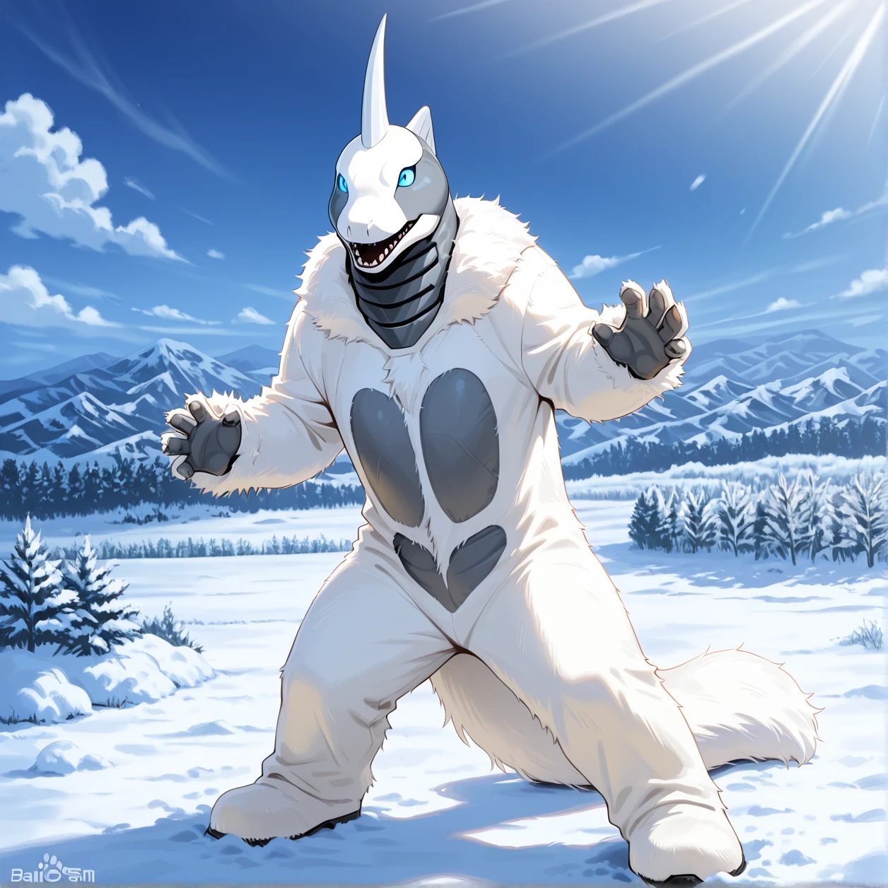 Snowgon,kaiju,grey horn,white fur,grey body,white body,two tone body,blue eyes,tail