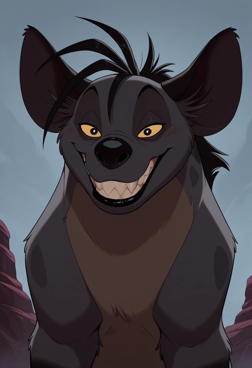 shenzi, hyena, yellow eyes, yellow sclera, black pupils, grey fur, black hair, sharp teeth, fangs