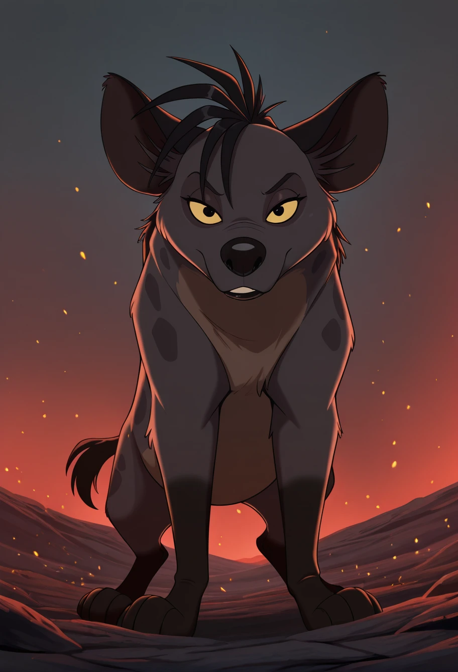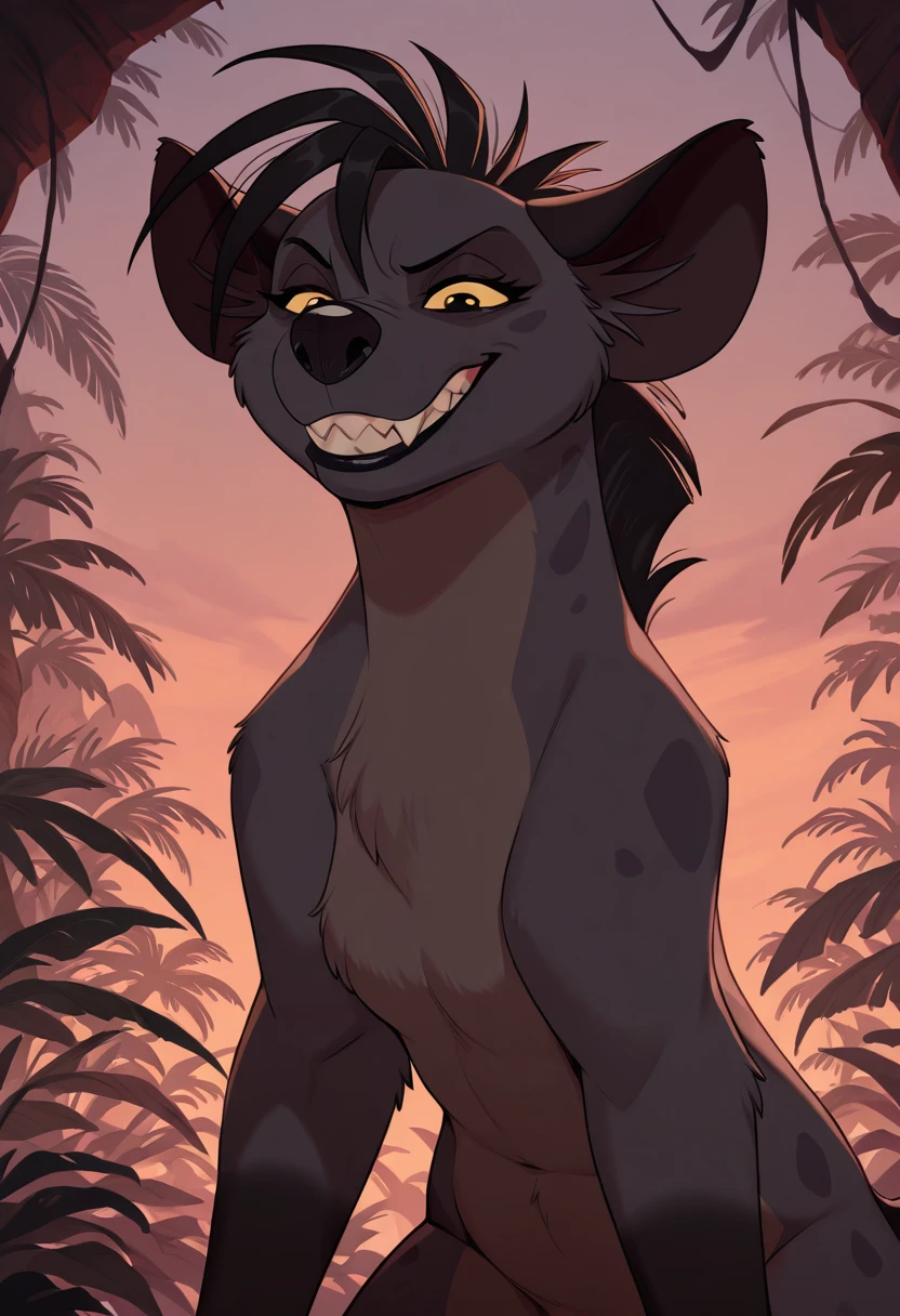 Main prompts: shenzi, hyena, yellow eyes, yellow sclera, black pupils, grey fur, black hair, sharp teeth, fangs