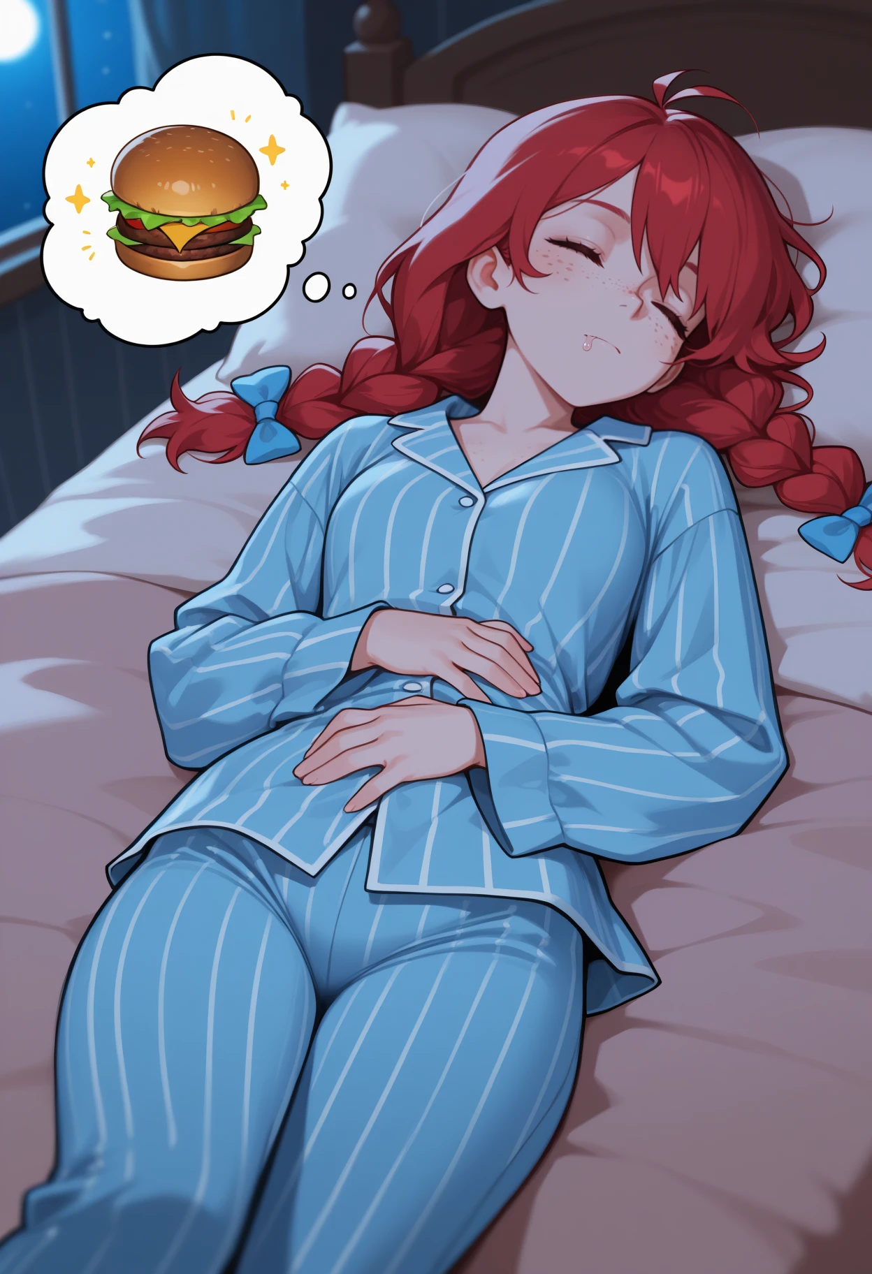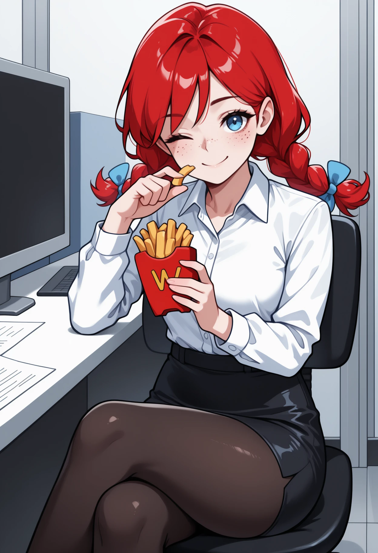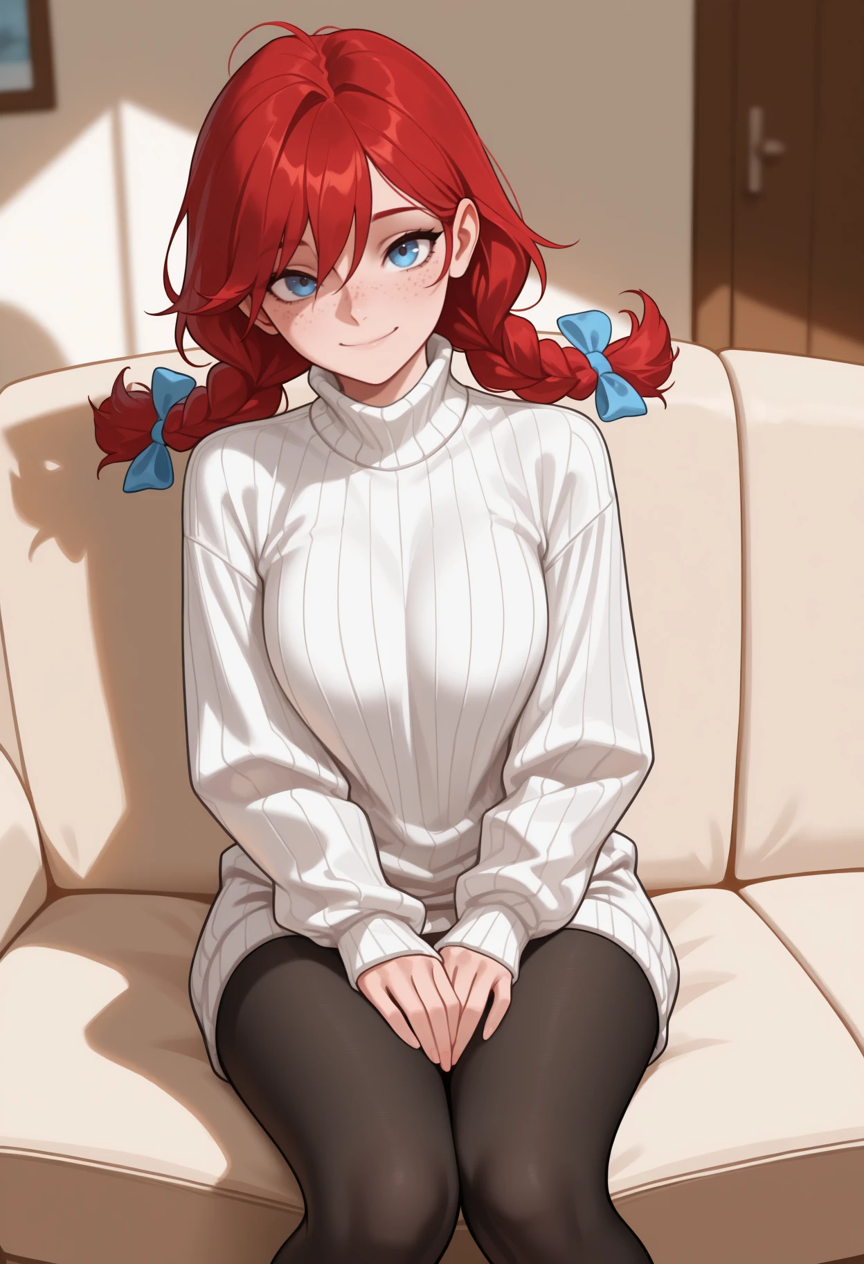Trigger + Appearance: w3ndys, freckles, long hair, red hair, low twin braids, hair bow, blue bow, blue eyes