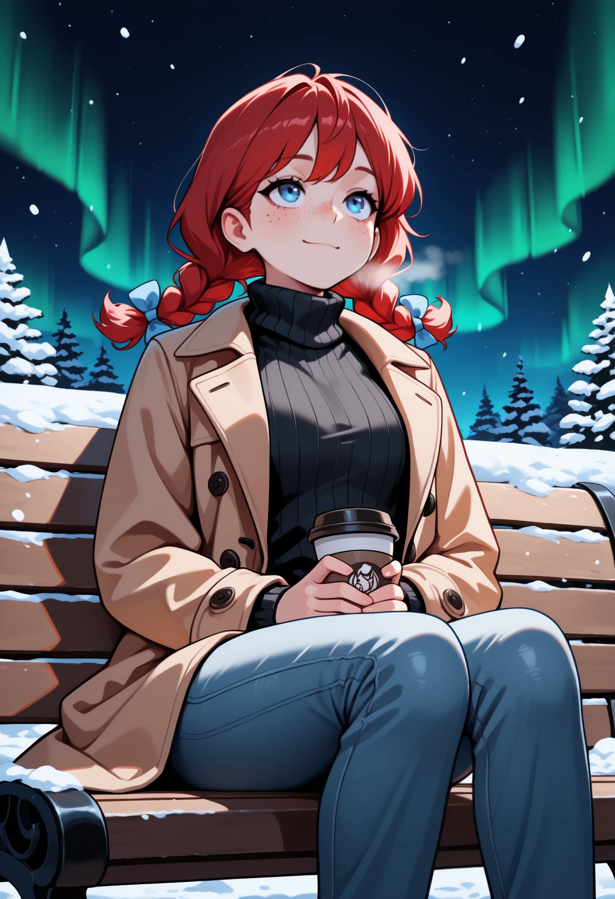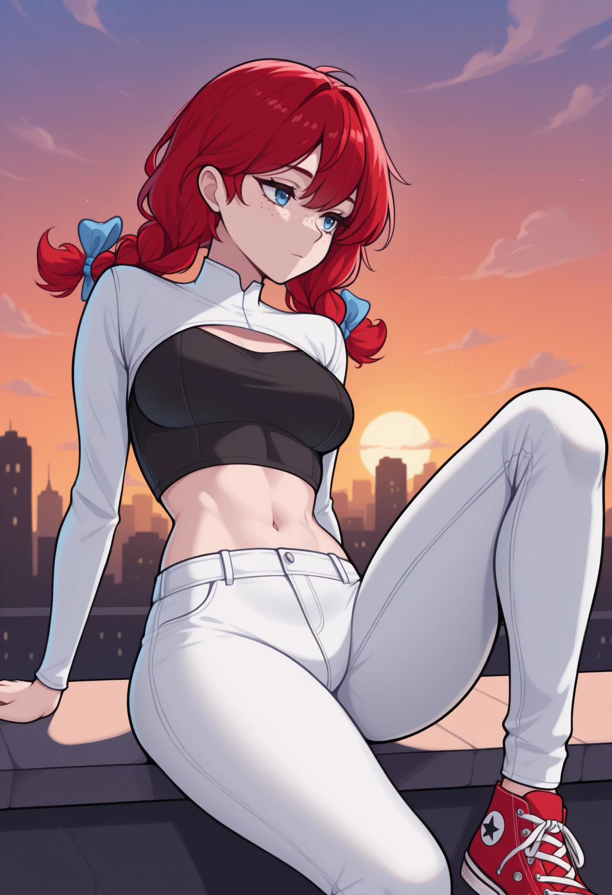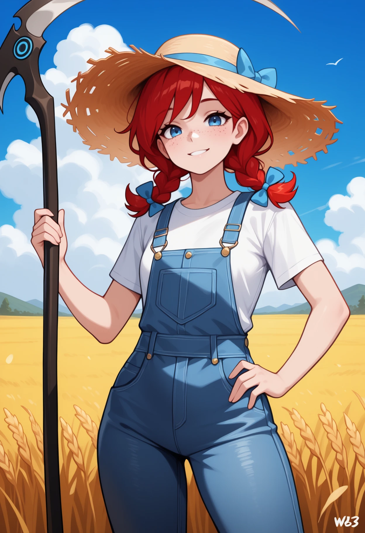 Trigger + Appearance: w3ndys, freckles, long hair, red hair, low twin braids, hair bow, blue bow, blue eyes