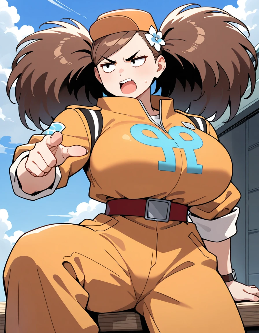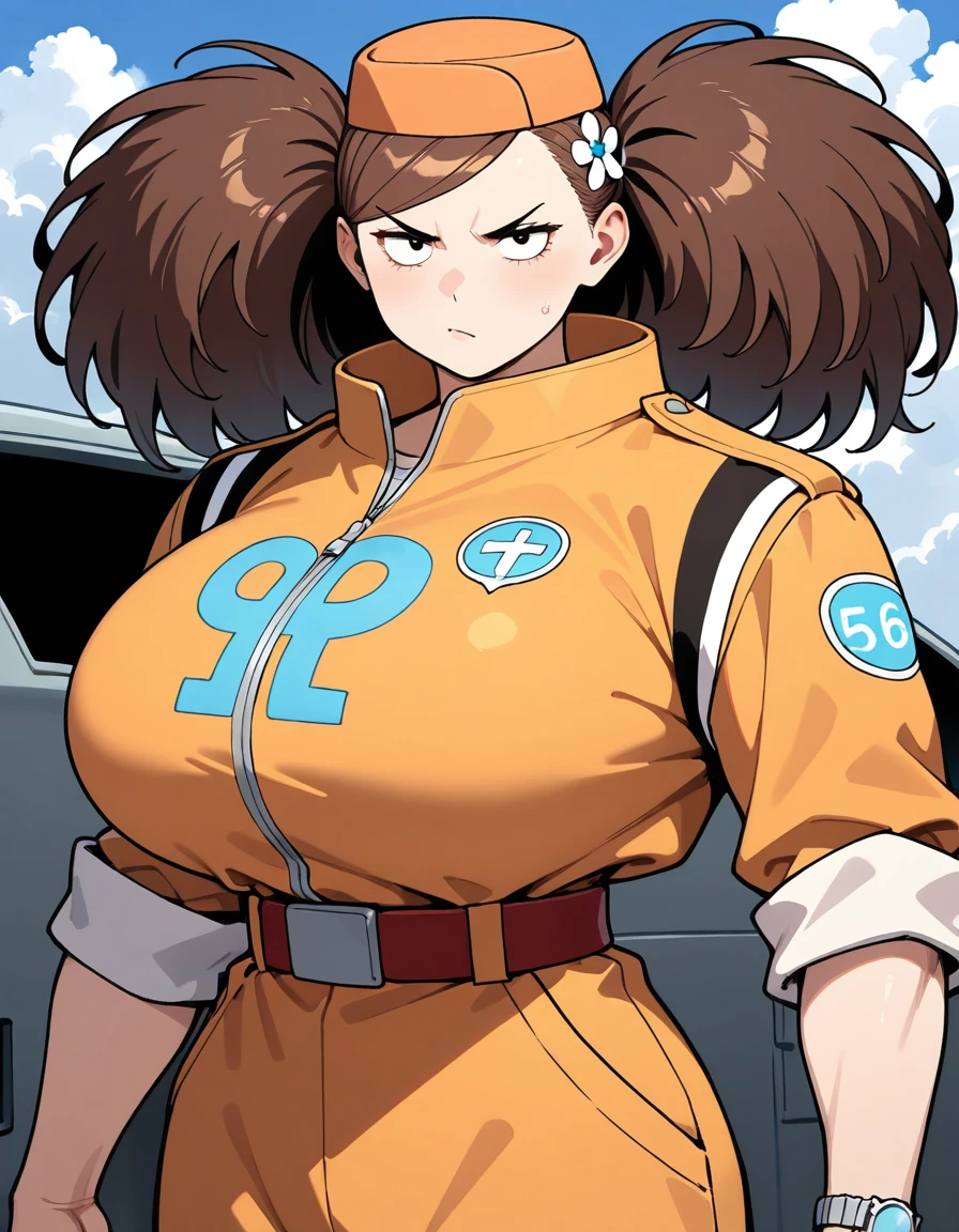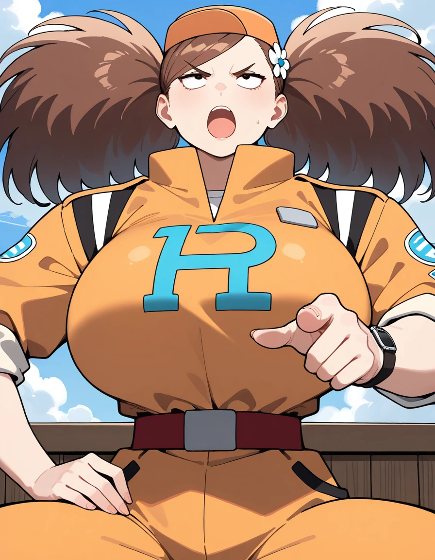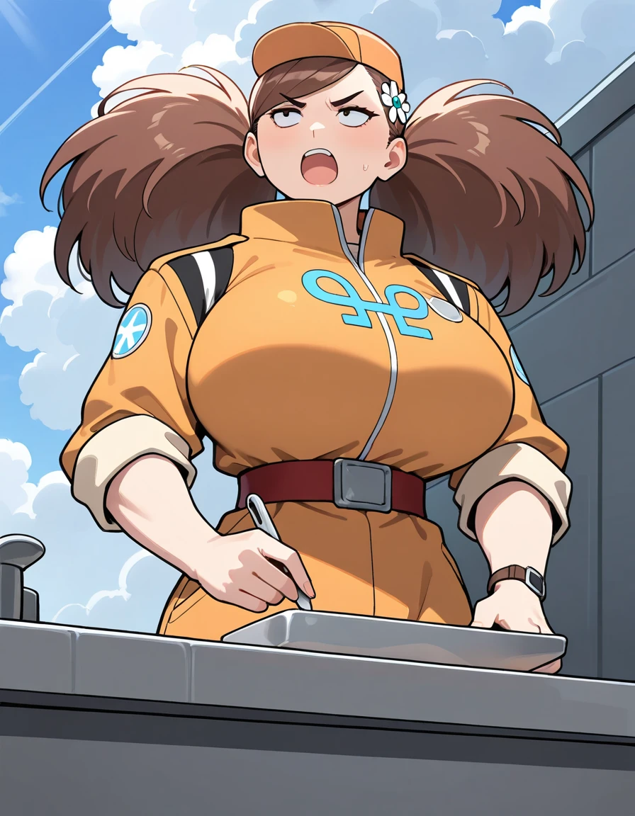 (turn-a-anan), (mature female, sanpaku, small eyes, eyelashes, v-shaped eyebrows, brown hair, twintails, big hair, swept bangs, hair flower, huge breasts, narrow waist), (orange cap, orange jumpsuit, clothes writing, sleeves rolled up, red belt, wristwatch, white sneakers)