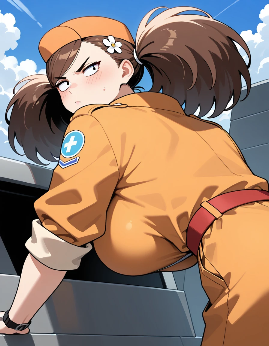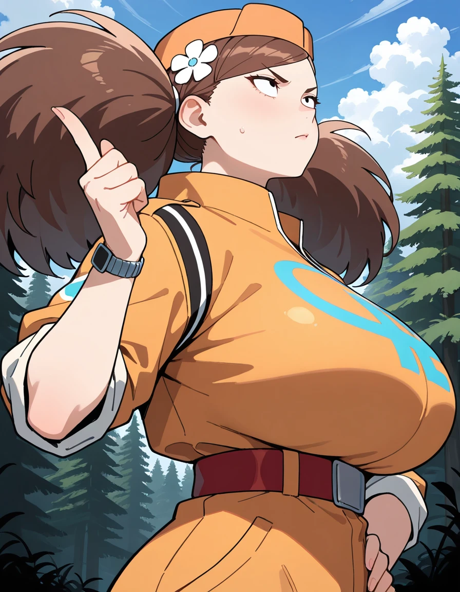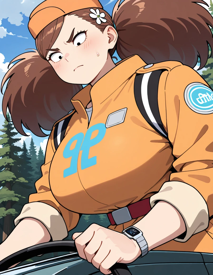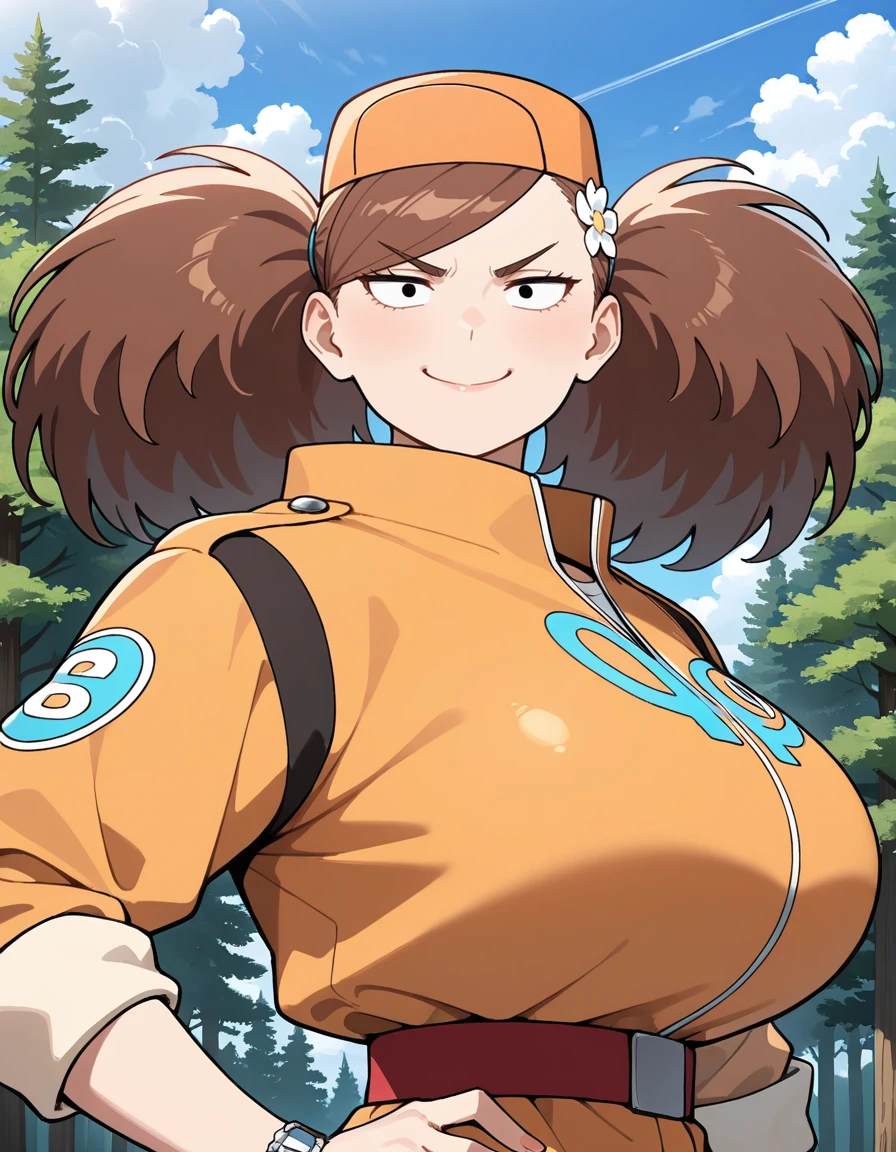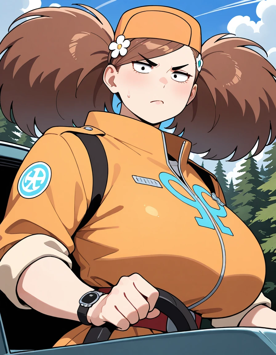(turn-a-anan), (mature female, sanpaku, small eyes, eyelashes, v-shaped eyebrows, brown hair, twintails, big hair, swept bangs, hair flower, huge breasts, narrow waist), (orange cap, orange jumpsuit, clothes writing, sleeves rolled up, red belt, wristwatch, white sneakers)