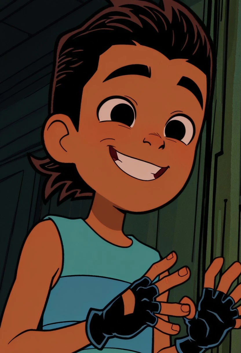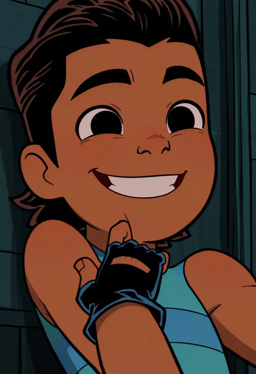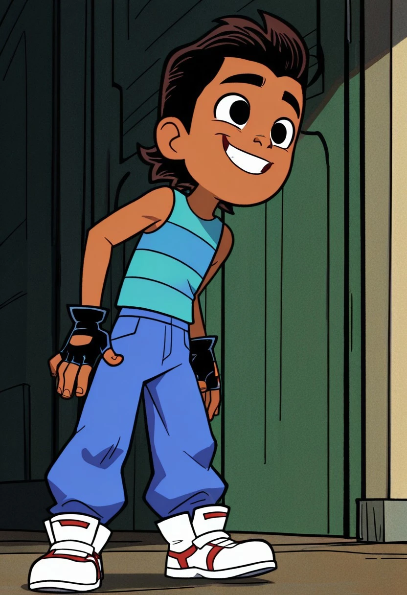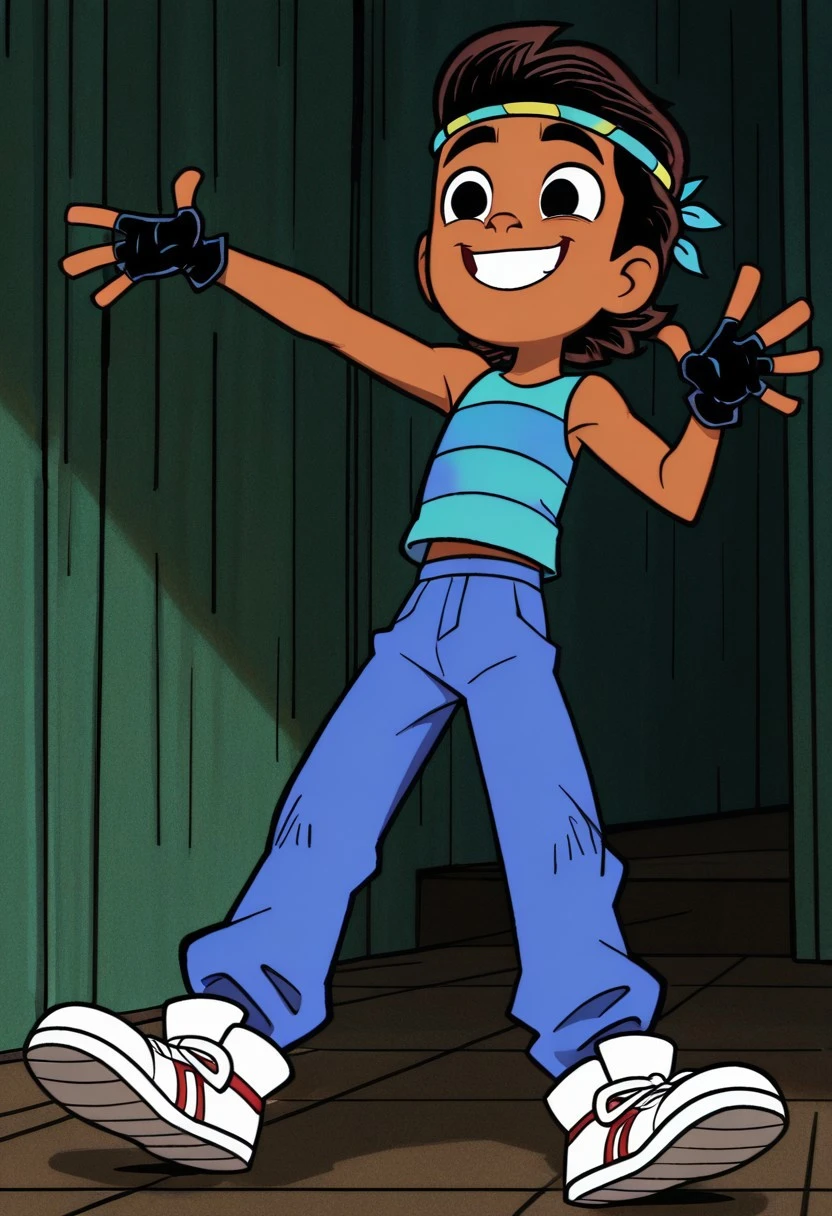 1980 Party Outfit: Eduardo mgdd, solo, 1boy, light brown skin, dark brown hair, black eyes, brown hair highlights, 1980 outfit, turquoise and blue striped sleeveless shirt, yellow and turquoise bandada, fingerless gloves, blue pants, white and red shoes