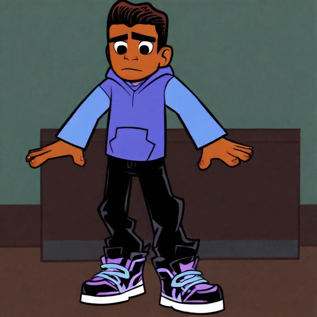 Prompt: Eduardo mgdd, solo, 1boy, light brown skin, dark brown hair, black eyes, brown hair highlights, blue hoodie with light blue sleeves, black pants, multicolored shoes