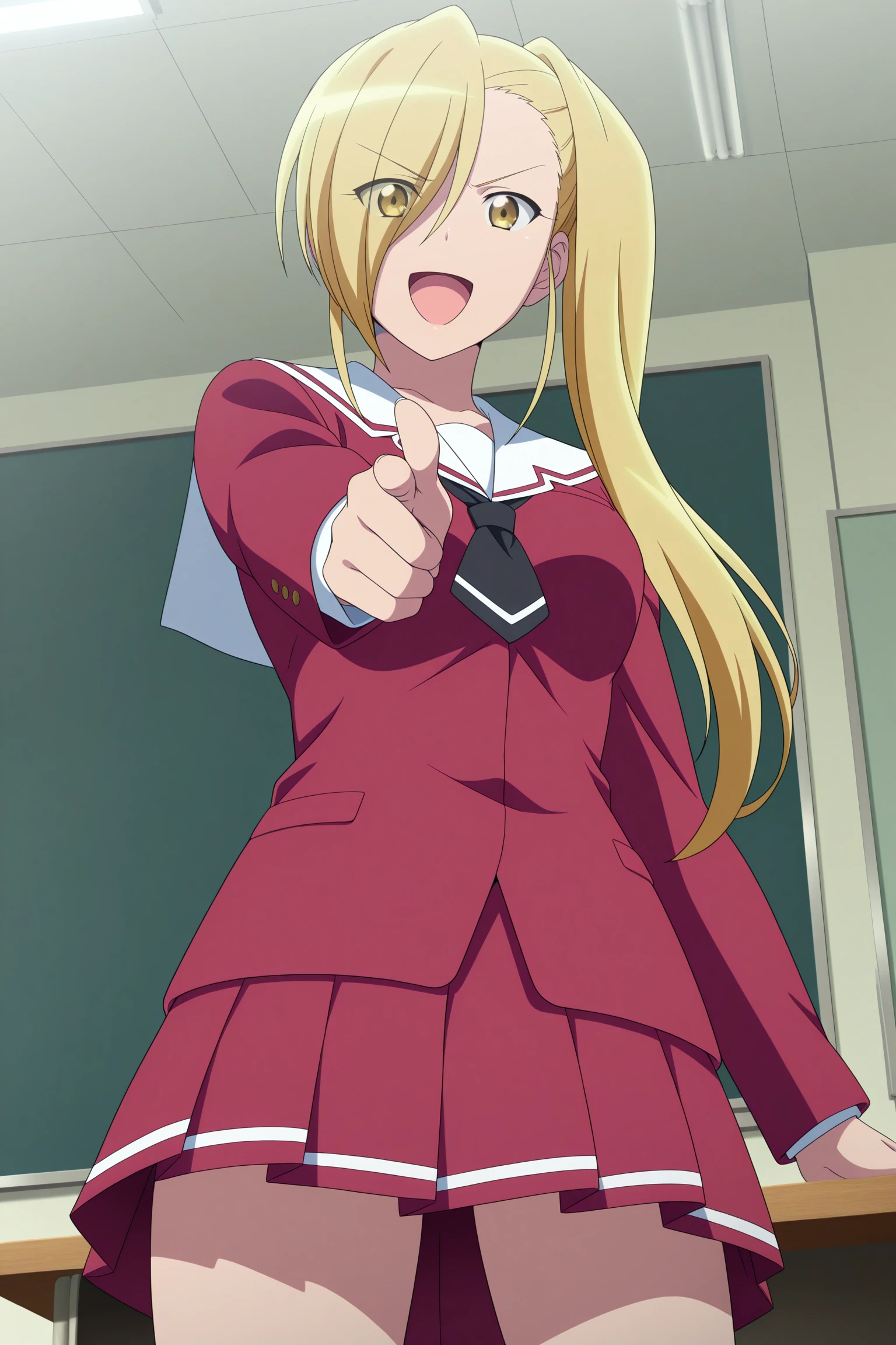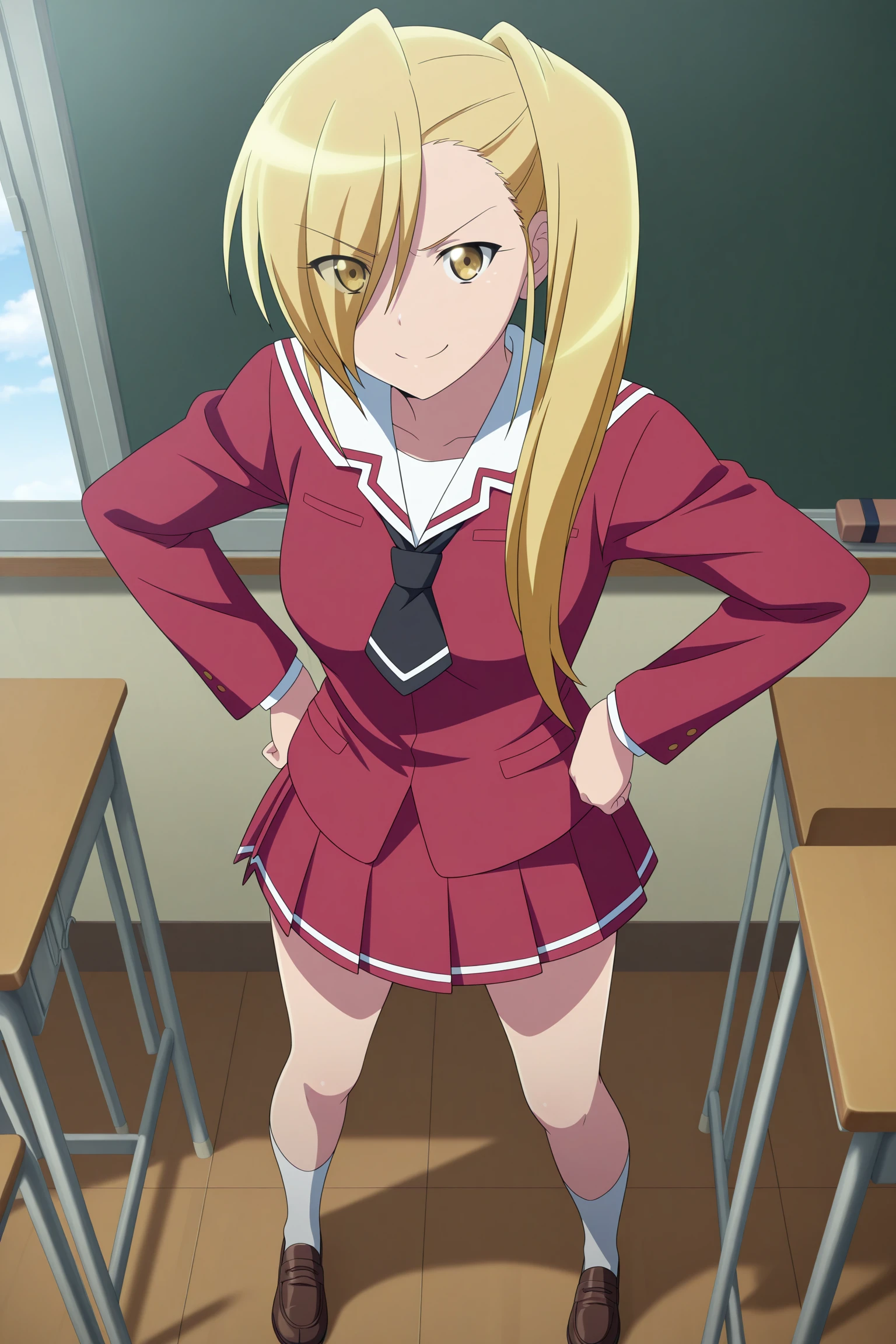 uehara kana, long hair, blonde hair, side ponytail, sidelocks, asymmetrical bangs, hair over one eye, eyes visible through hair, yellow eyes, long sleeves, red jacket, white shirt, white sailor collar, black necktie, short necktie, red skirt, pleated skirt, striped skirt, white socks, kneehighs, brown footwear, loafers