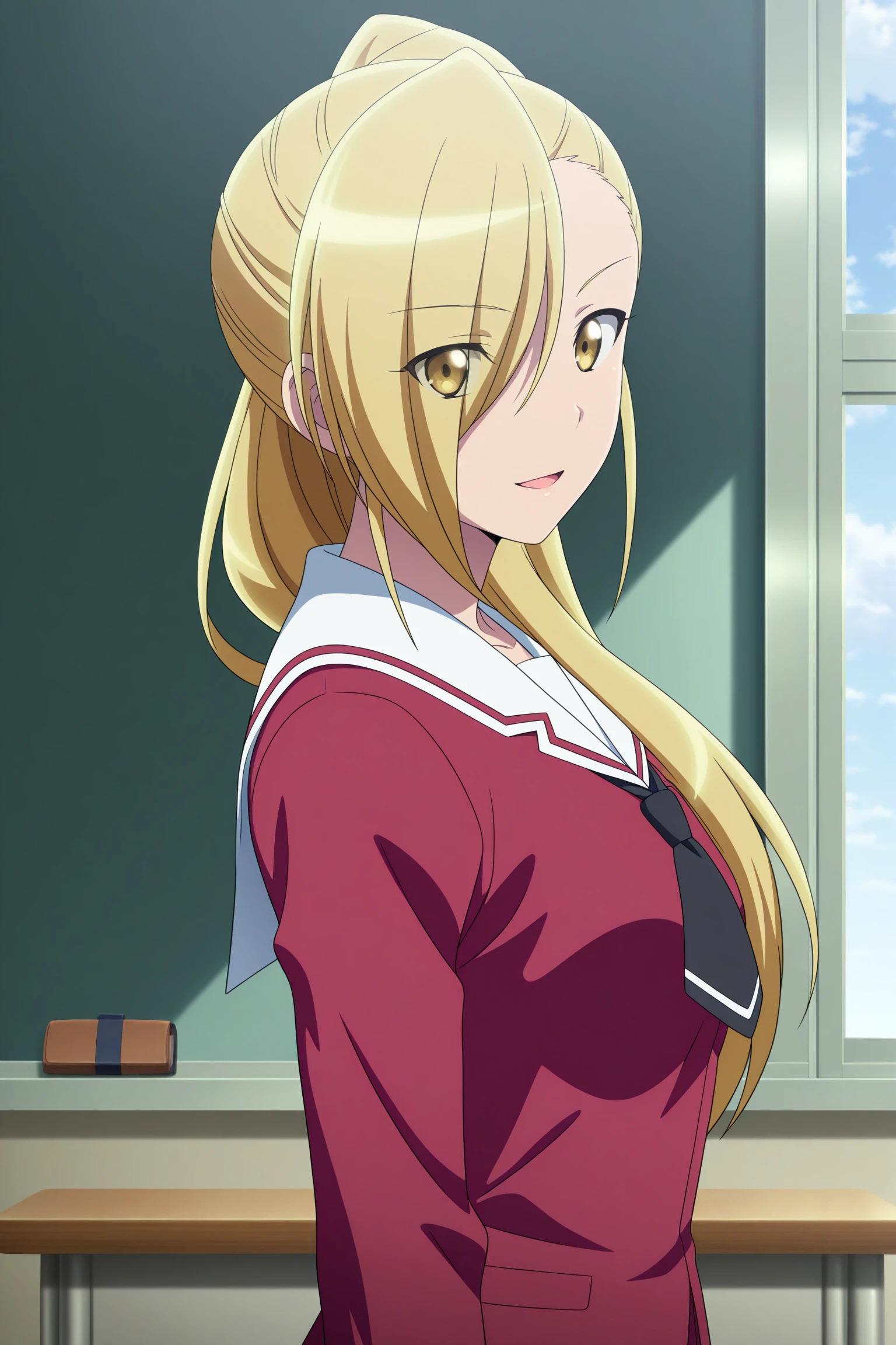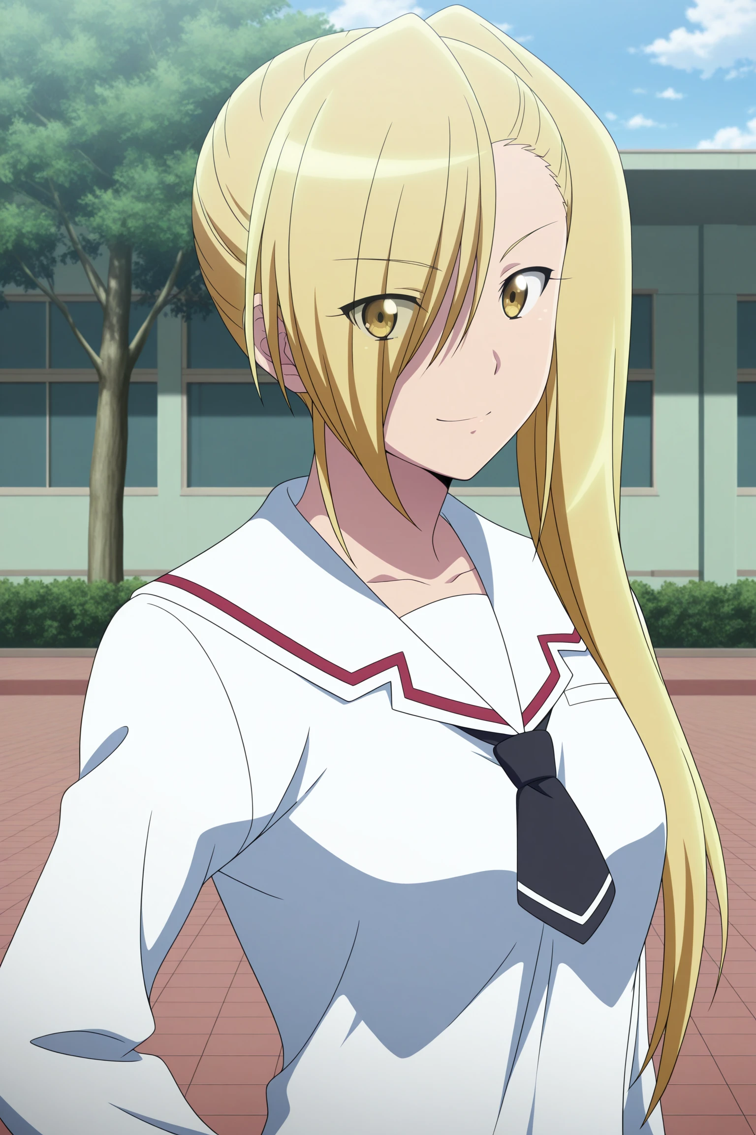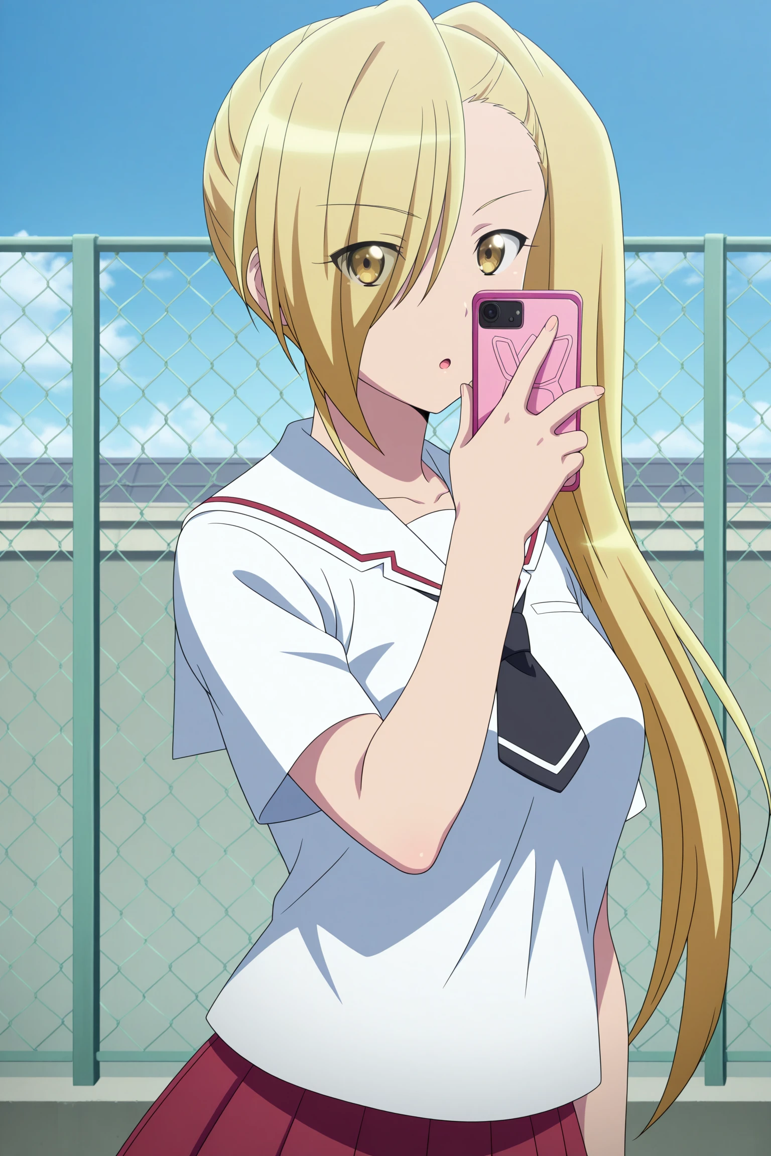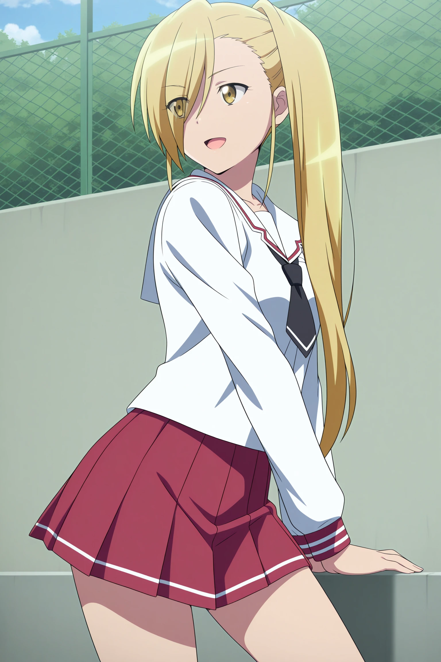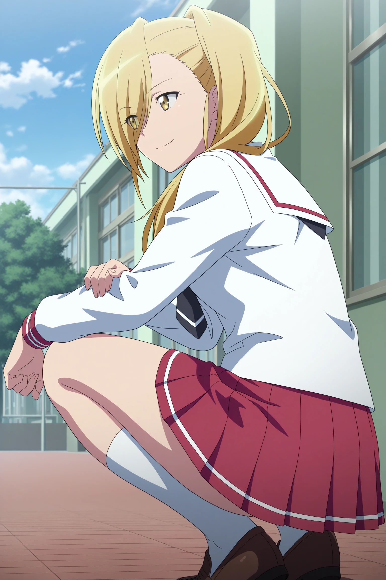 uehara kana, long hair, blonde hair, side ponytail, sidelocks, asymmetrical bangs, hair over one eye, eyes visible through hair, yellow eyes, long sleeves, white shirt, white sailor collar, black necktie, short necktie, red skirt, pleated skirt, striped skirt, white socks, kneehighs, brown footwear, loafersSchool Uniform (Summer)