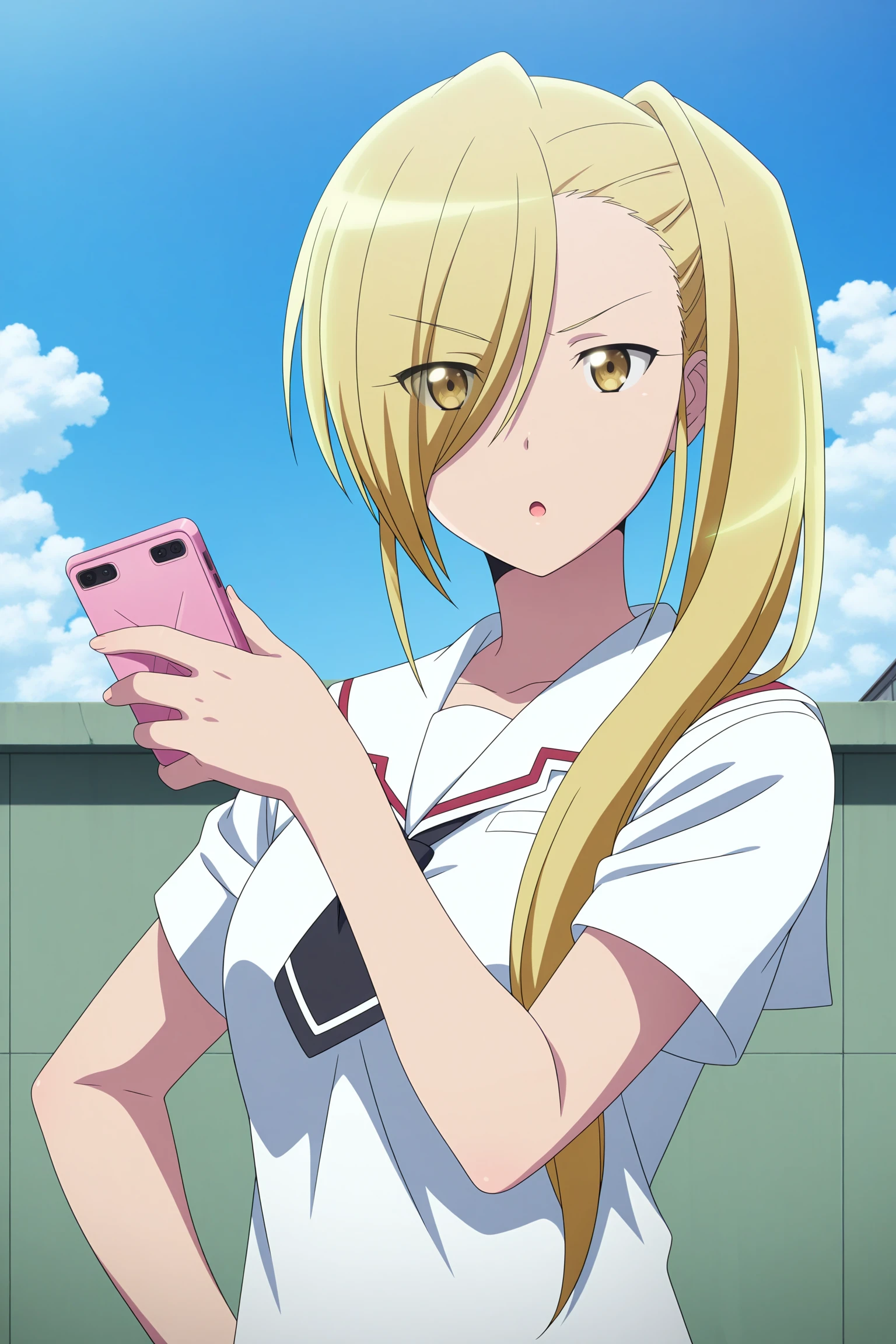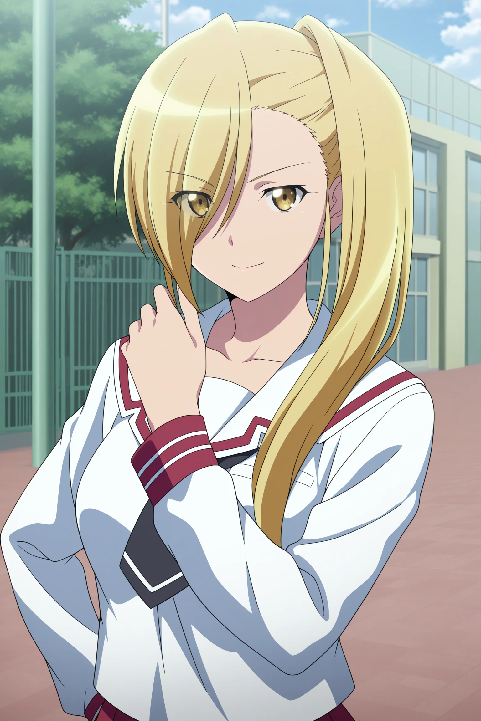 uehara kana, long hair, blonde hair, side ponytail, sidelocks, asymmetrical bangs, hair over one eye, eyes visible through hair, yellow eyes, short sleeves, white shirt, white sailor collar, black necktie, short necktie, red skirt, pleated skirt, striped skirt, white socks, kneehighs, brown footwear, loafersDescription