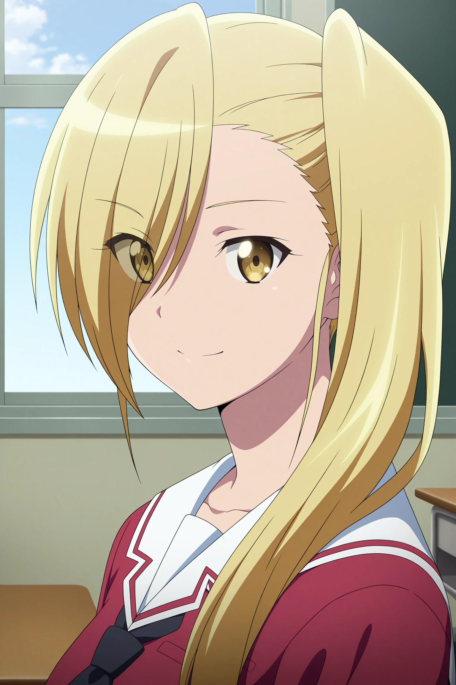uehara kana, long hair, blonde hair, side ponytail, sidelocks, asymmetrical bangs, hair over one eye, eyes visible through hair, yellow eyes, long sleeves, red jacket, white shirt, white sailor collar, black necktie, short necktie, red skirt, pleated skirt, striped skirt, white socks, kneehighs, brown footwear, loafersSchool Uniform (Spring/Fall)